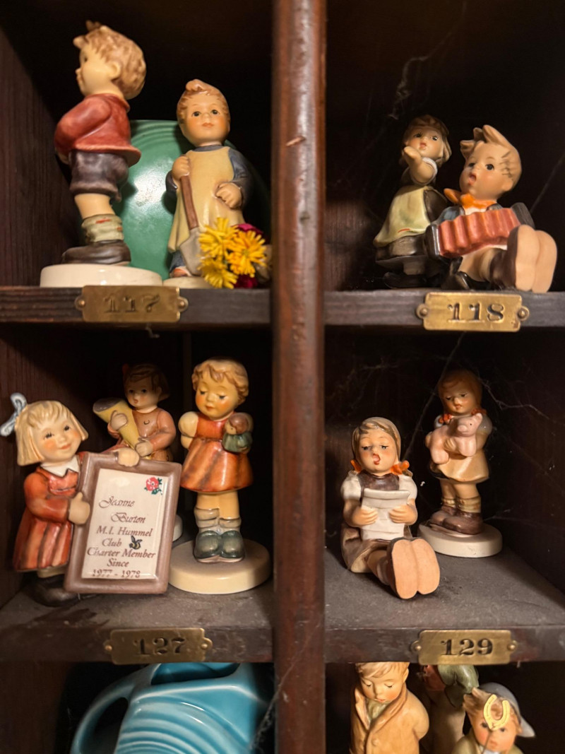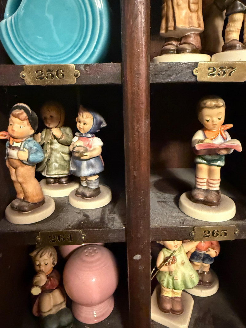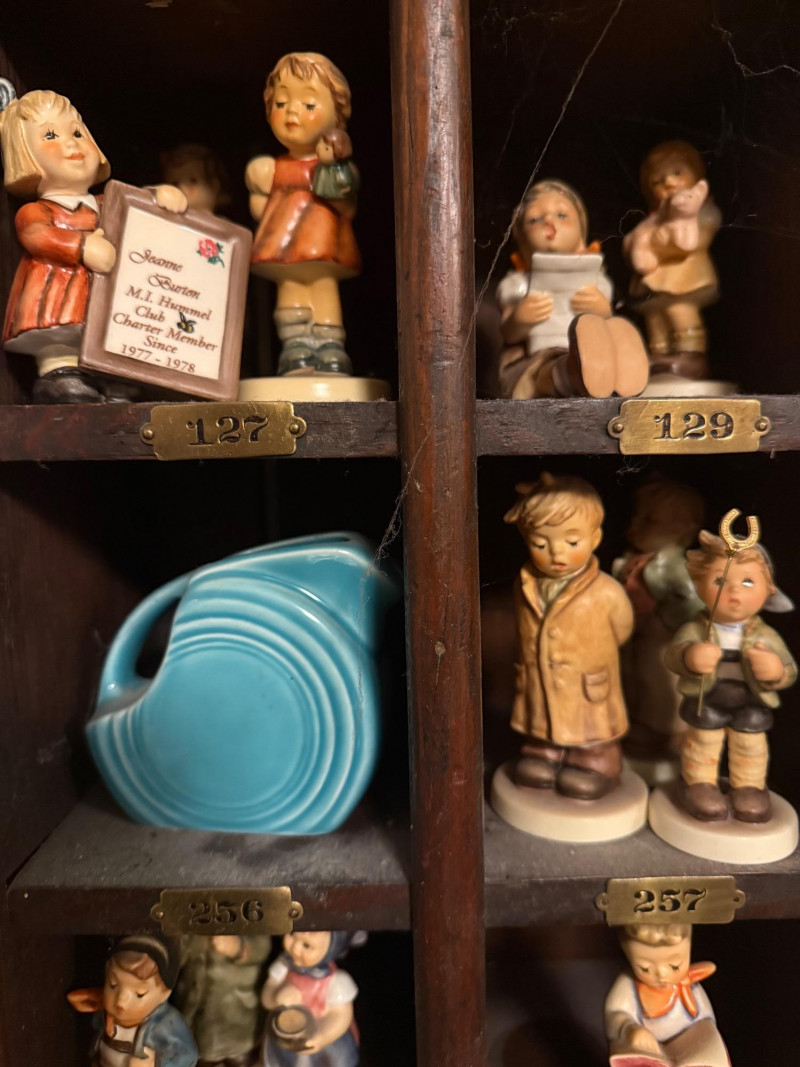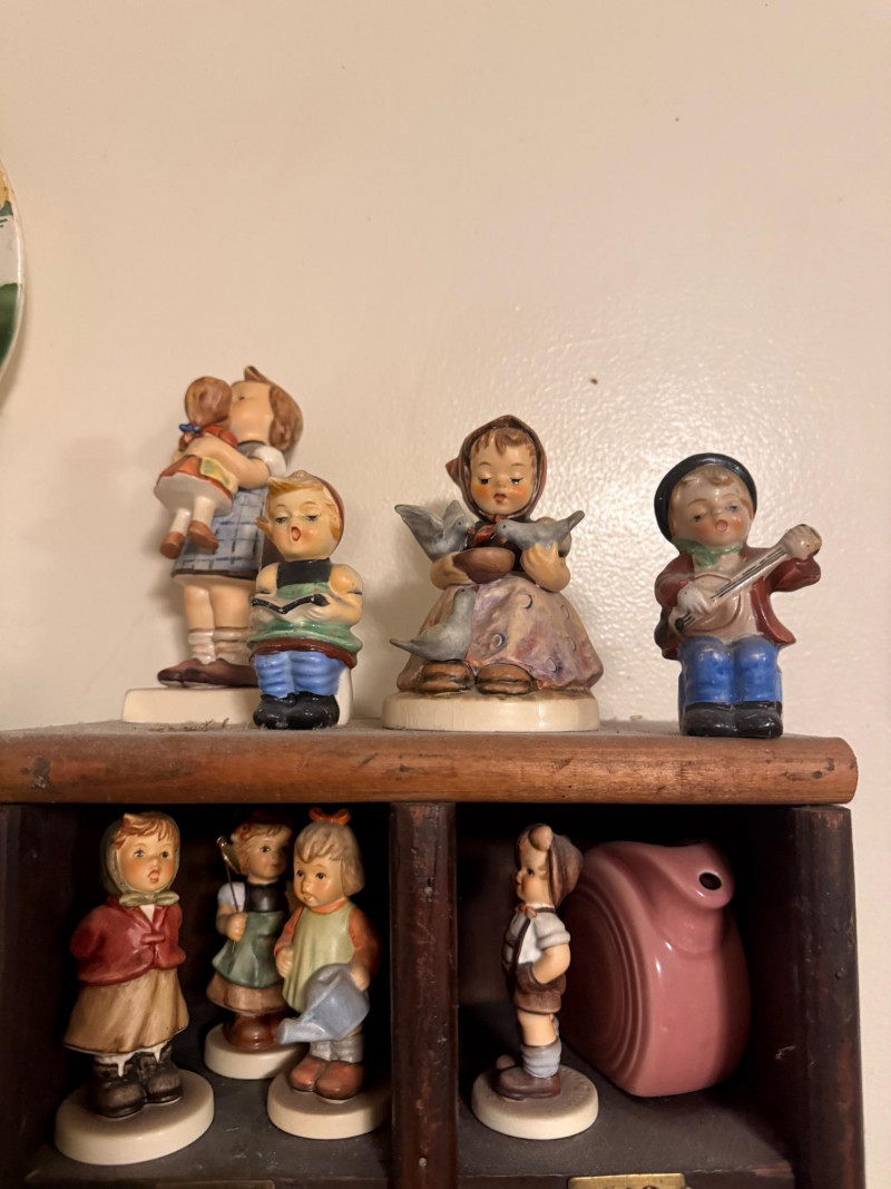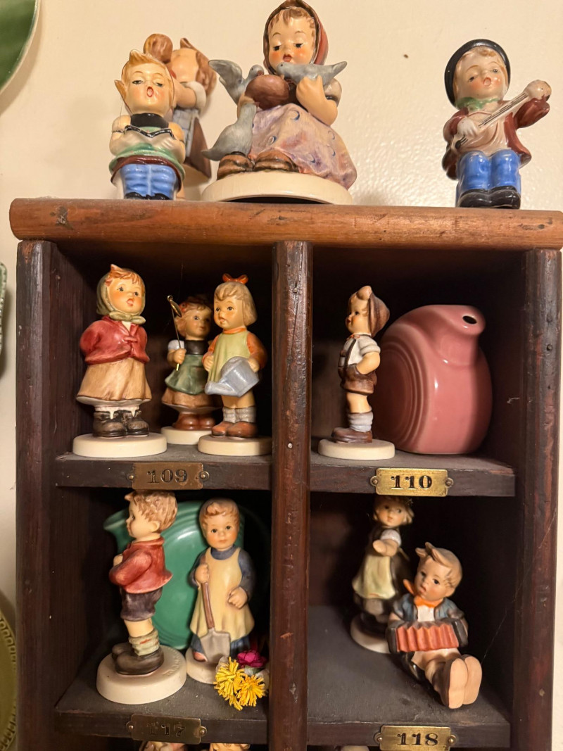 Vintage German Figurines in Functional Display Case A wood wall display cabinet containing a variety of Hummel figurines (3" to 5" tall) and assorted collectibles. The figurines are classic hand-painted German pieces, known for their nostalgic depictions of children and pastoral life. The cabinet provides functional storage and presentation, making this lot suitable for collectors, resellers, or anyone seeking to add vintage charm to their décor.