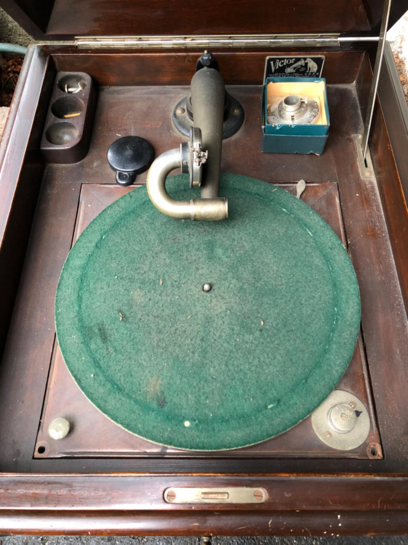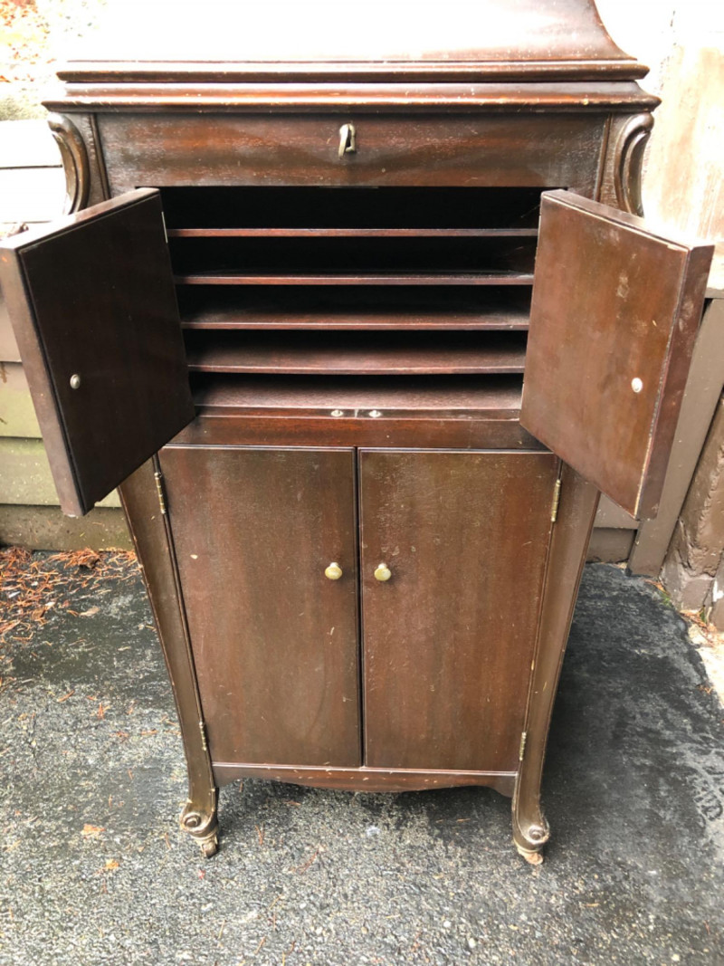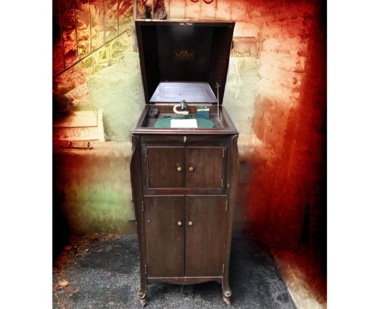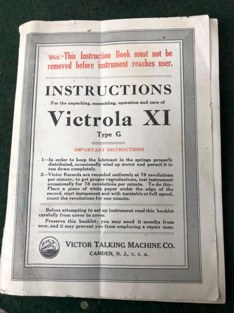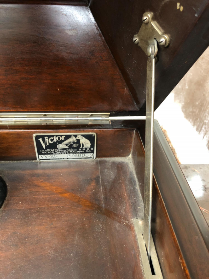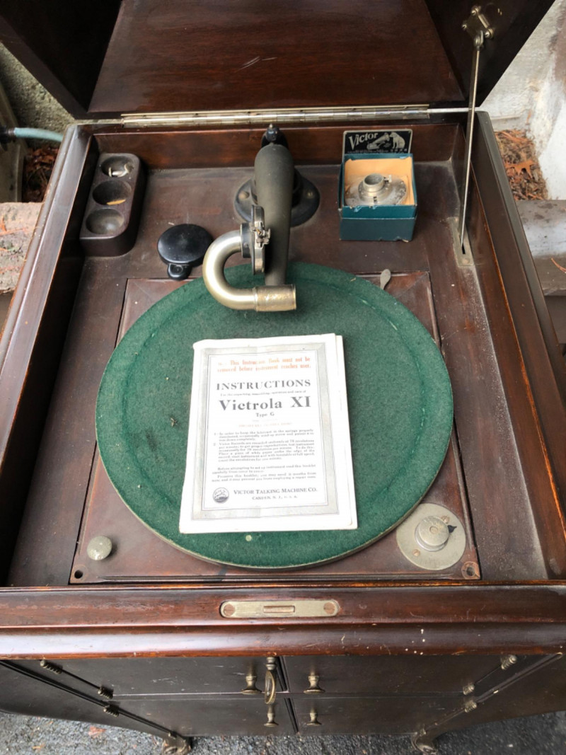 Antique Console-Style Gramophone, 1910–1921 An authentic Victrola XI Type 6 phonograph, serial number 276905G, manufactured by the Victor Talking Machine Company between 1910 and 1921. This console-style cabinet phonograph features a hand-crank motor, internal horn, and plays 78 rpm records with steel needles. The Victrola XI was one of Victor’s most popular models, prized for its elegant wood cabinetry and reliable double-spring motor. This piece represents a true antique in early audio history, blending craftsmanship with cultural significance. Ideal for collectors of phonographs, vintage furniture, or resellers seeking a centerpiece item with strong historical appeal. Condition: Untested; missing crank to wind machine. Some damage to feet, and water spots on lid (see pictures for cabinet condition). Other parts (such as needle) are unconfirmed including function of knobs. Includes 78 RPM records.