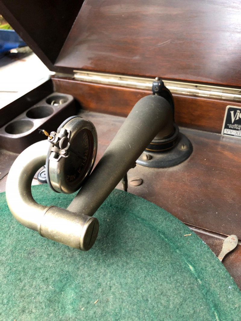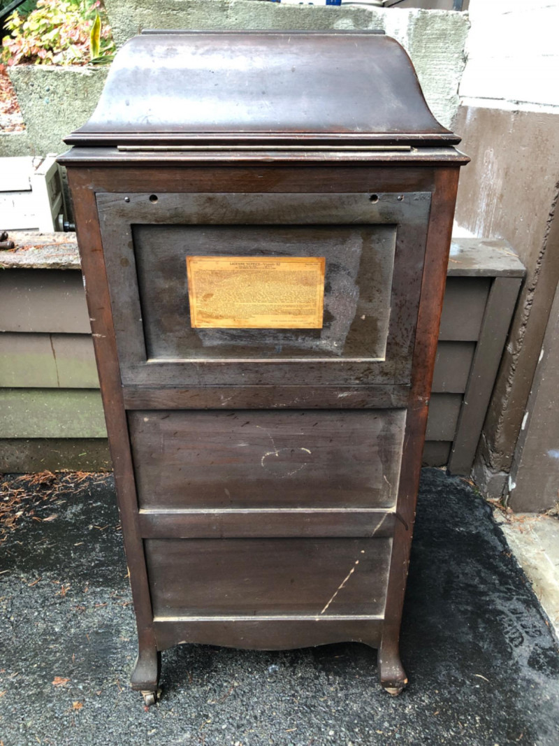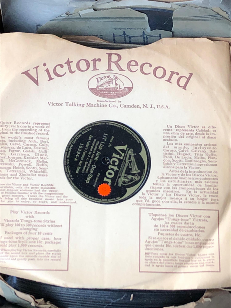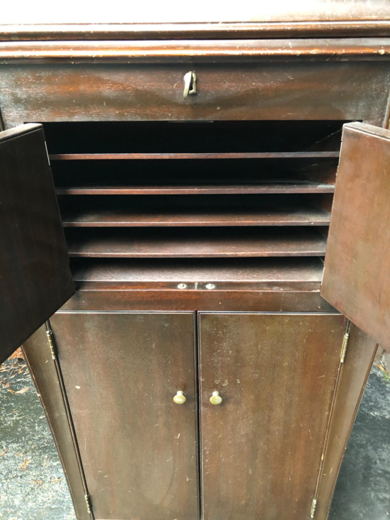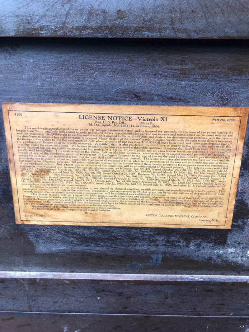 Antique Console-Style Gramophone, 1910–1921 An authentic Victrola XI Type 6 phonograph, serial number 276905G, manufactured by the Victor Talking Machine Company between 1910 and 1921. This console-style cabinet phonograph features a hand-crank motor, internal horn, and plays 78 rpm records with steel needles. The Victrola XI was one of Victor’s most popular models, prized for its elegant wood cabinetry and reliable double-spring motor. This piece represents a true antique in early audio history, blending craftsmanship with cultural significance. Ideal for collectors of phonographs, vintage furniture, or resellers seeking a centerpiece item with strong historical appeal. Condition: Untested; missing crank to wind machine. Some damage to feet, and water spots on lid (see pictures for cabinet condition). Other parts (such as needle) are unconfirmed including function of knobs. Includes 78 RPM records.