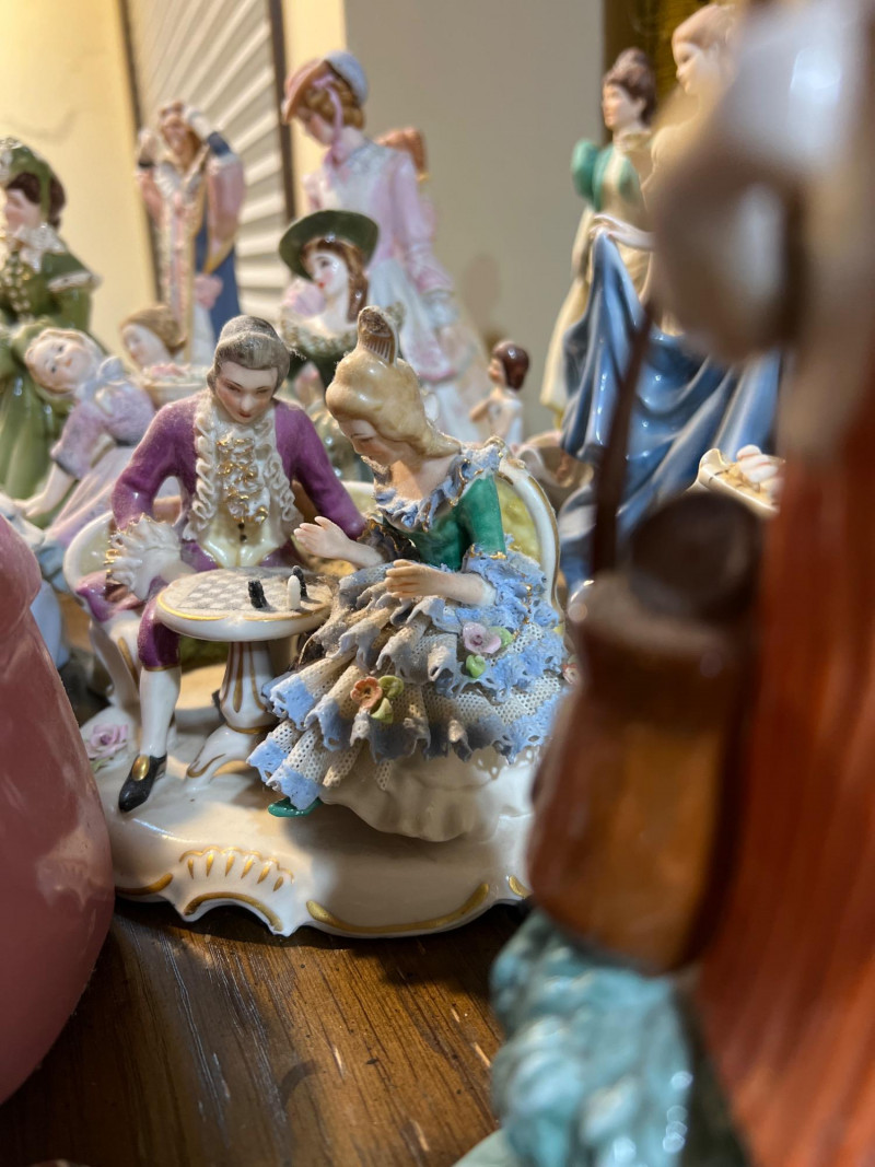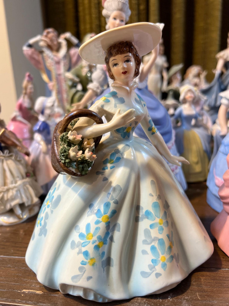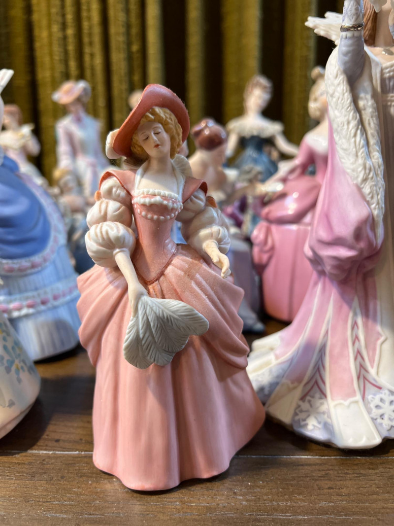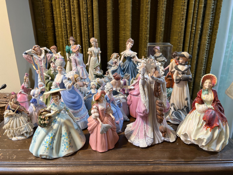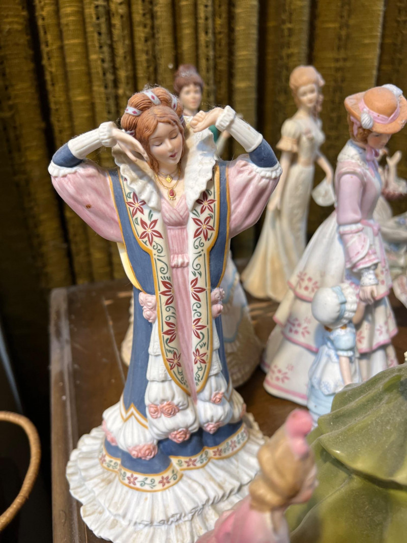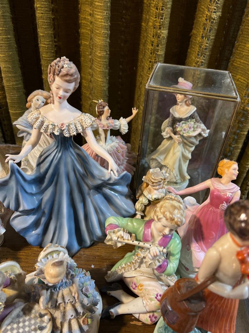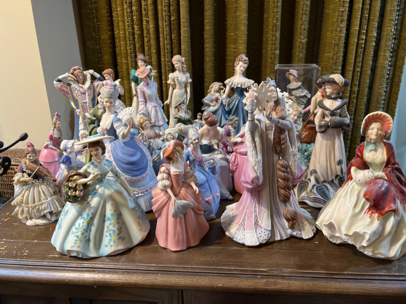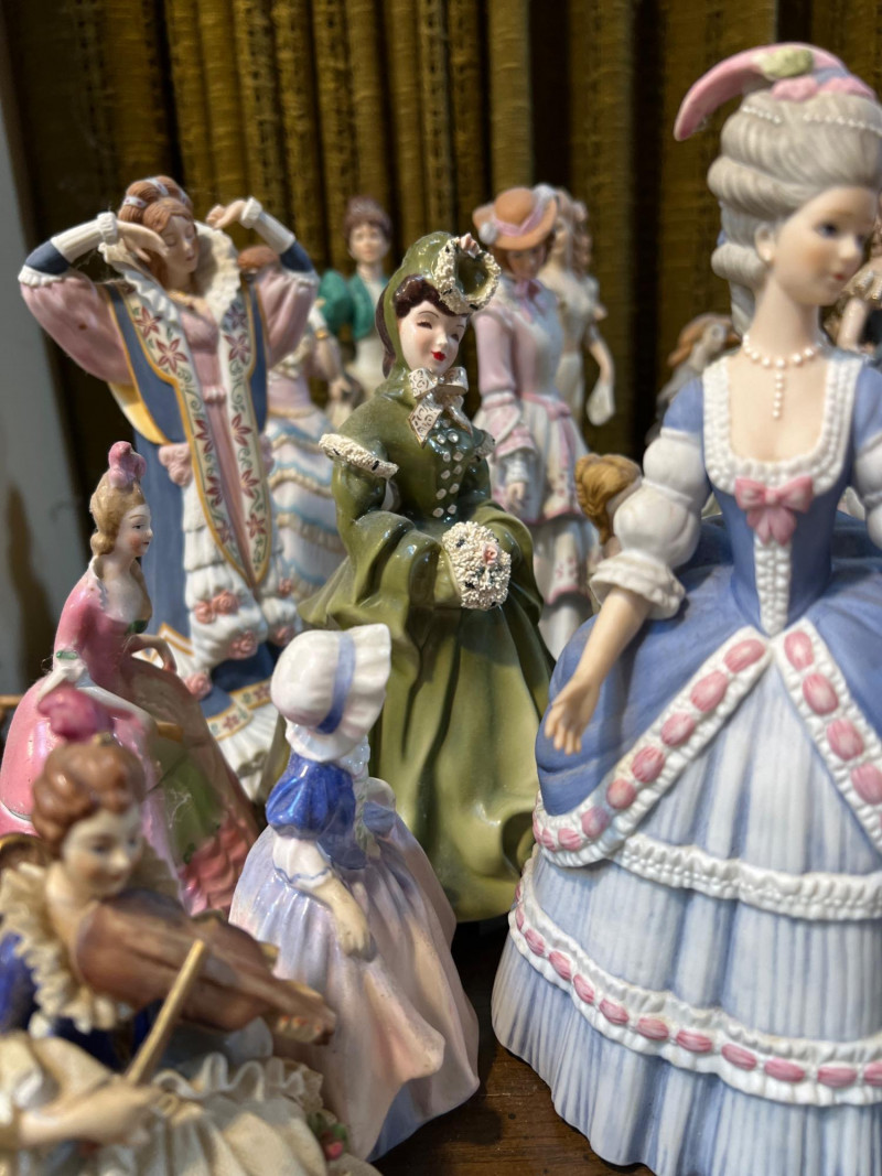Step into a parlor of porcelain dreams, where over 30 elegant ladies gather in quiet conversation. Each figure is dressed in ruffled gowns, bonnets, and corseted charm, evoking the romance of Victorian England or France and old-world Spain. Some hold fans or flowers, others pause mid-curtsy or cradle musical instruments—each one frozen in a moment of grace. Crafted in ceramic and porcelain, these figures range in style and size, with hand-painted details that whisper of ballroom nights and garden strolls. One stands encased in a clear display box, perhaps a debutante among duchesses. Whether you're a collector, reseller, or dreamer of bygone eras, this lot offers a storybook tableau of feminine artistry.
