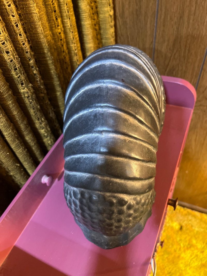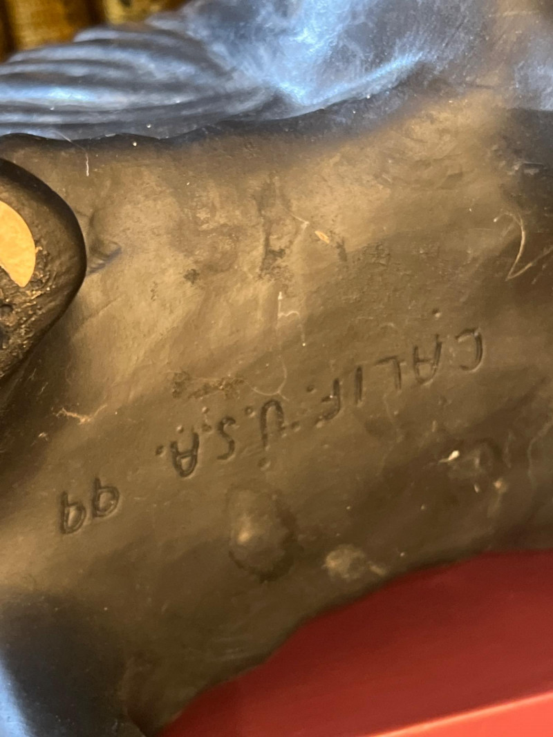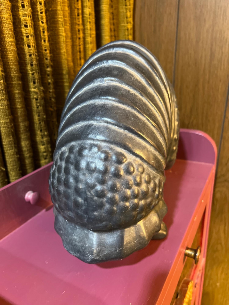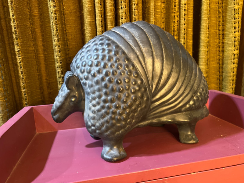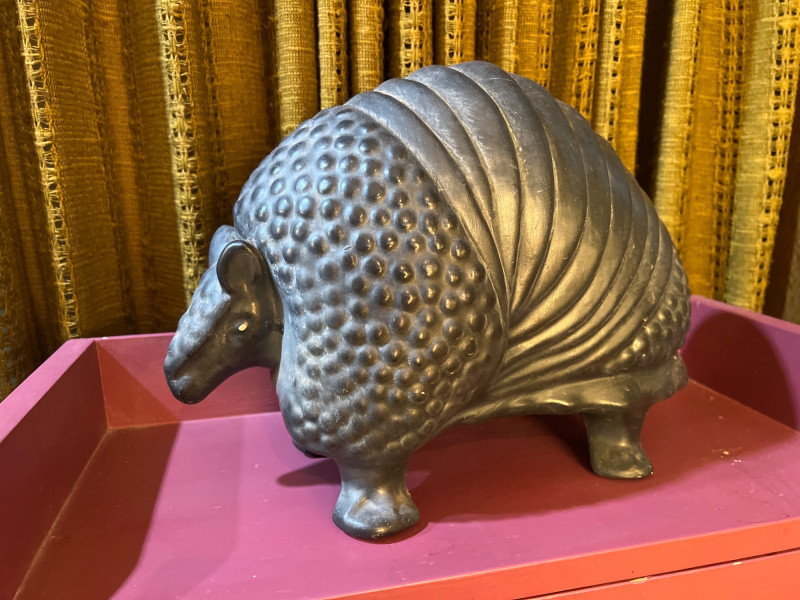 A whimsical ceramic armadillo, marked Calif USA 99, showcasing mid-century American pottery charm. This piece combines playful design with collectible craftsmanship. The textured detailing and distinctive glaze highlight the artistry typical of California ceramics, making it a standout decorative accent or conversation piece. Whether displayed as a quirky collectible or appreciated for its regional pottery heritage, this armadillo embodies both character and craftsmanship.