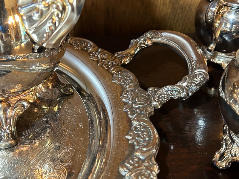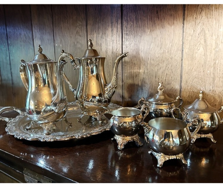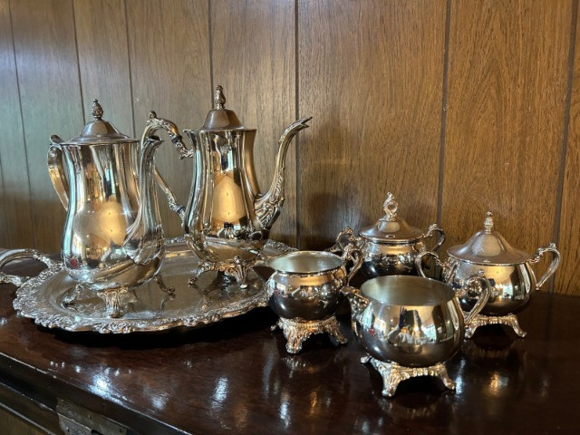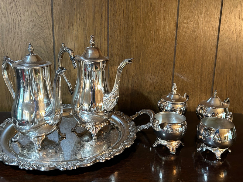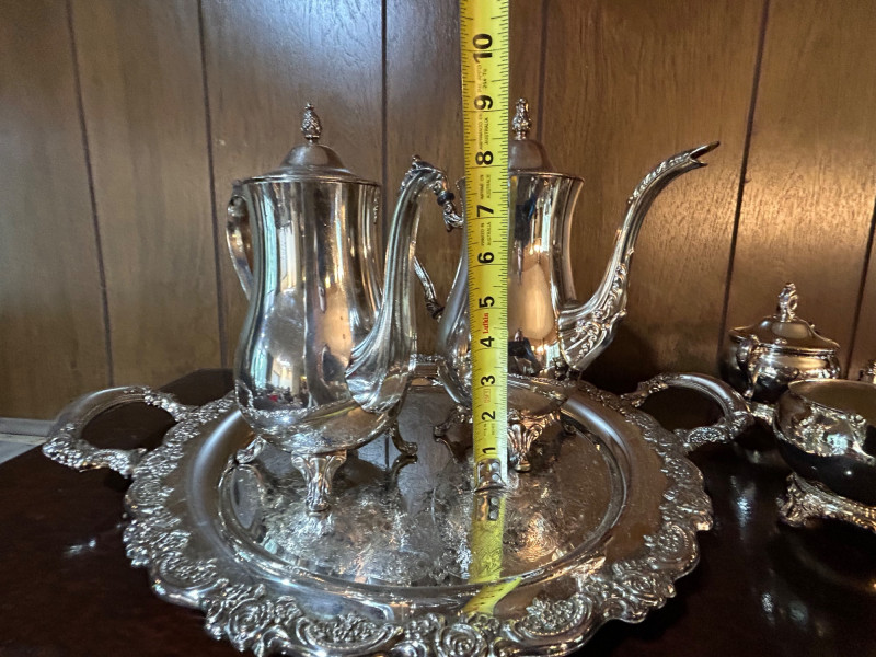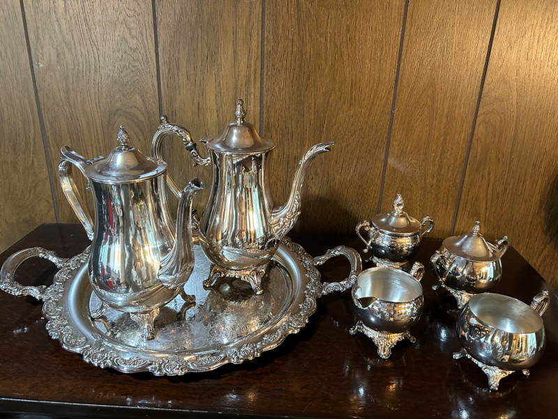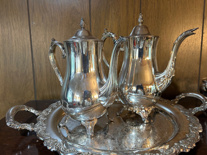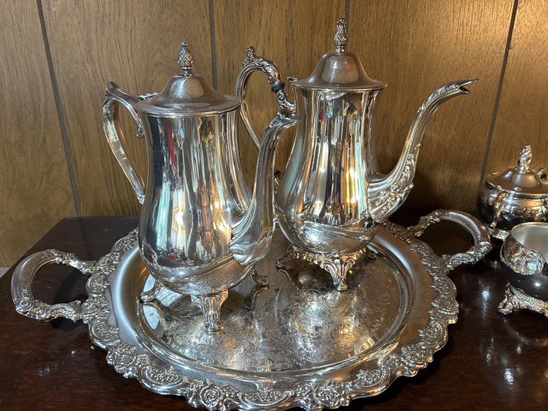 An elegant silver tea service set featuring a large serving tray, two handled coffee pots, and two complete cream and sugar sets. The craftsmanship highlights timeless design with graceful curves and polished surfaces, making this ensemble both functional and decorative. Perfect for entertaining or display, the set reflects classic hospitality traditions and offers collectors a versatile grouping of coordinated silver pieces. Whether used for formal gatherings or admired as a vintage centerpiece, this tea set embodies refinement and enduring style.