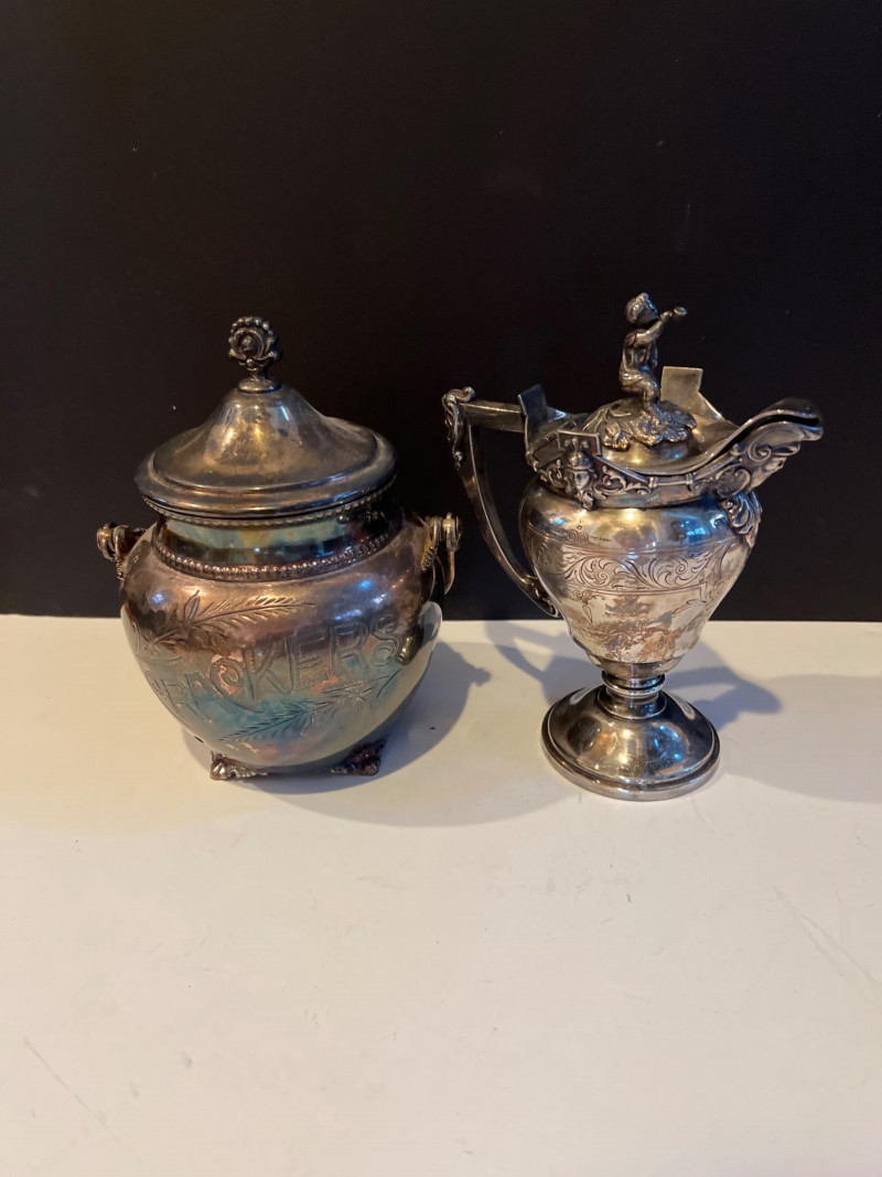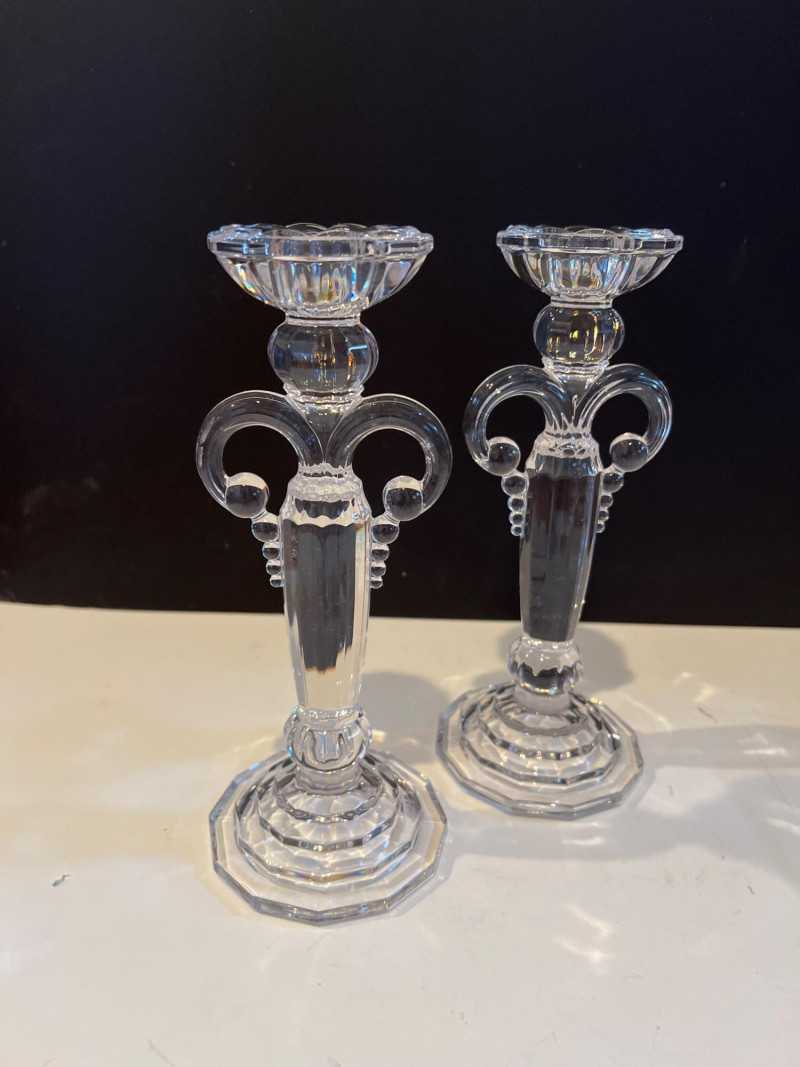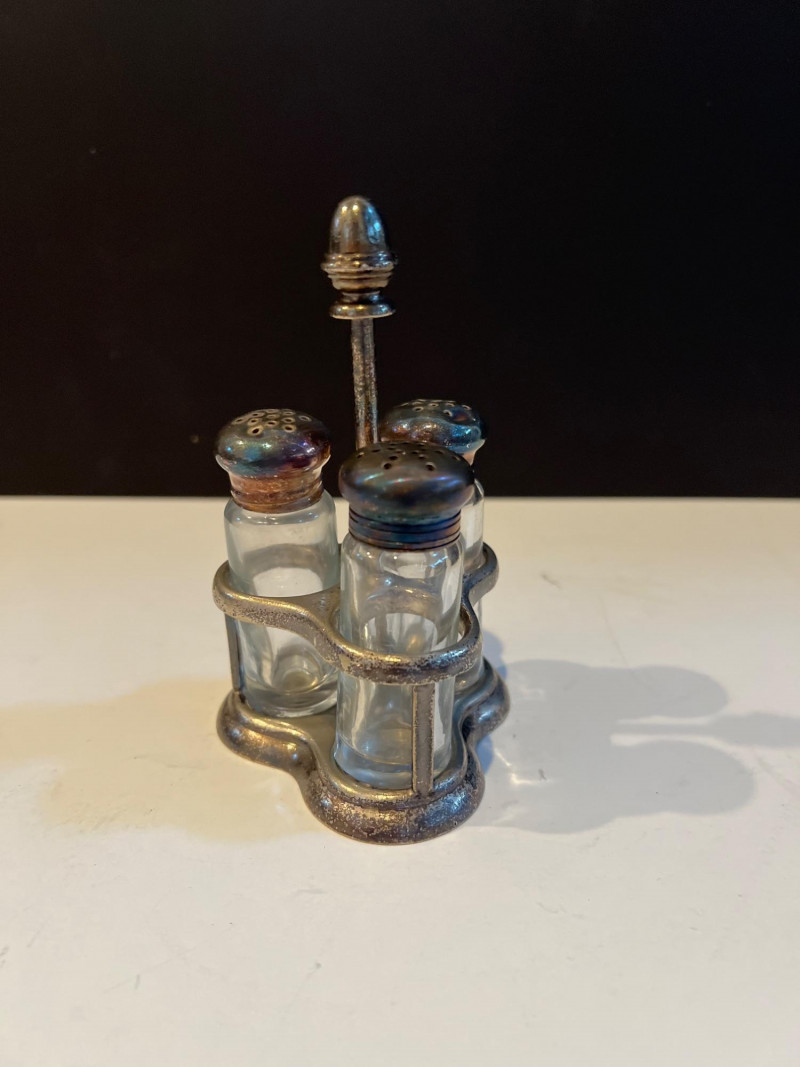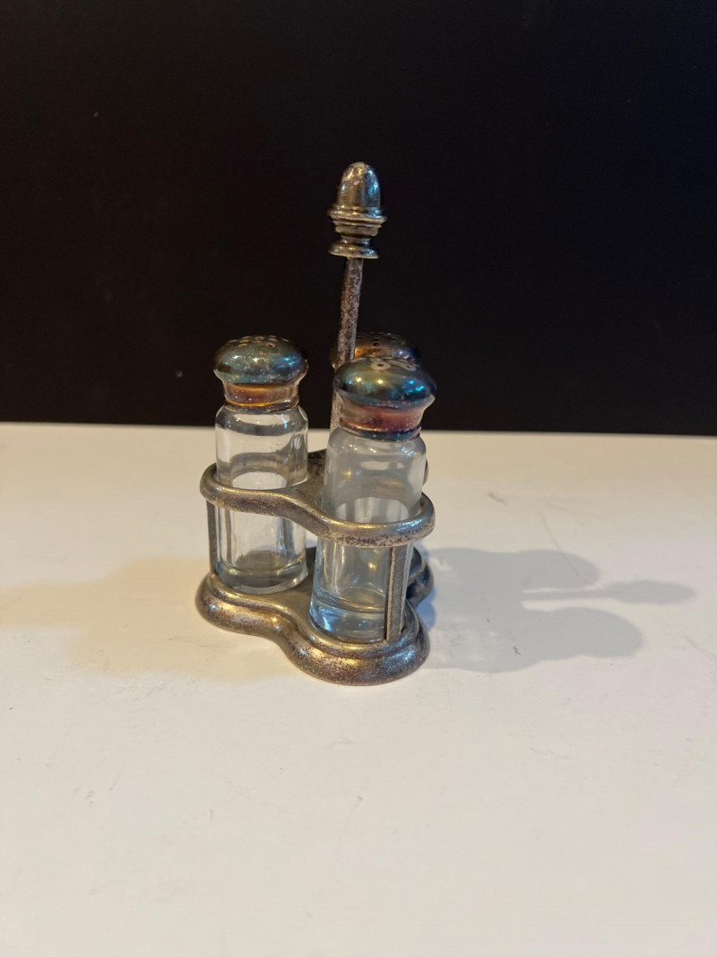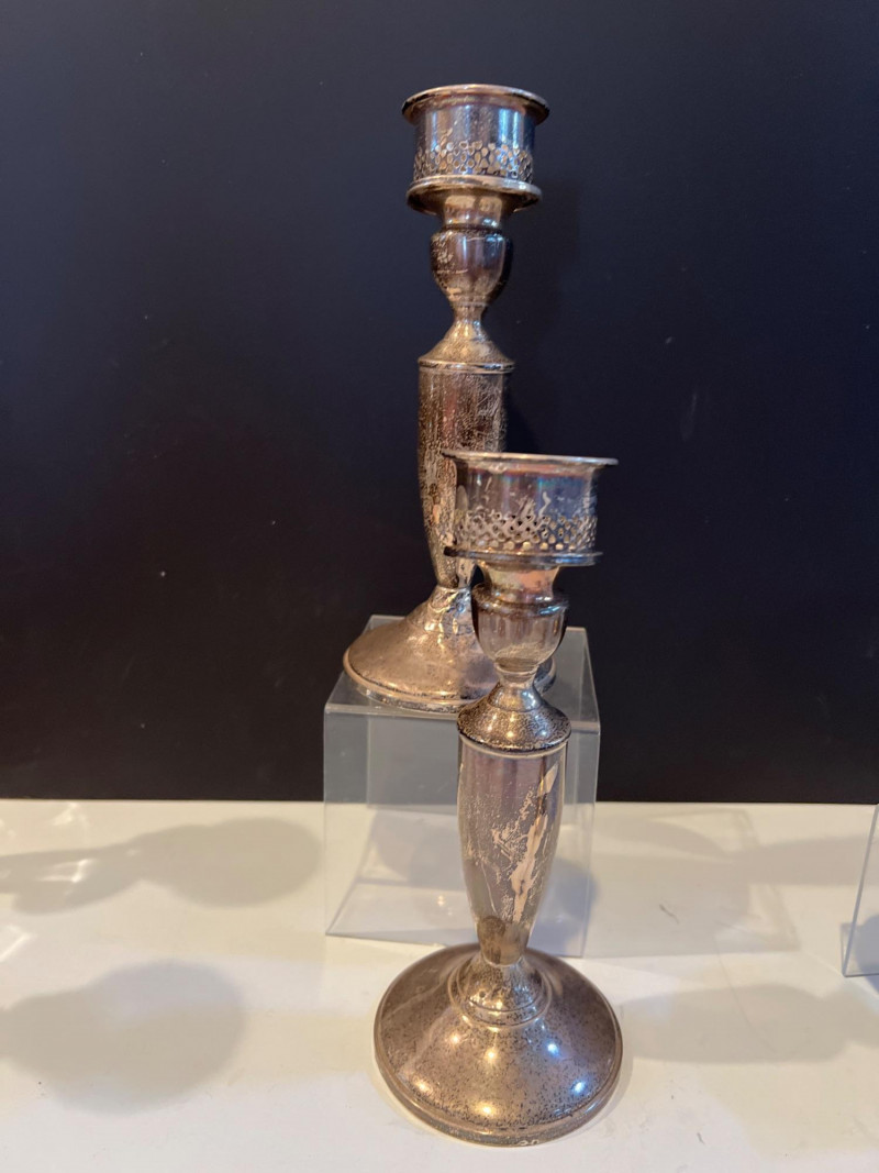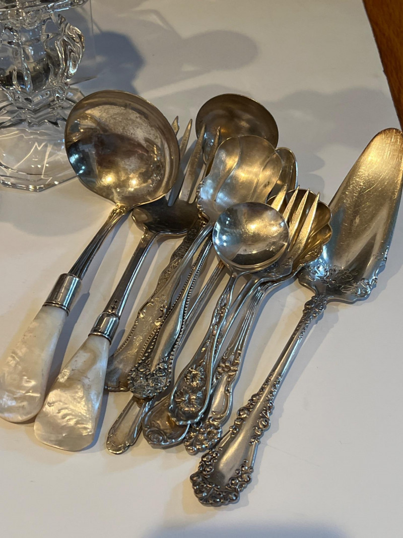 An elegant grouping of sterling silver and crystal candlesticks paired with a selection of vintage tableware and serving pieces. The candlesticks include both ornate silver forms and faceted crystal designs, offering a refined mix of sparkle and craftsmanship. Also included are assorted serving utensils with decorative handles and a condiment caddy with glass inserts and metal tops — classic pieces that bring timeless charm to a dining table or display. This lot is ideal for collectors, decorators, or resellers seeking traditional table accents with enduring appeal.