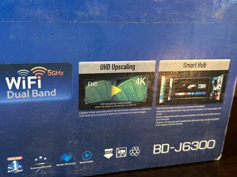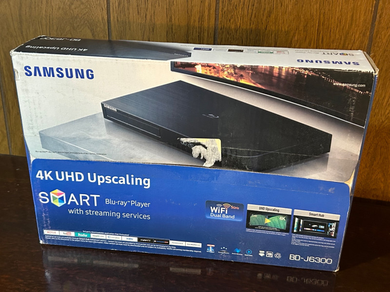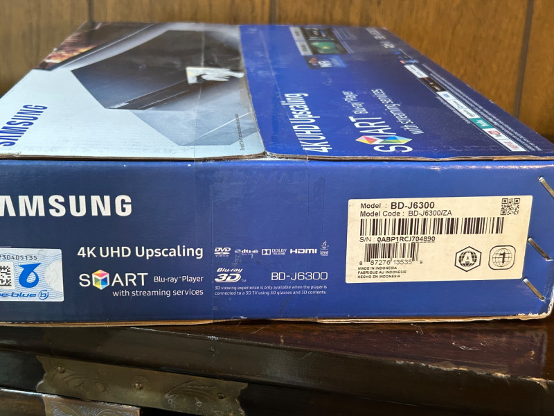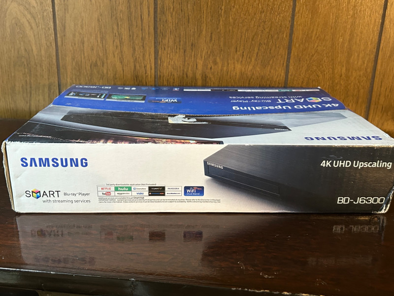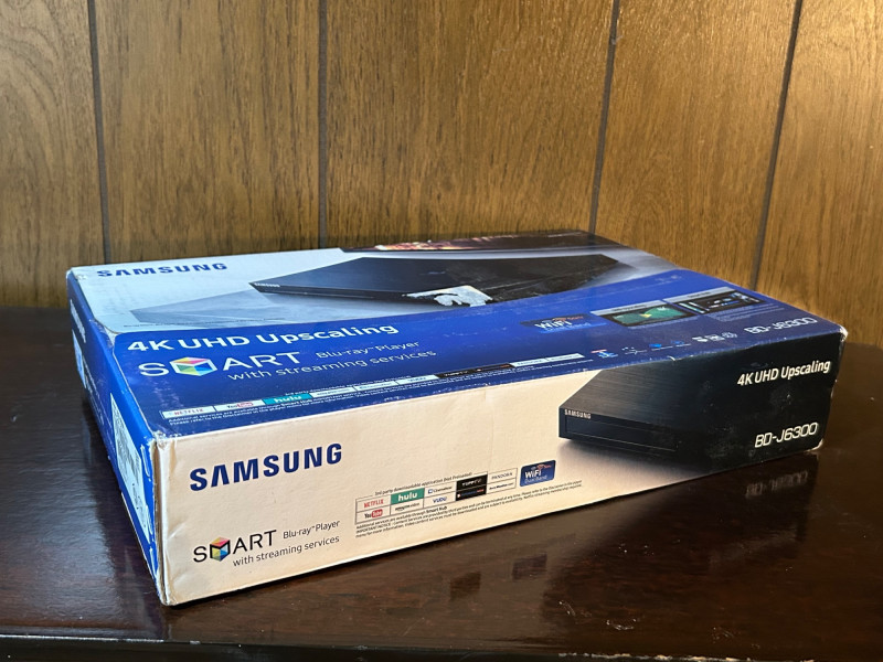 The Samsung BD-J6300 Blu-ray Player delivers advanced playback and streaming capabilities in a sleek design. Supporting 3D Blu-ray discs and 4K upscaling, it enhances picture quality for both physical discs and digital content. Built-in Wi-Fi and Ethernet connectivity allow access to popular streaming services, while its Smart Hub interface makes browsing apps and media simple. This player also supports a wide range of video formats (AVCHD, DivX, MKV, WMV) and audio formats (AAC, FLAC, MP3, WMA), with decoding for DTS-HD Master Audio and Dolby TrueHD for immersive sound. With 7.1 channel output, it’s ideal for home theater setups. Compact yet powerful, the BD-J6300 is perfect for collectors of electronics or anyone seeking a versatile Blu-ray player with modern features. Model: Samsung BD-J6300 Playback: Blu-ray, DVD, CD, 3D Blu-ray Upscaling: 4K UHD upscaling for non-4K content Connectivity: Wi-Fi, Ethernet LAN, HDMI output, optical audio out Audio: DTS-HD Master Audio, Dolby TrueHD, 7.1 channel support Formats Supported: AVCHD, DivX, MKV, WMV, AAC, FLAC, MP3, WMA, JPEG Smart Features: Streaming apps via Samsung Smart Hub Color/Design: Black, slim profileKey Specs