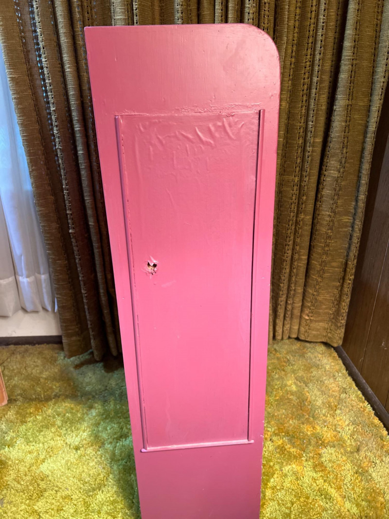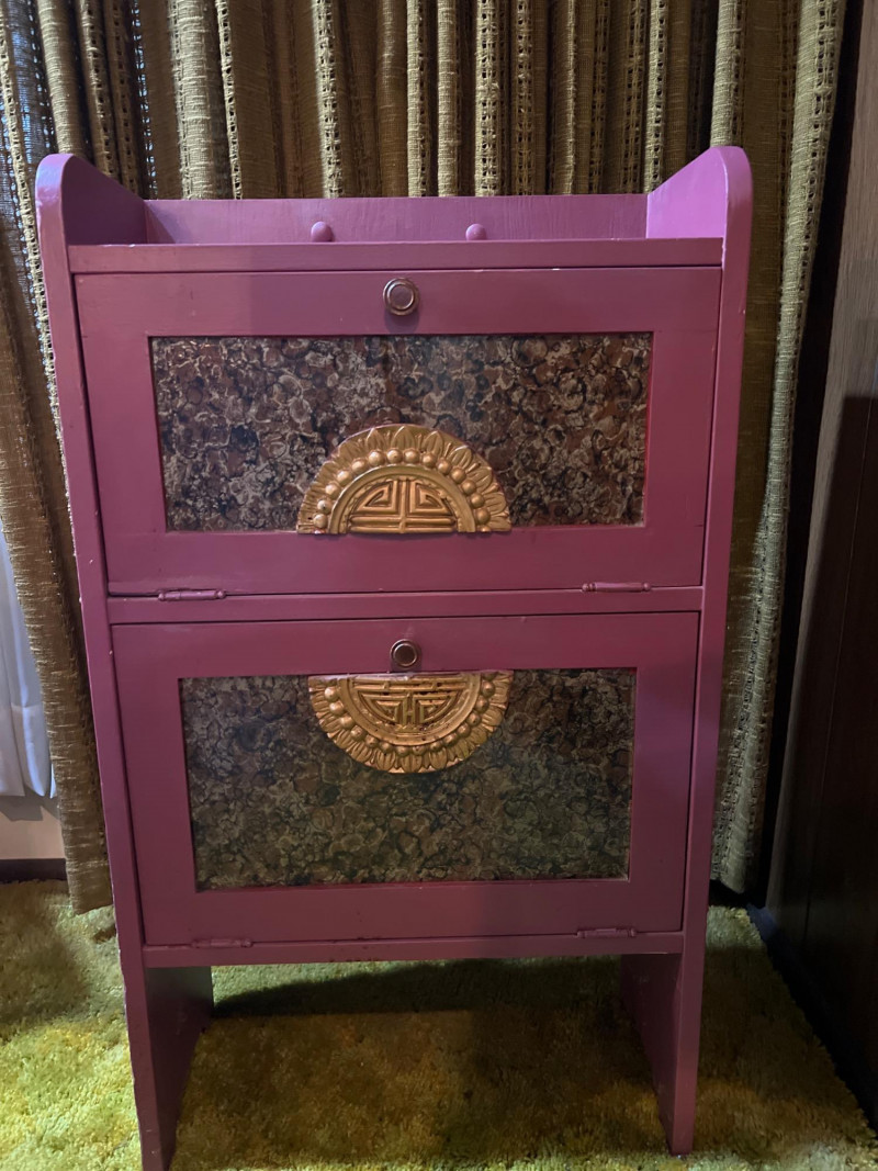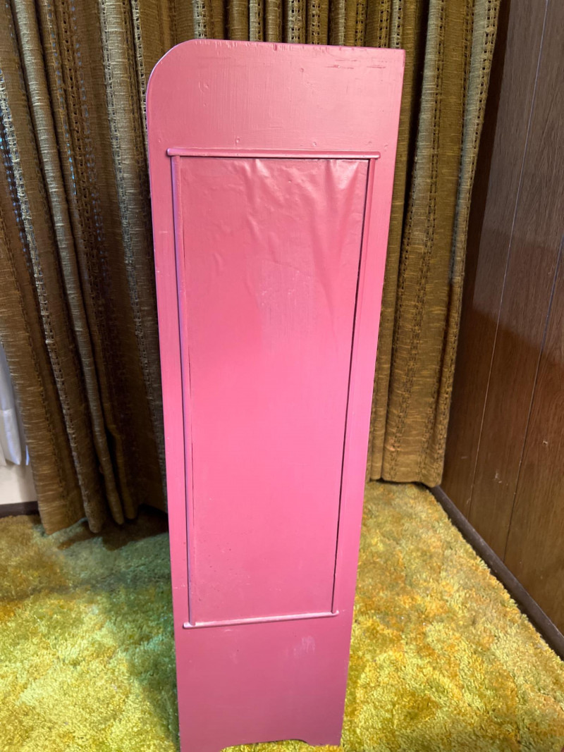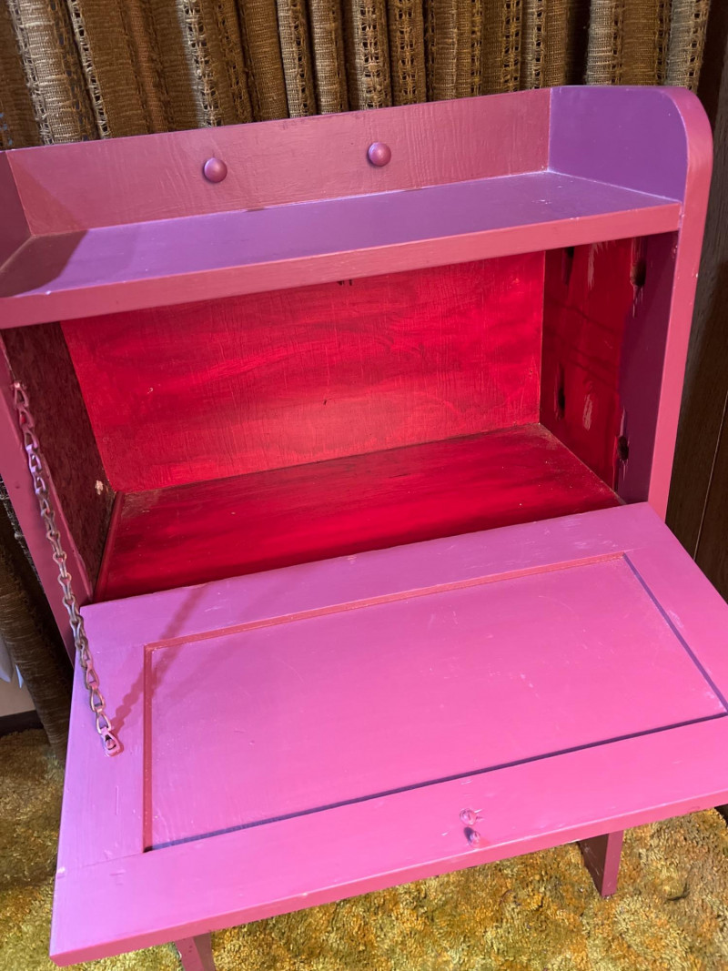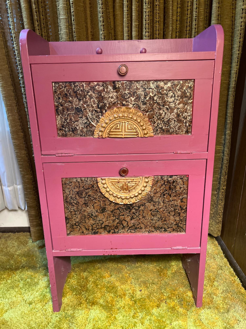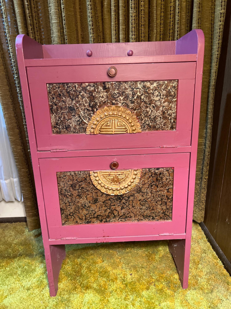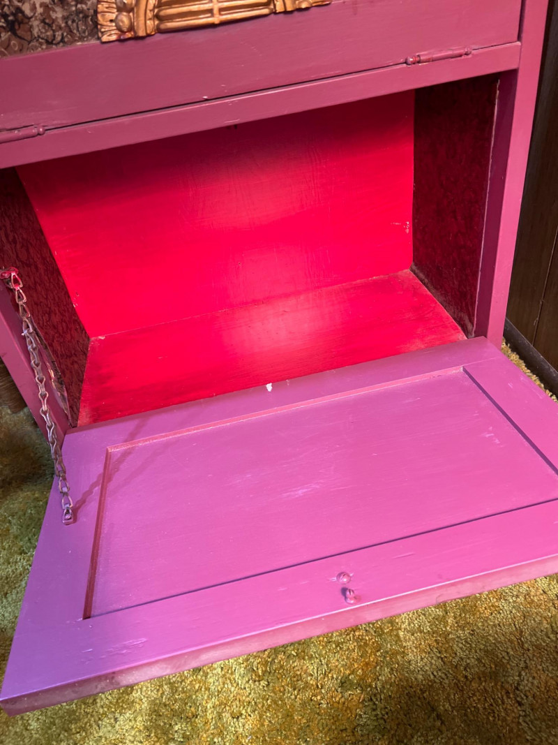 A striking two-section cabinet in the Chinoiserie style, richly painted and decorated with intricate motifs. The piece features a lower storage section and an upper display cabinet (both with hinged doors), offering both functionality and artistry. The hand-painted decoration evokes traditional Asian-inspired designs, with detailed scenes and flourishes that highlight the elegance of Chinoiserie craftsmanship. This cabinet serves as both a practical furnishing and a decorative statement piece, ideal for collectors of vintage furniture or those seeking to add a touch of cottage flair to their interiors. NOTE: there is a gouge or hole on one side (see pictures) that needs repair. Cabinet dimensions noted below. One flight of stairs and 8 concrete steps to driveway load.