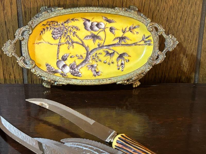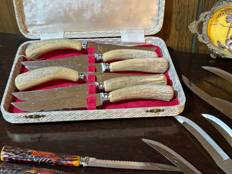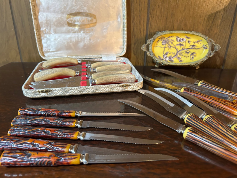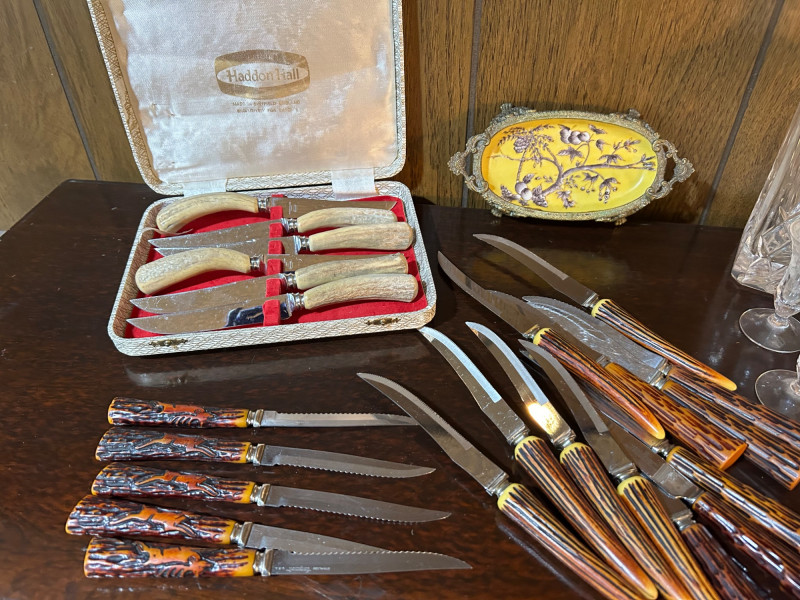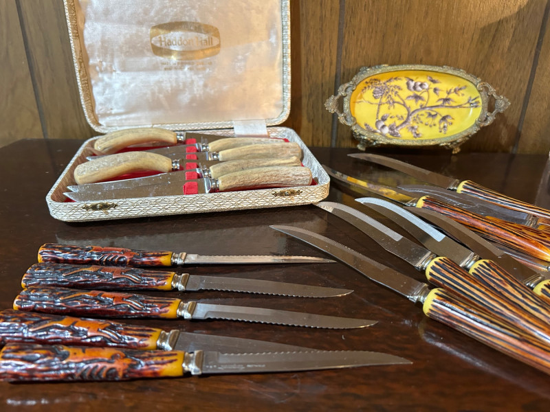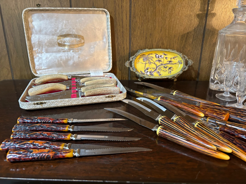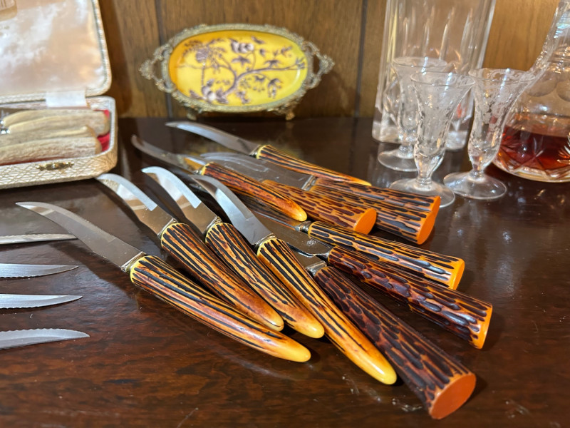 A refined grouping of vintage cutlery with Bakelite handles paired with elegant crystal carafes. The cutlery showcases the distinctive mid‑century appeal of Bakelite — prized for its durability and rich color tones — while the crystal carafes add a touch of timeless sophistication with their faceted design and sparkling clarity. Together, these pieces blend practical utility with decorative charm, making them ideal for collectors of vintage kitchenware, resellers seeking recognizable materials, or decorators looking to add character to a dining display.