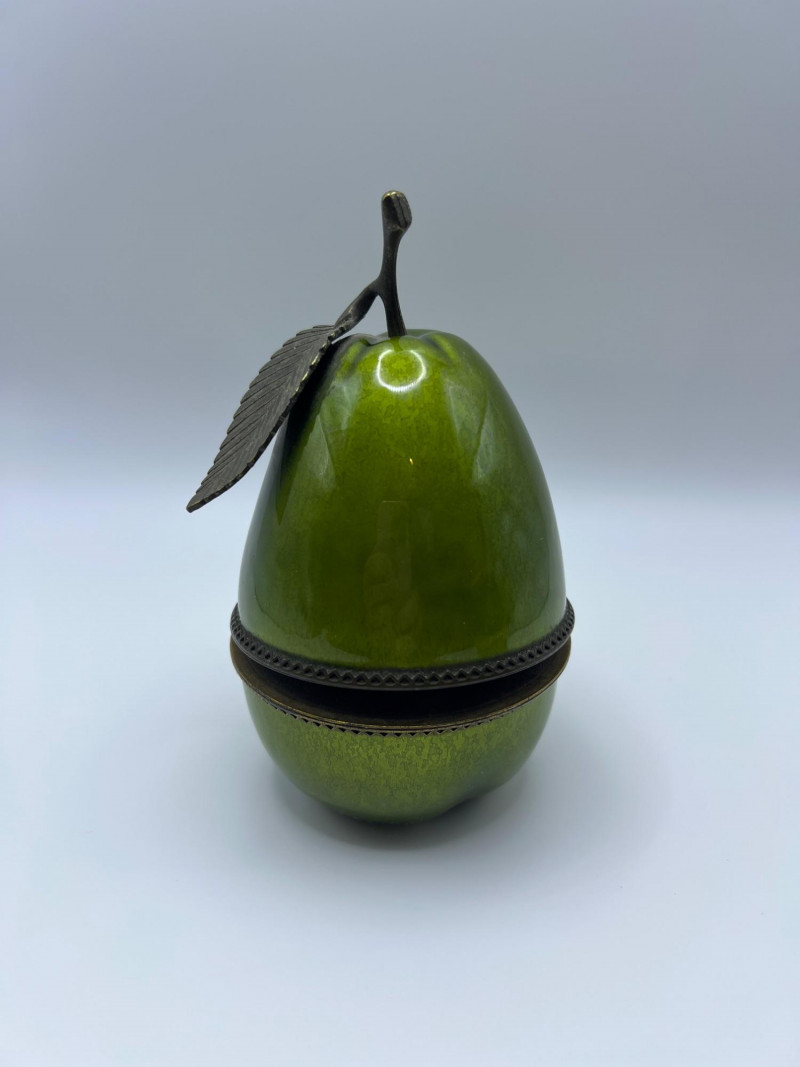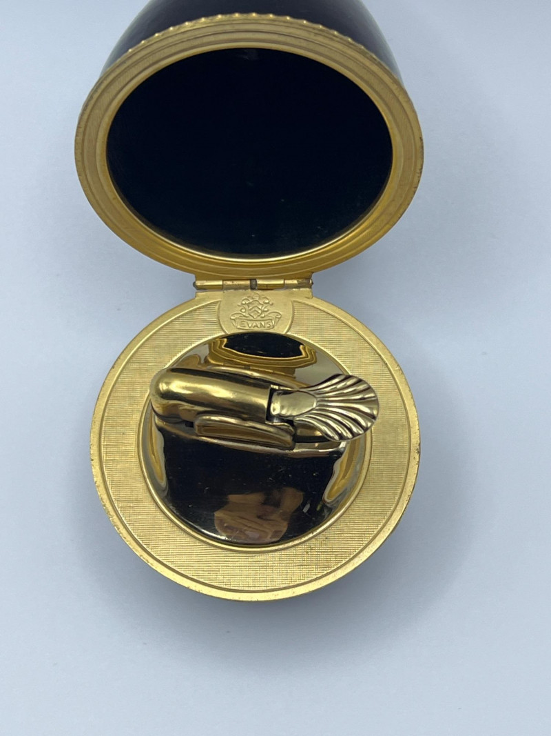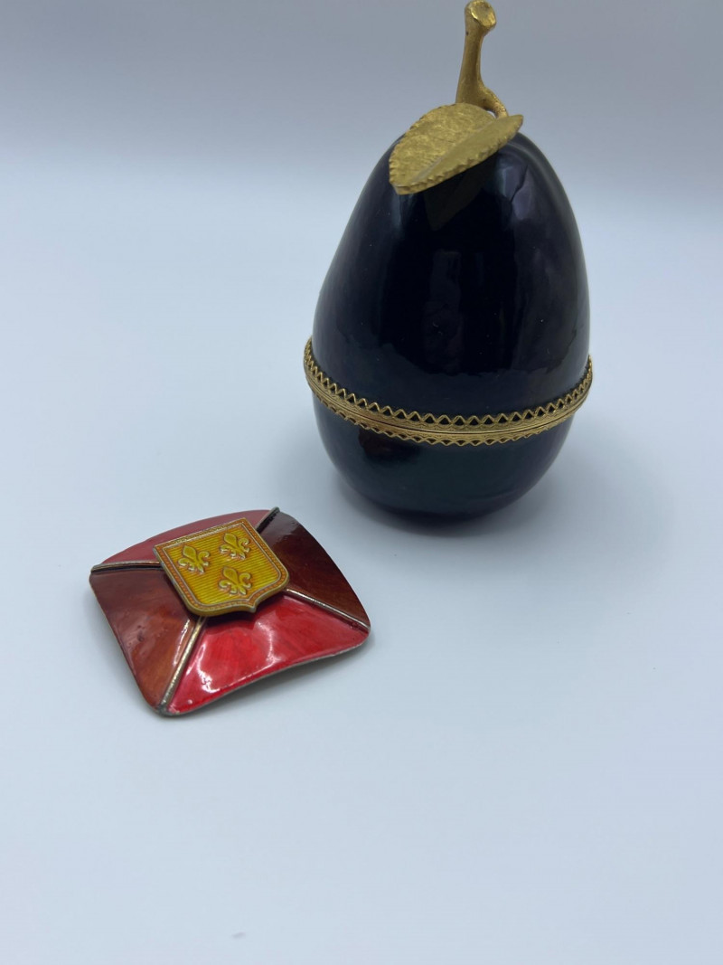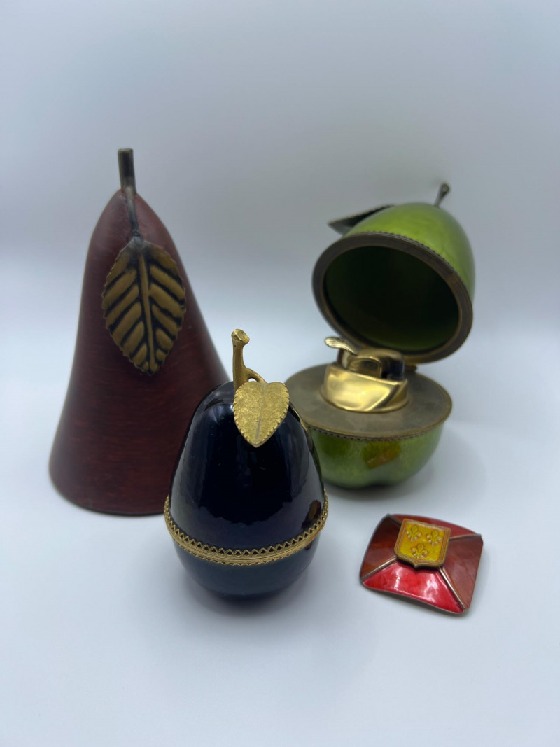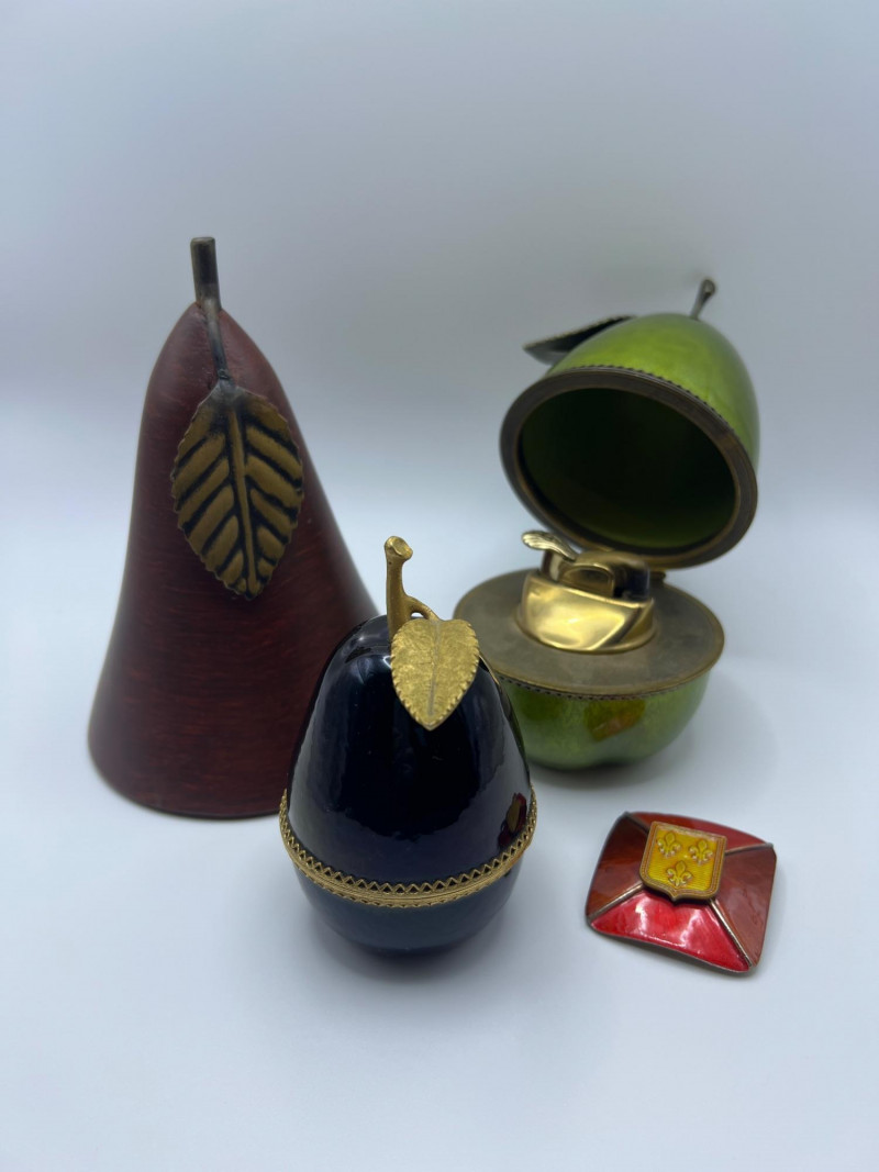 A distinctive grouping featuring two 1960s Evans enamel pear‑shaped butane lighters — one in green enamel and one in black enamel — both known for their mid‑century craftsmanship and collectible appeal. Also included is a carved rosewood pear, likely decorative, offering warm natural contrast to the enamel pieces. Completing the lot is a red enamel pin/brooch, an extra accent item that adds a bright pop of color. This set is ideal for collectors of Evans lighters, mid‑century curios, or small decorative objects with personality and display value.