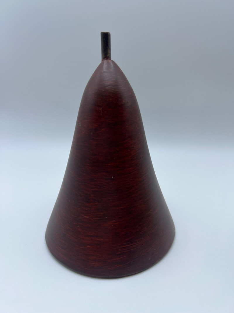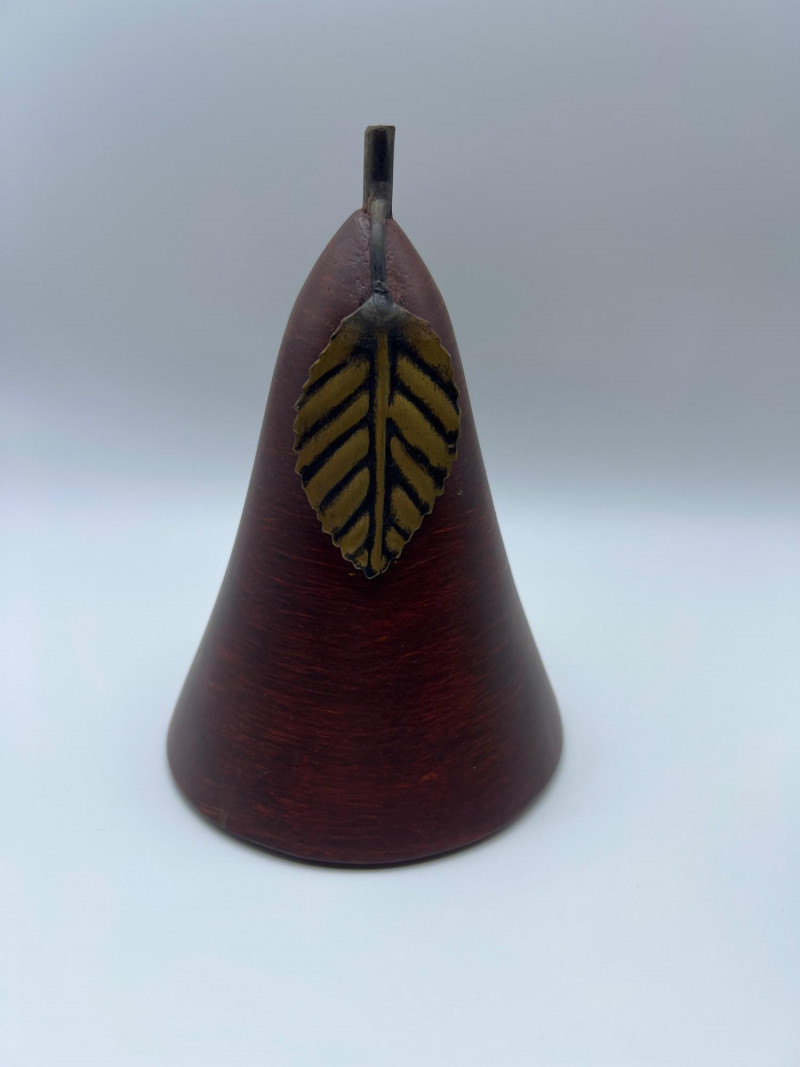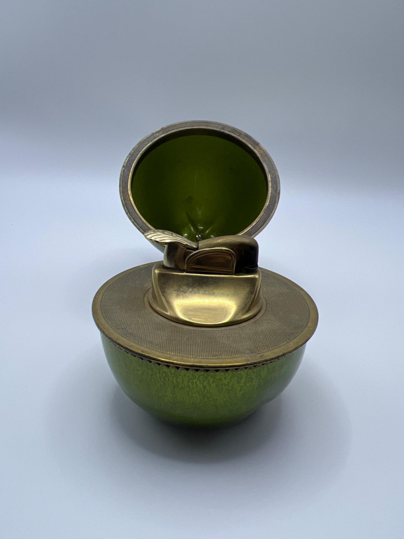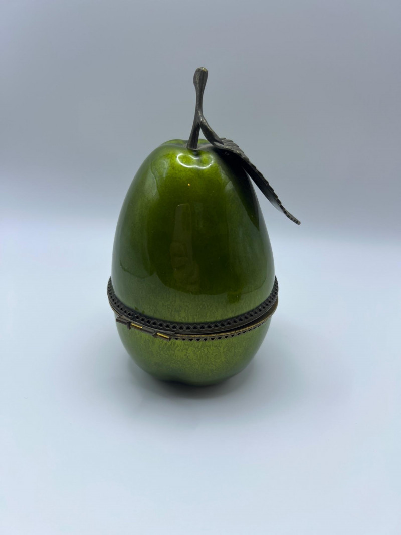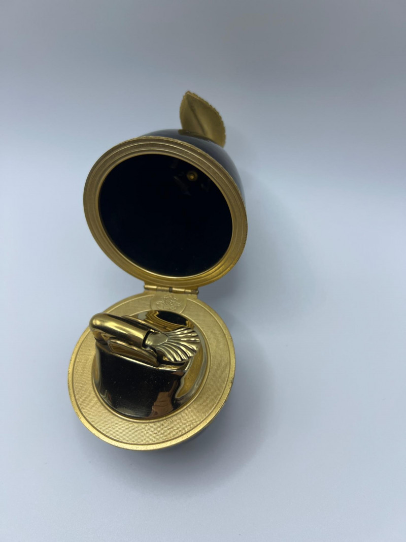 A distinctive grouping featuring two 1960s Evans enamel pear‑shaped butane lighters — one in green enamel and one in black enamel — both known for their mid‑century craftsmanship and collectible appeal. Also included is a carved rosewood pear, likely decorative, offering warm natural contrast to the enamel pieces. Completing the lot is a red enamel pin/brooch, an extra accent item that adds a bright pop of color. This set is ideal for collectors of Evans lighters, mid‑century curios, or small decorative objects with personality and display value.