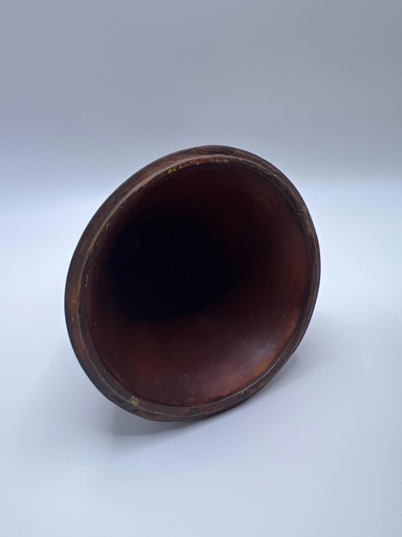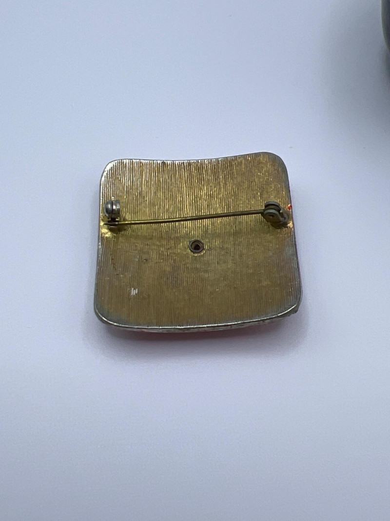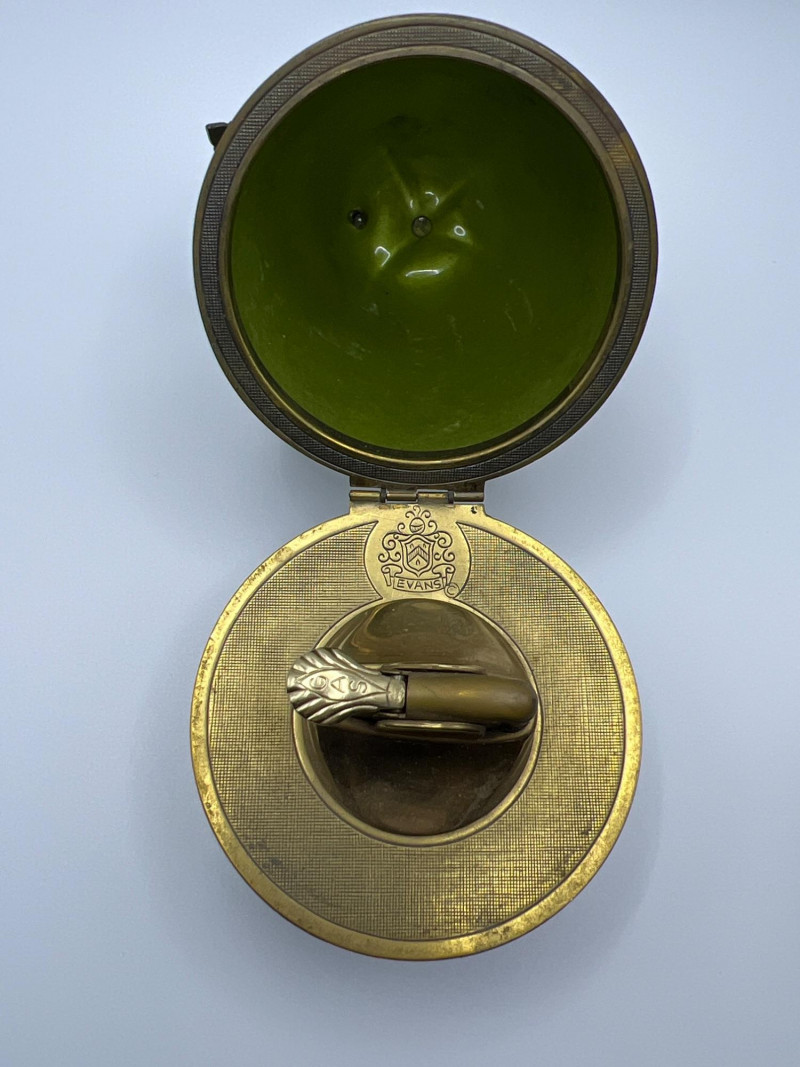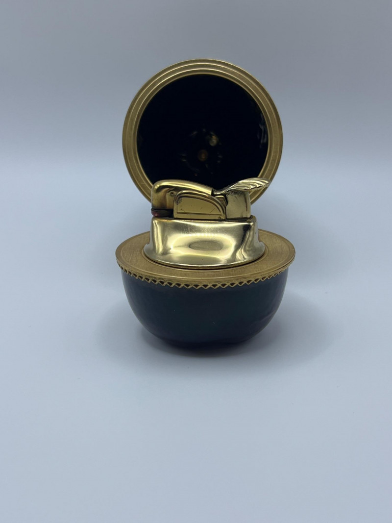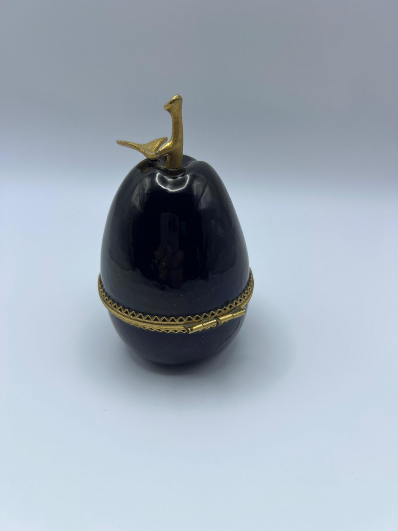 A distinctive grouping featuring two 1960s Evans enamel pear‑shaped butane lighters — one in green enamel and one in black enamel — both known for their mid‑century craftsmanship and collectible appeal. Also included is a carved rosewood pear, likely decorative, offering warm natural contrast to the enamel pieces. Completing the lot is a red enamel pin/brooch, an extra accent item that adds a bright pop of color. This set is ideal for collectors of Evans lighters, mid‑century curios, or small decorative objects with personality and display value.