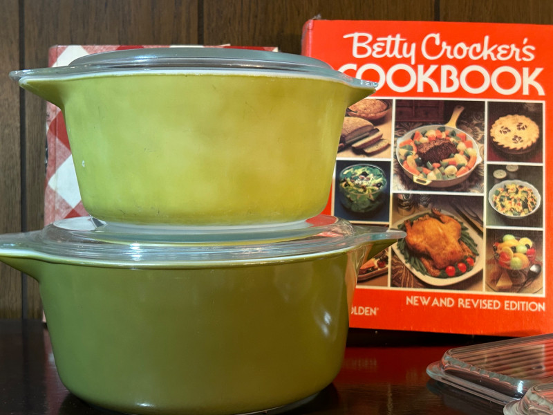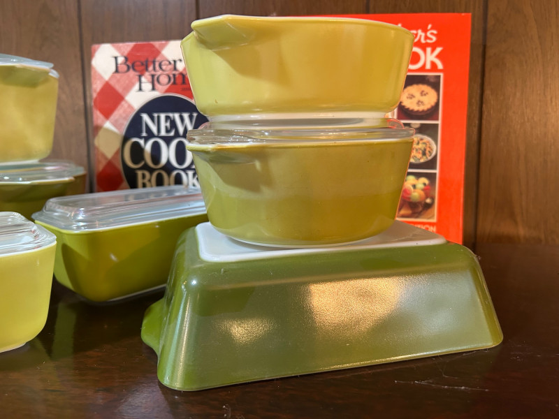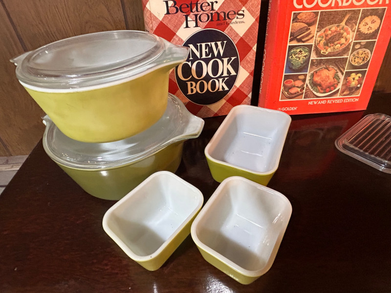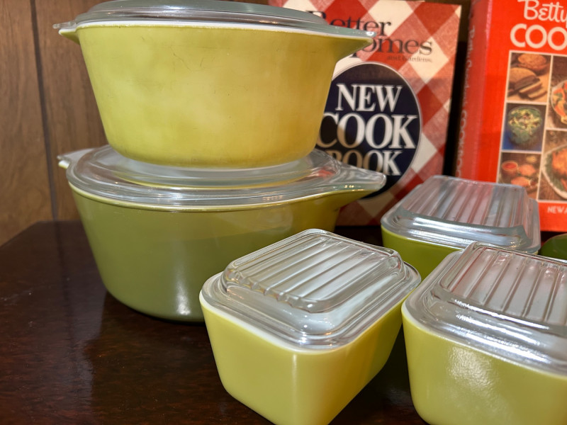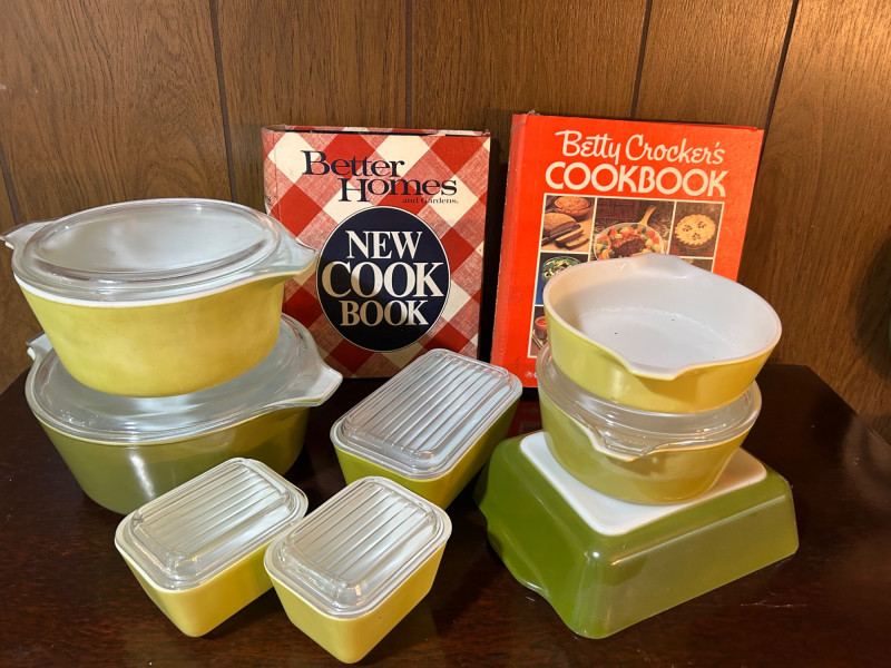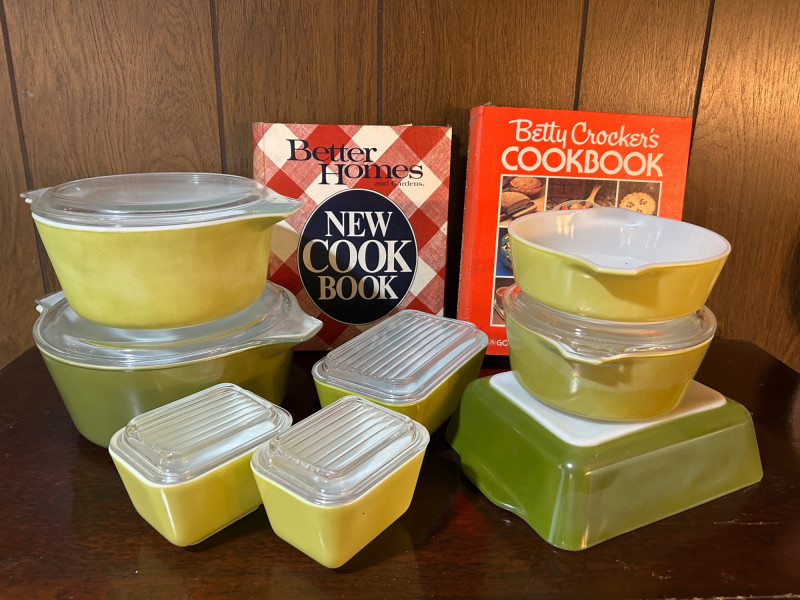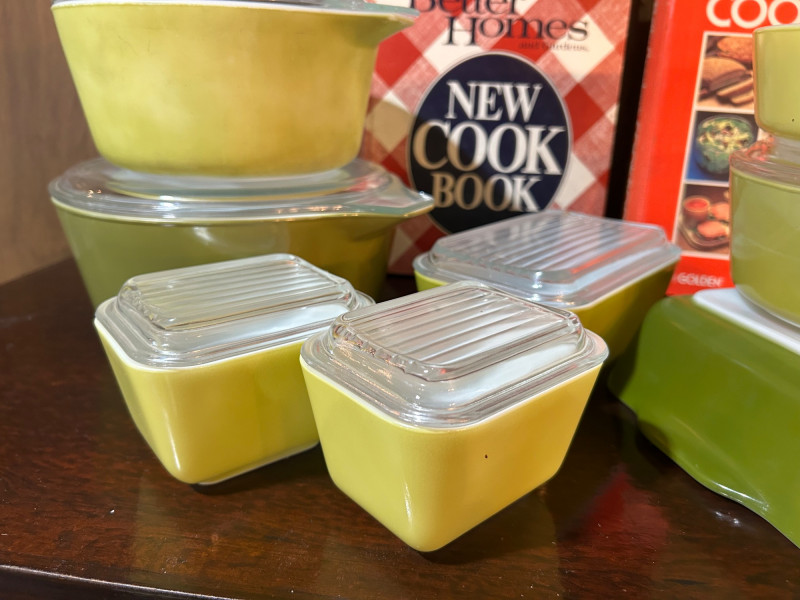 A vibrant assortment of vintage Pyrex, including classic mixing bowls and refrigerator dishes with lids in desirable colors and patterns. This grouping features the iconic mid‑century hues collectors love, with nesting bowls and matching fridge pieces that display beautifully together. Perfect for resellers, collectors, or anyone building out a vintage kitchen aesthetic, this lot offers strong standalone value as well as excellent potential when broken into smaller sets. The included vintage cookbooks add nostalgic charm and display appeal.