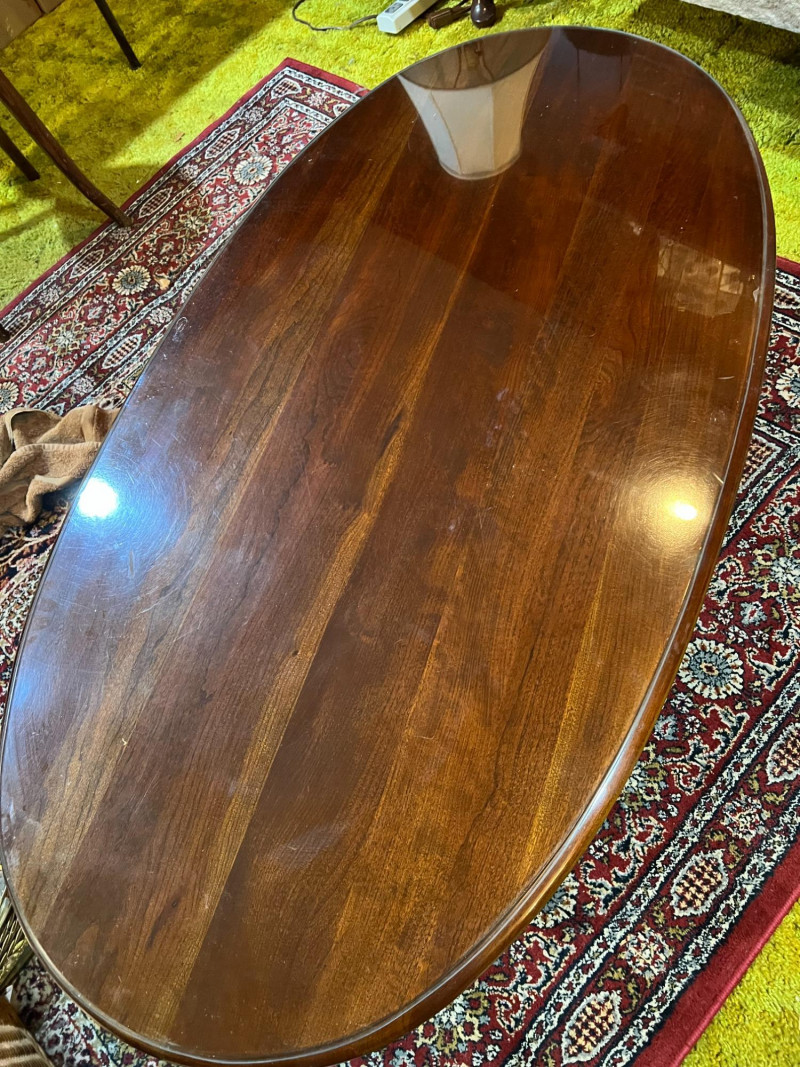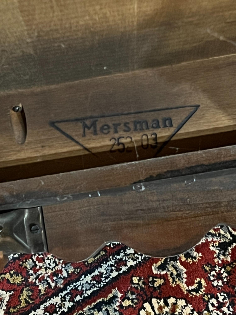 A timeless mid-century Mersman oval coffee table featuring a sleek glass top set within a sturdy wood frame. Known for their craftsmanship and enduring style, Mersman tables are highly collectible pieces of mid-century furniture. The oval shape offers a graceful silhouette, while the glass top adds both functionality and elegance—perfect for showcasing décor or serving as a centerpiece in any living space.