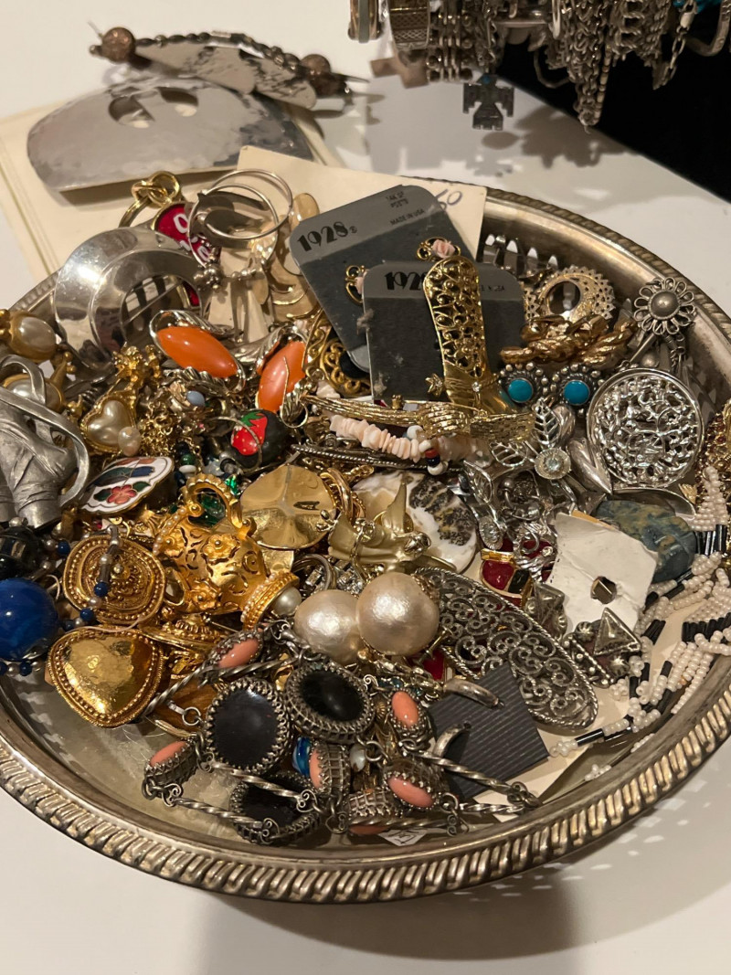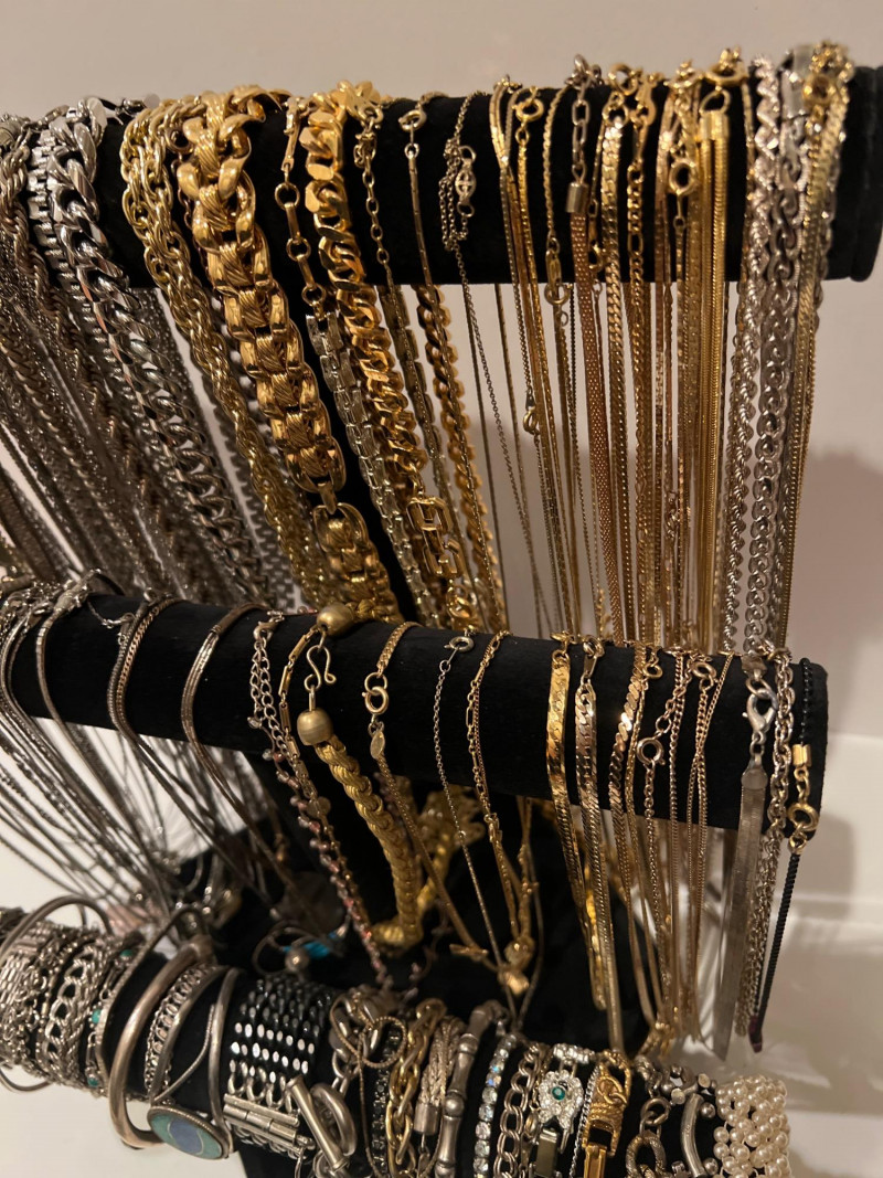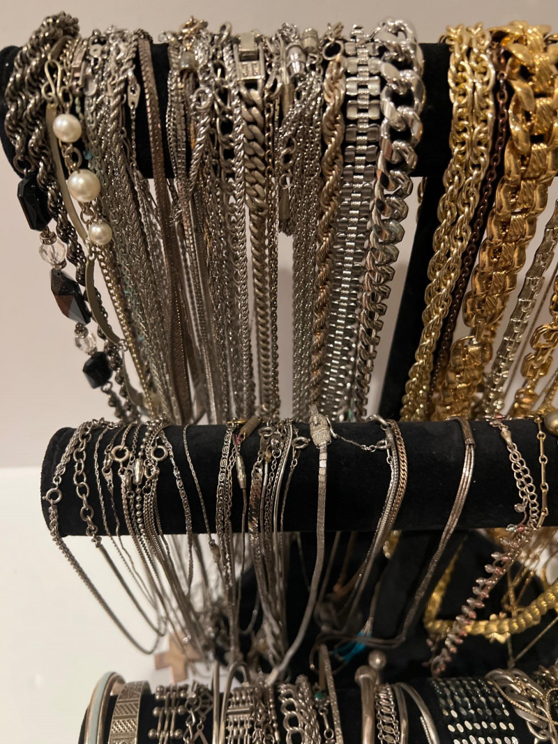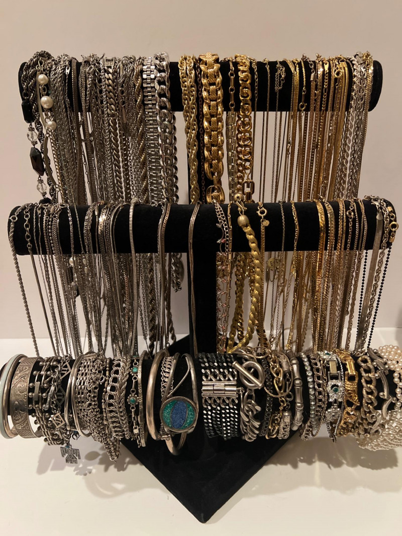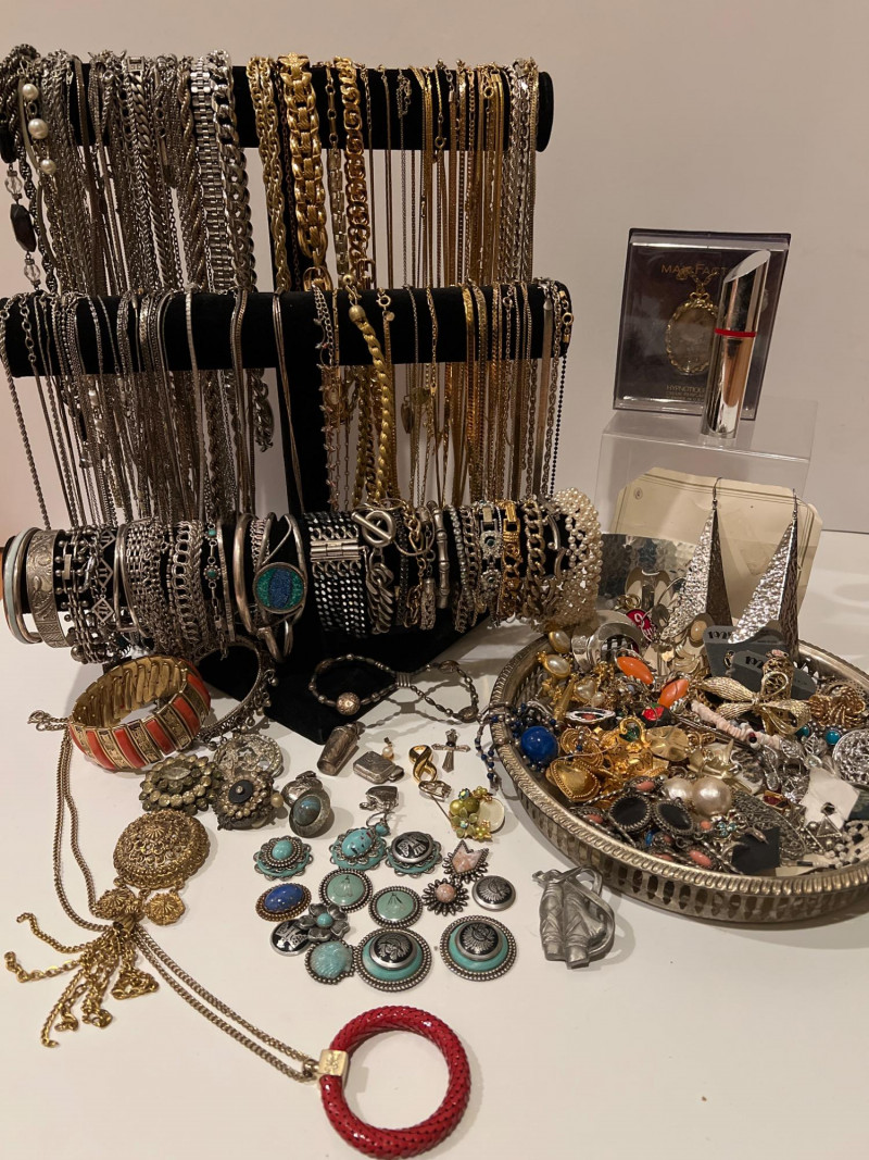 Necklaces, Bracelets, Rings, Brooches, Earrings & Charms – Display‑Ready Variety A generous and visually striking assortment of vintage and costume jewelry, displayed across a multi‑tier stand and tabletop layout. This collection includes: Necklaces: gold‑tone chains, beaded strands, pendants, and statement pieces Bracelets & Bangles: metal cuffs, charm bracelets, beaded styles, and colorful fashion pieces Rings: assorted sizes and designs, including rhinestone, filigree, and cocktail styles Brooches & Pins: floral motifs, filigree work, whimsical shapes, and vintage metalwork Earrings: studs, drops, hoops, and decorative pairs in mixed materials Charms & Small Accessories: turquoise‑tone pieces, pendants, and mixed trinkets A perfect lot for resellers, crafters, jewelry makers, or collectors, offering a ready‑to‑sort treasure trove of styles, eras, and materials. Strong resale potential with excellent visual appeal.