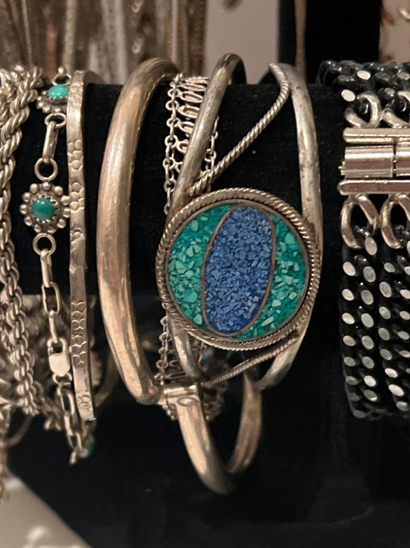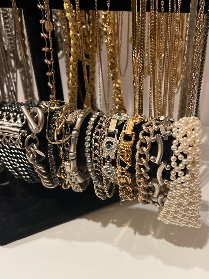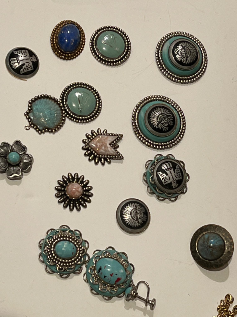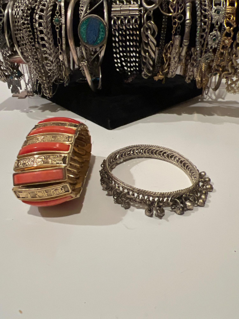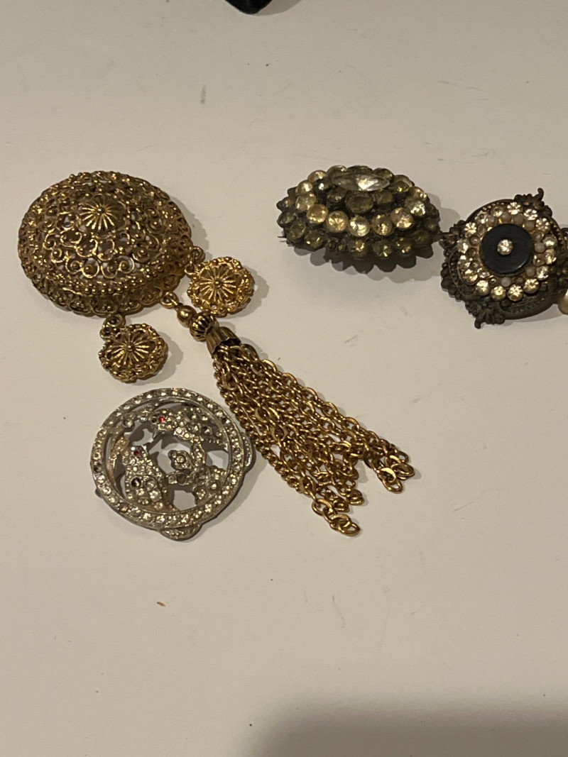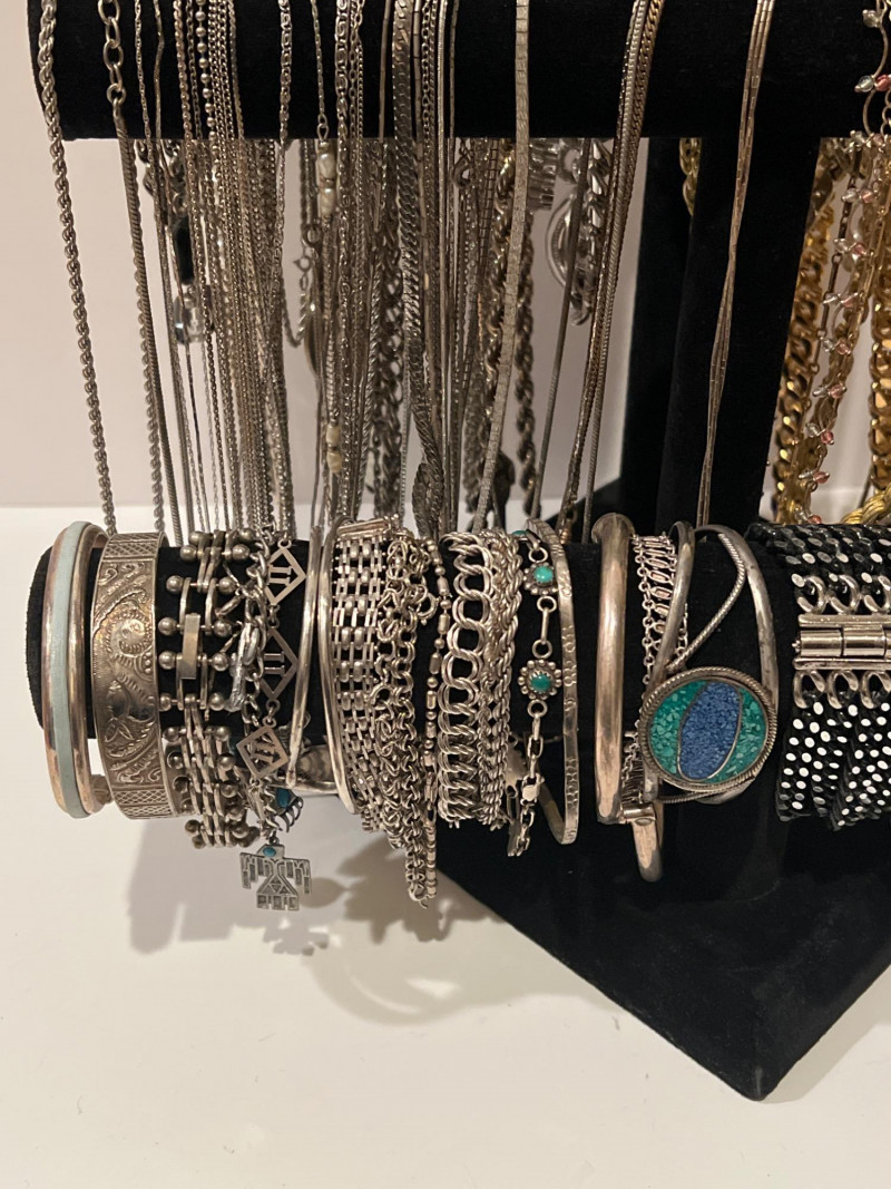Necklaces, Bracelets, Rings, Brooches, Earrings & Charms – Display‑Ready Variety A generous and visually striking assortment of vintage and costume jewelry, displayed across a multi‑tier stand and tabletop layout. This collection includes: Necklaces: gold‑tone chains, beaded strands, pendants, and statement pieces Bracelets & Bangles: metal cuffs, charm bracelets, beaded styles, and colorful fashion pieces Rings: assorted sizes and designs, including rhinestone, filigree, and cocktail styles Brooches & Pins: floral motifs, filigree work, whimsical shapes, and vintage metalwork Earrings: studs, drops, hoops, and decorative pairs in mixed materials Charms & Small Accessories: turquoise‑tone pieces, pendants, and mixed trinkets A perfect lot for resellers, crafters, jewelry makers, or collectors, offering a ready‑to‑sort treasure trove of styles, eras, and materials. Strong resale potential with excellent visual appeal.