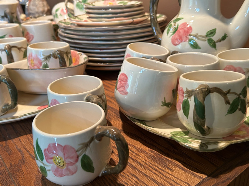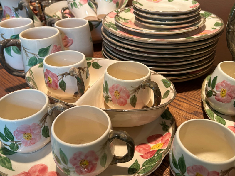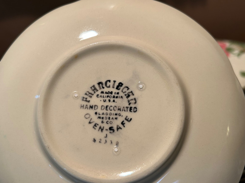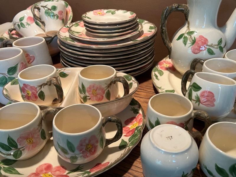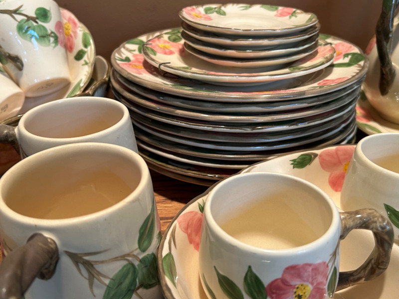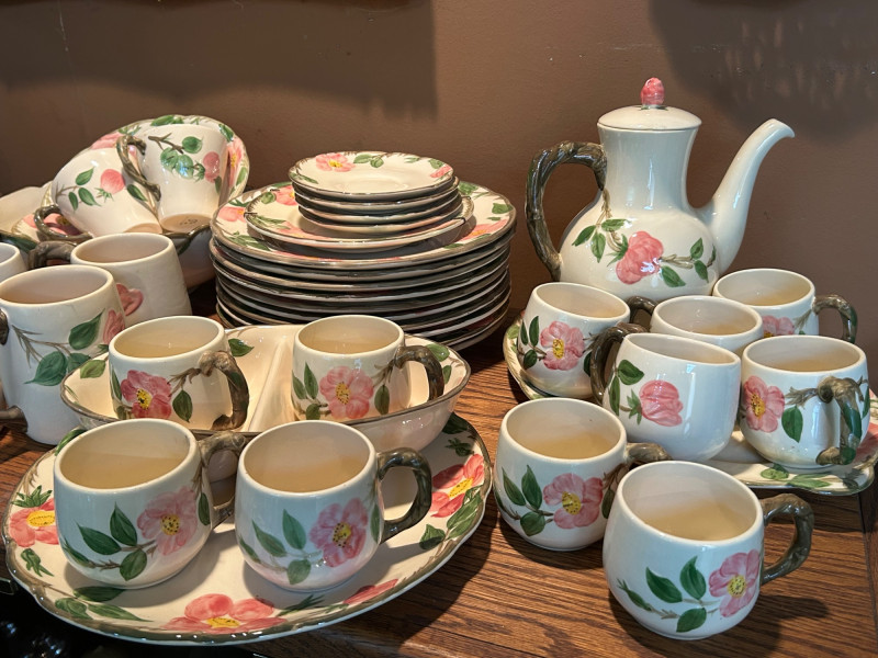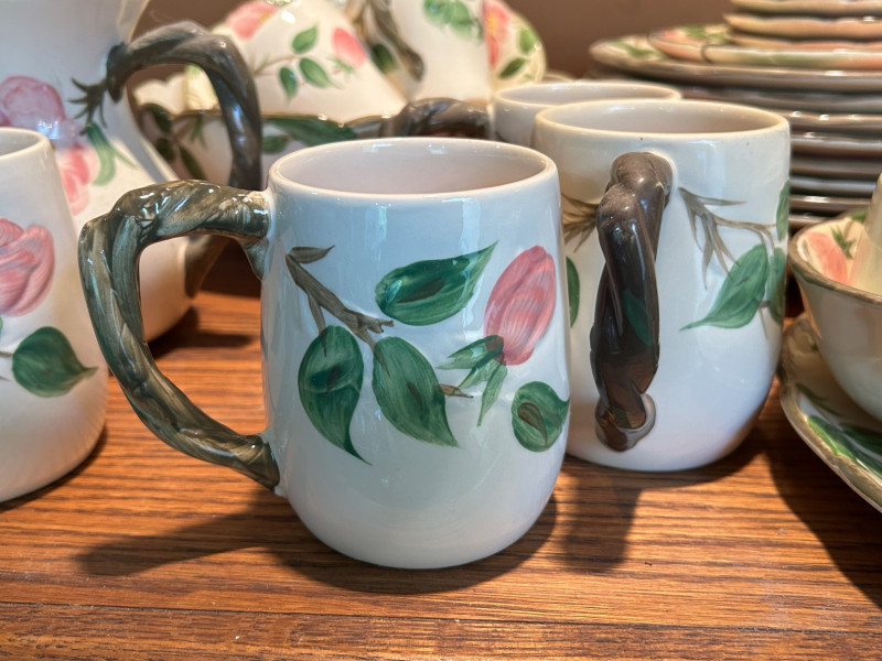 Gladding McBean Franciscan dish set featuring a teapot, teacups with matching saucers, and plates, all decorated in a soft pink‑and‑green floral motif. The sculpted, branch‑style handles and hand‑painted details reflect the classic Franciscan charm and craftsmanship that made the line a mid‑century favorite. This set offers both display appeal and functional use, perfect for collectors of California pottery, vintage tableware enthusiasts, or anyone looking to add a touch of cottage‑style elegance to their kitchen or tea service. Mixed set with multiple dinner plates and fewer salad or bread plates. Serving pieces including a handled bowl with lid.