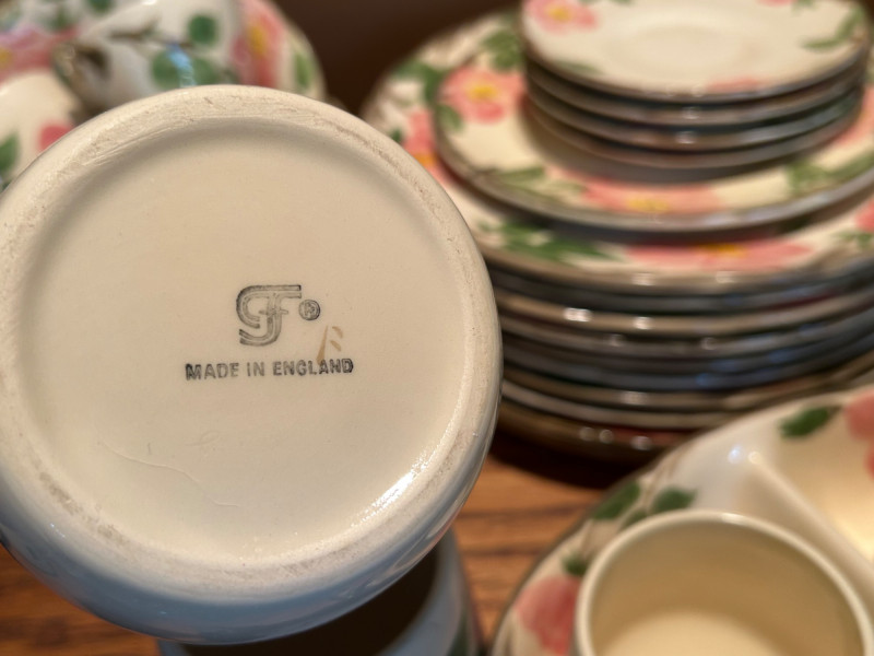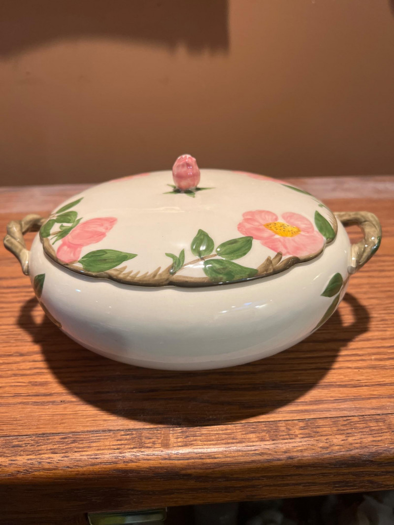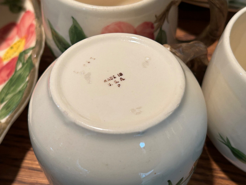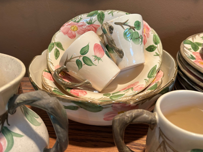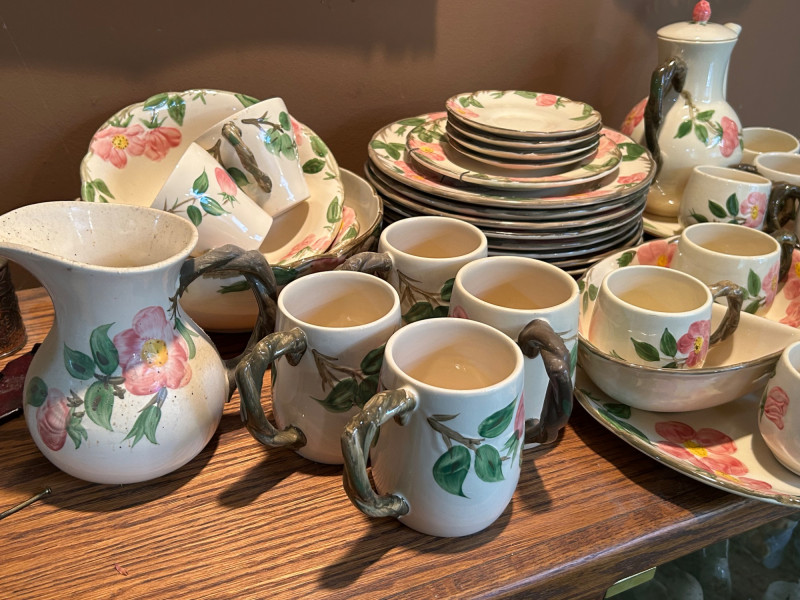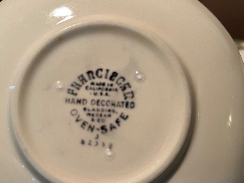 Gladding McBean Franciscan dish set featuring a teapot, teacups with matching saucers, and plates, all decorated in a soft pink‑and‑green floral motif. The sculpted, branch‑style handles and hand‑painted details reflect the classic Franciscan charm and craftsmanship that made the line a mid‑century favorite. This set offers both display appeal and functional use, perfect for collectors of California pottery, vintage tableware enthusiasts, or anyone looking to add a touch of cottage‑style elegance to their kitchen or tea service. Mixed set with multiple dinner plates and fewer salad or bread plates. Serving pieces including a handled bowl with lid.