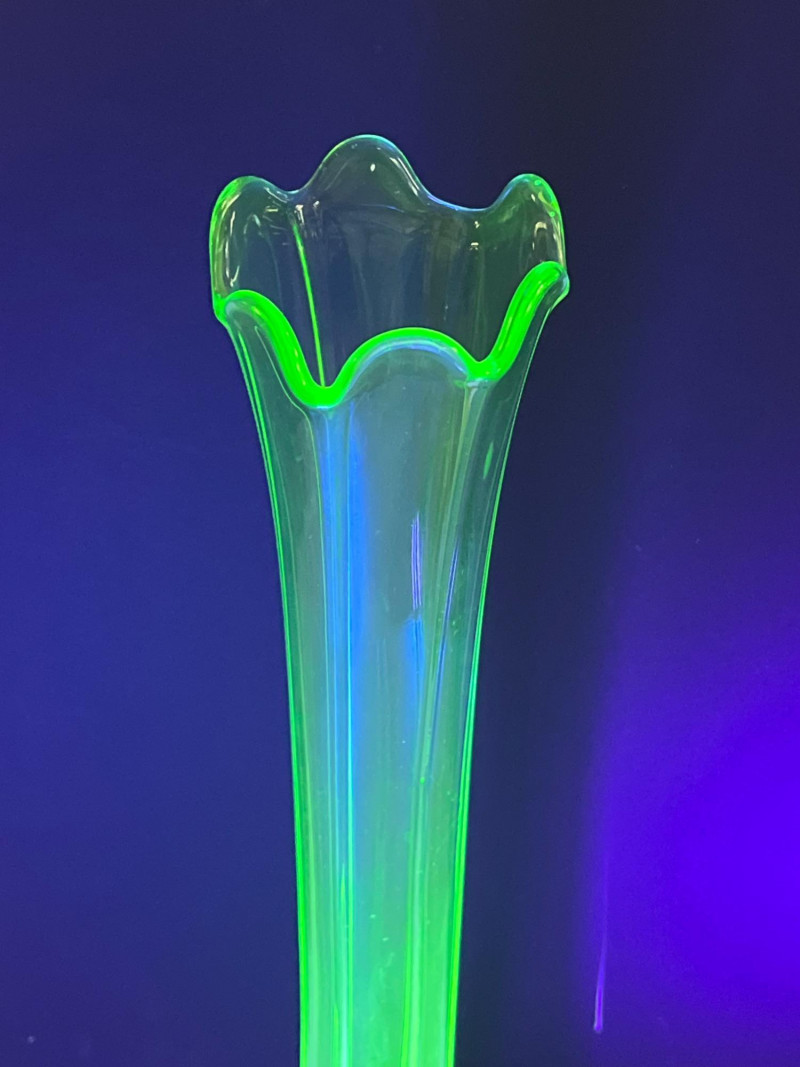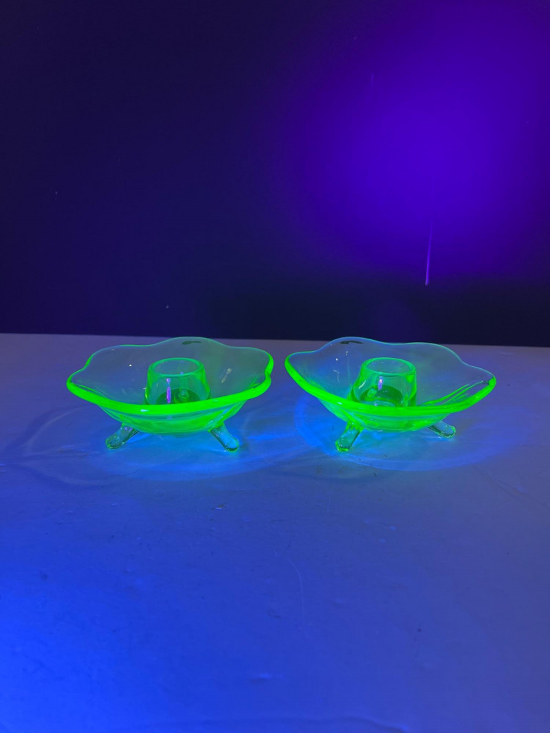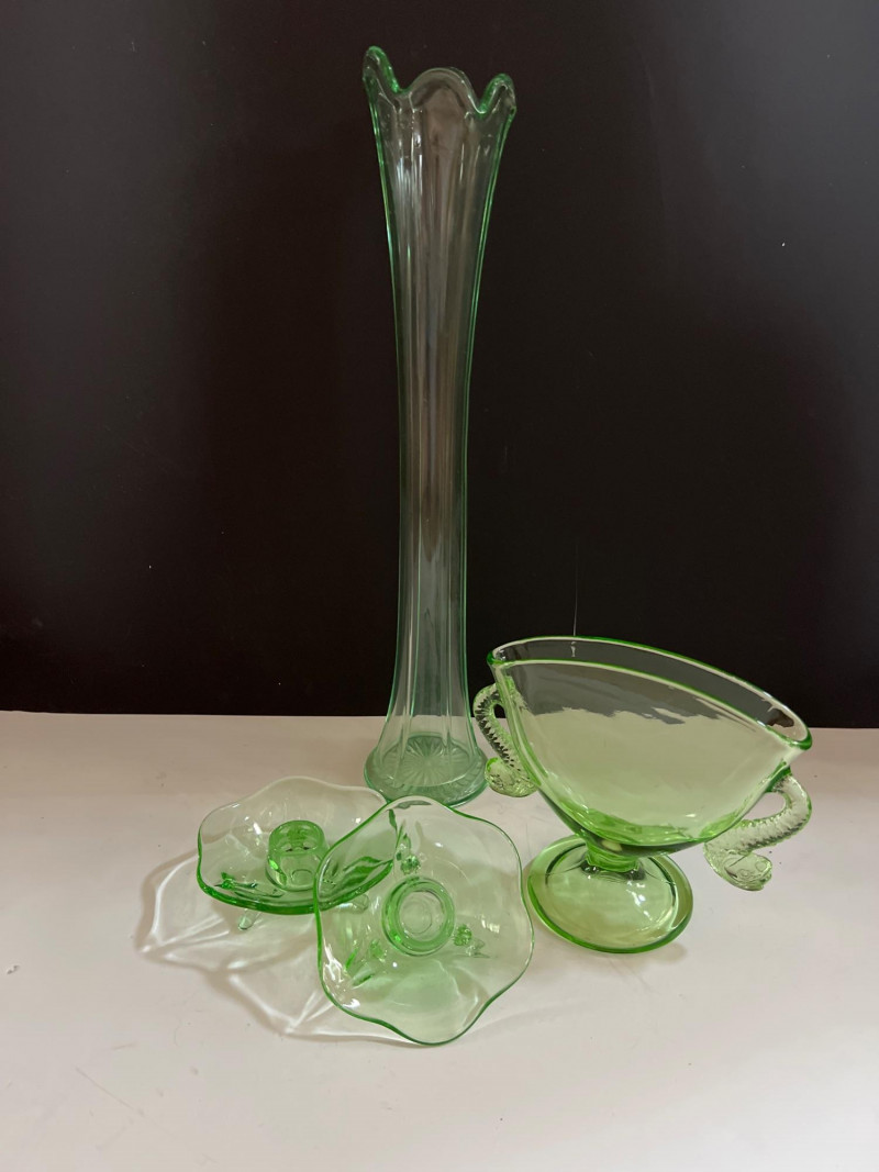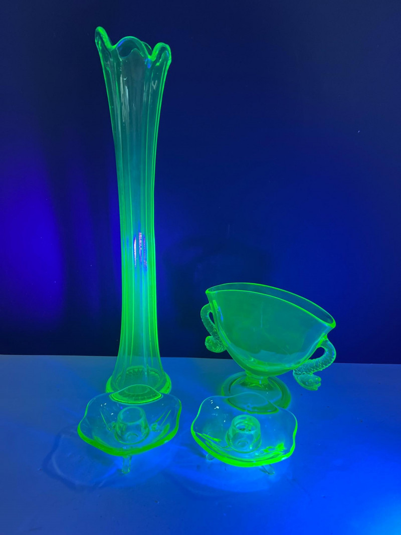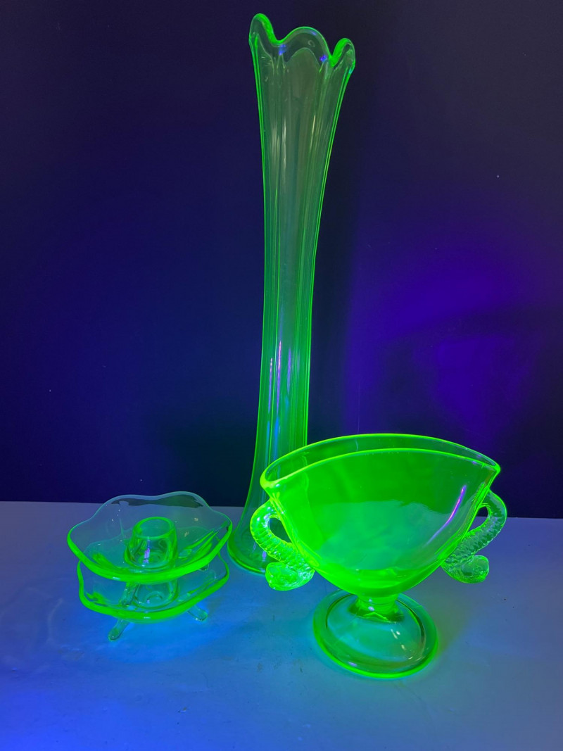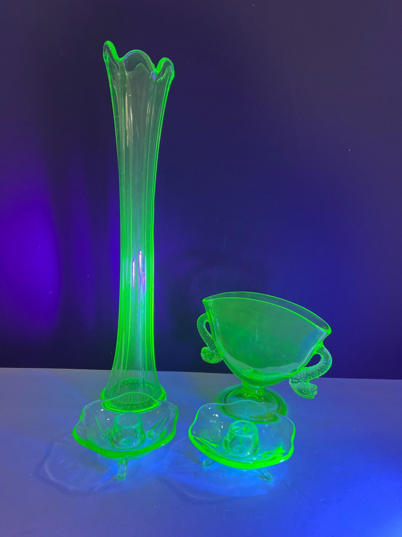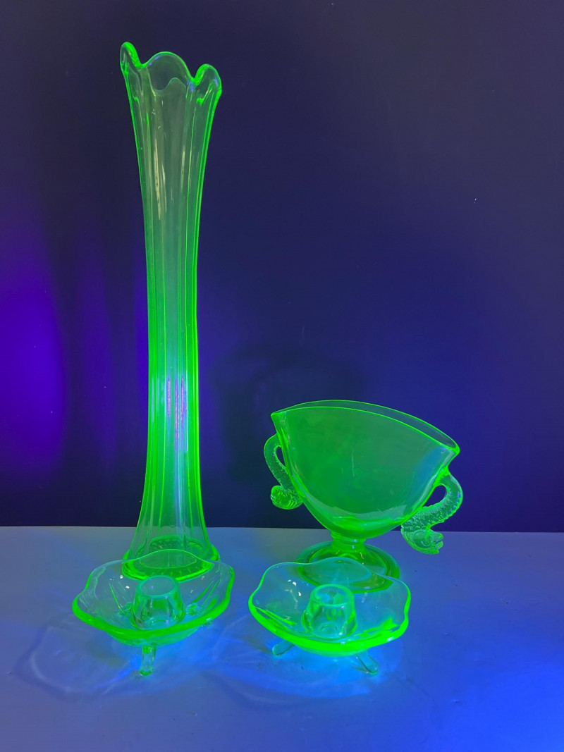 A glowing assortment of uranium green glass, prized for its vivid fluorescent reaction under UV/blacklight. This lot includes a tall fluted vase with a ruffled rim and a pair of matching candle holders, each displaying the unmistakable bright green hue associated with early uranium‑based glass. A striking display group for collectors, decorators, and resellers, offering strong visual impact both in natural light and under UV illumination. Included:
