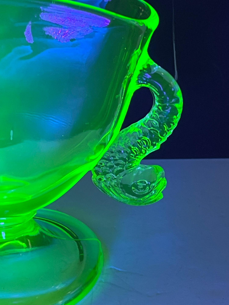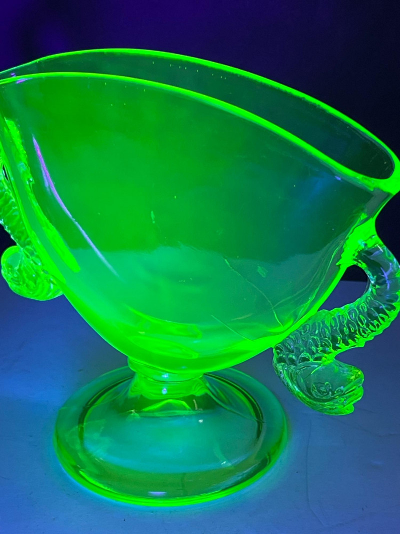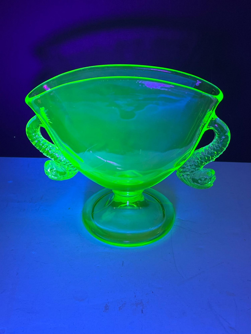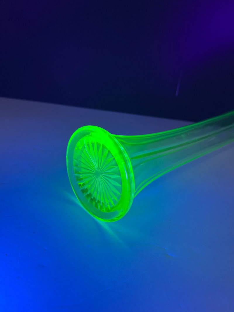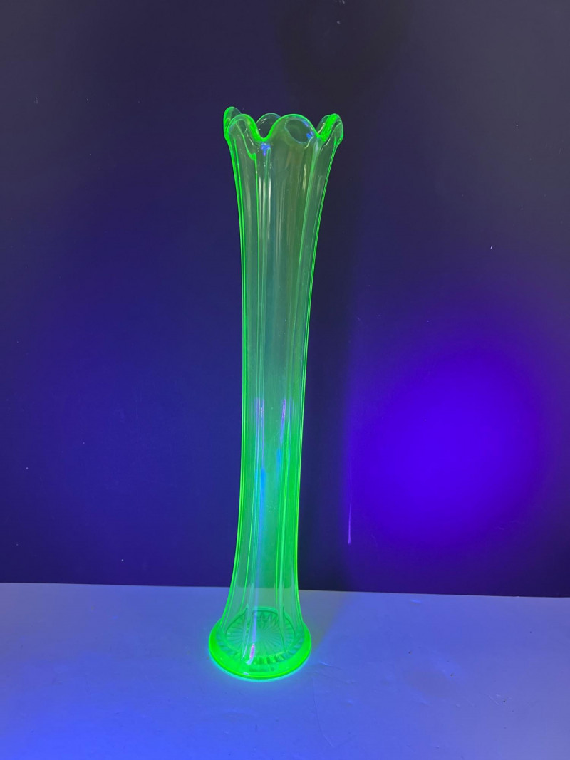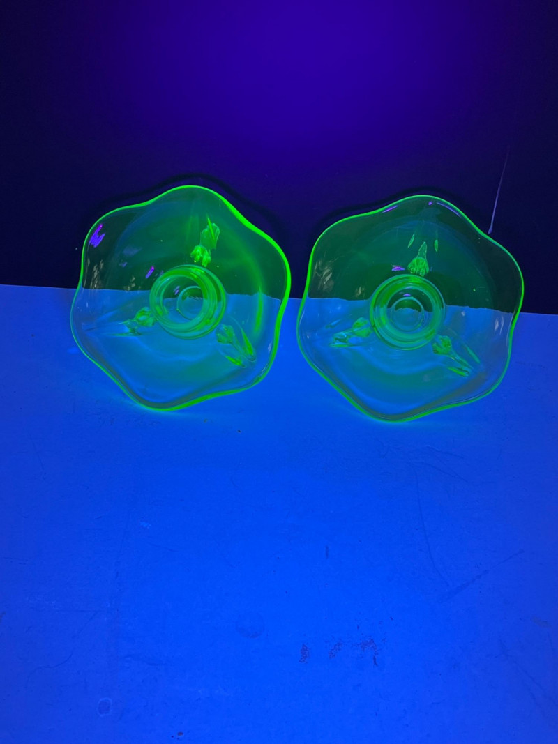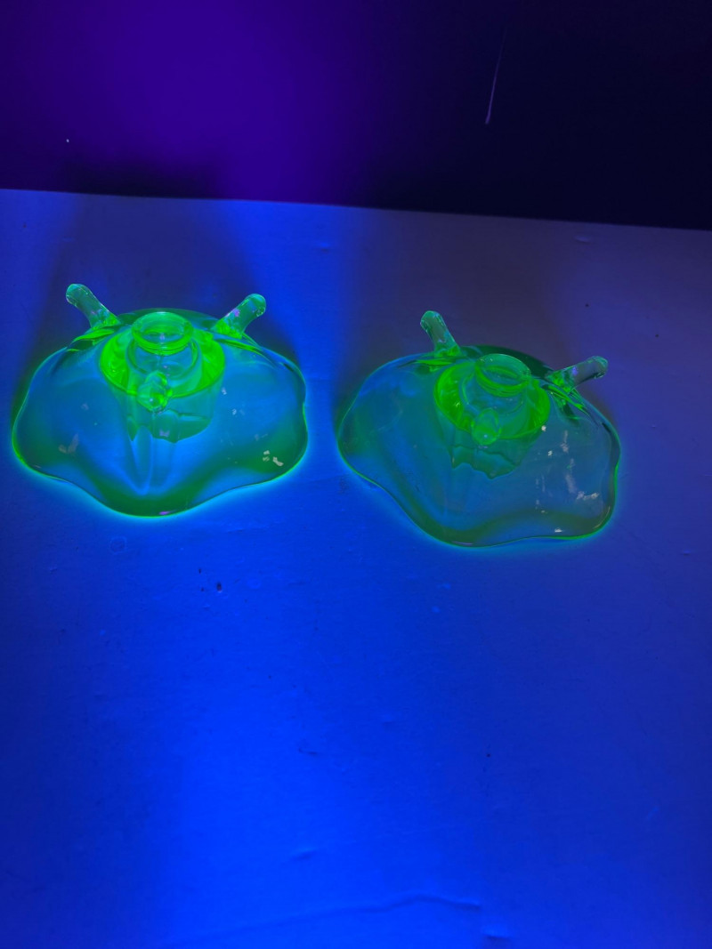 A glowing assortment of uranium green glass, prized for its vivid fluorescent reaction under UV/blacklight. This lot includes a tall fluted vase with a ruffled rim and a pair of matching candle holders, each displaying the unmistakable bright green hue associated with early uranium‑based glass. A striking display group for collectors, decorators, and resellers, offering strong visual impact both in natural light and under UV illumination. Included: