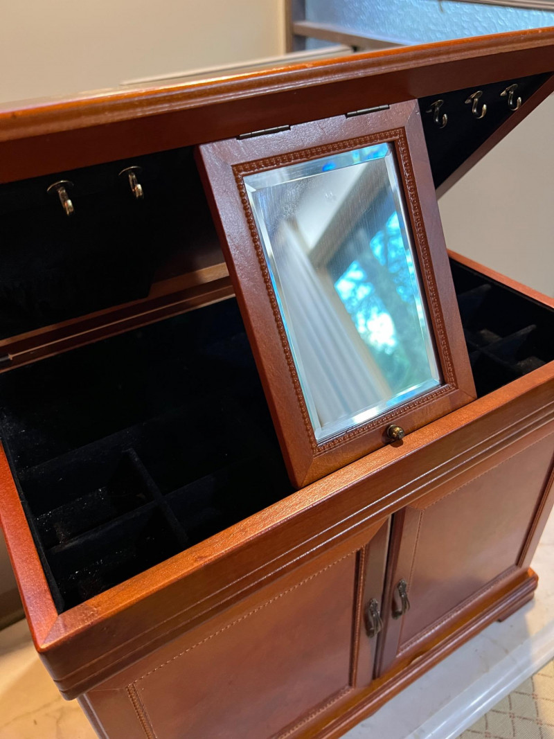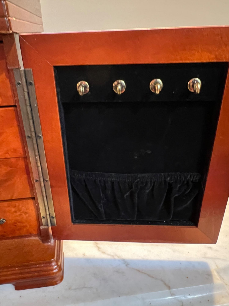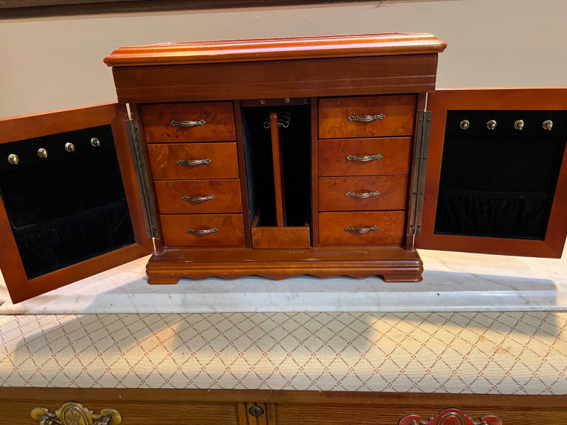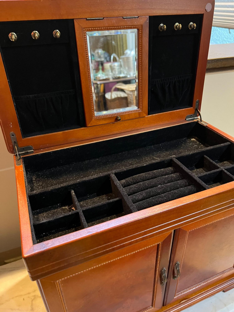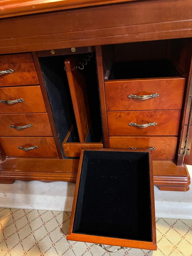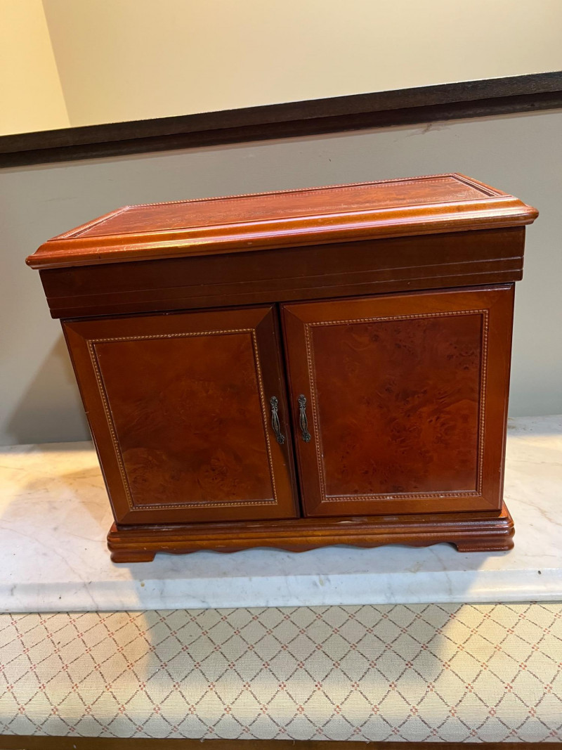 A charming wood armoire‑style tabletop jewelry box featuring multiple storage options and a classic miniature‑furniture silhouette. The piece includes smooth‑gliding drawers for rings, earrings, and small accessories, along with side‑opening doors fitted with interior necklace hooks to keep chains tangle‑free. Its warm wood finish and traditional design make it both functional and decorative — perfect for vanity tops, dresser styling, or gifting. Ideal for collectors of jewelry chests, organizers, or vintage‑inspired décor.