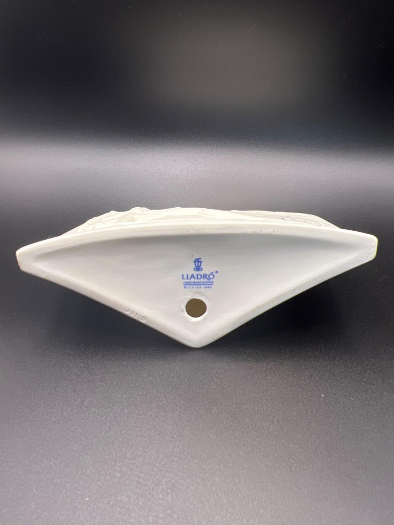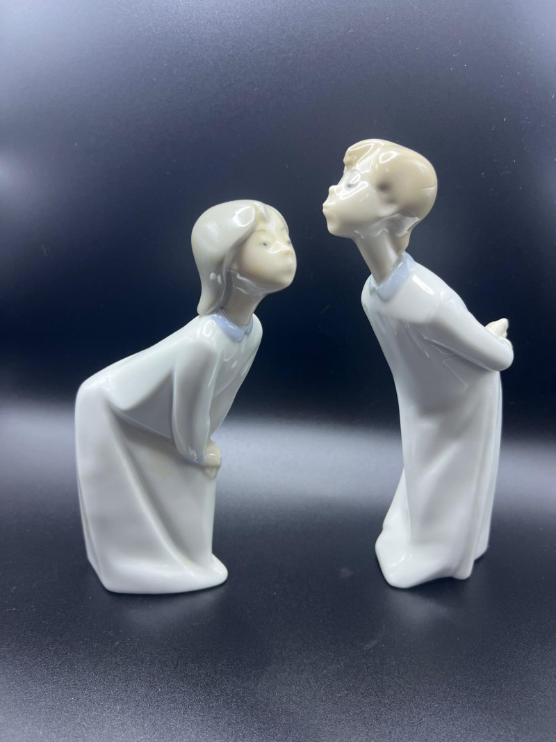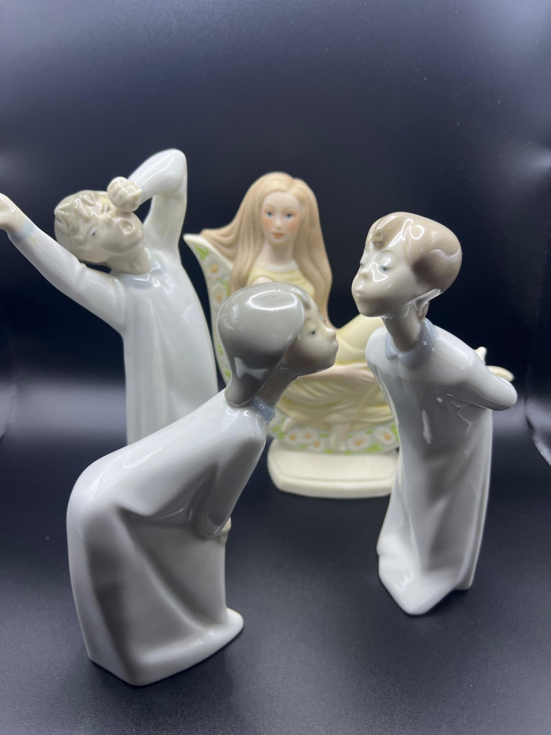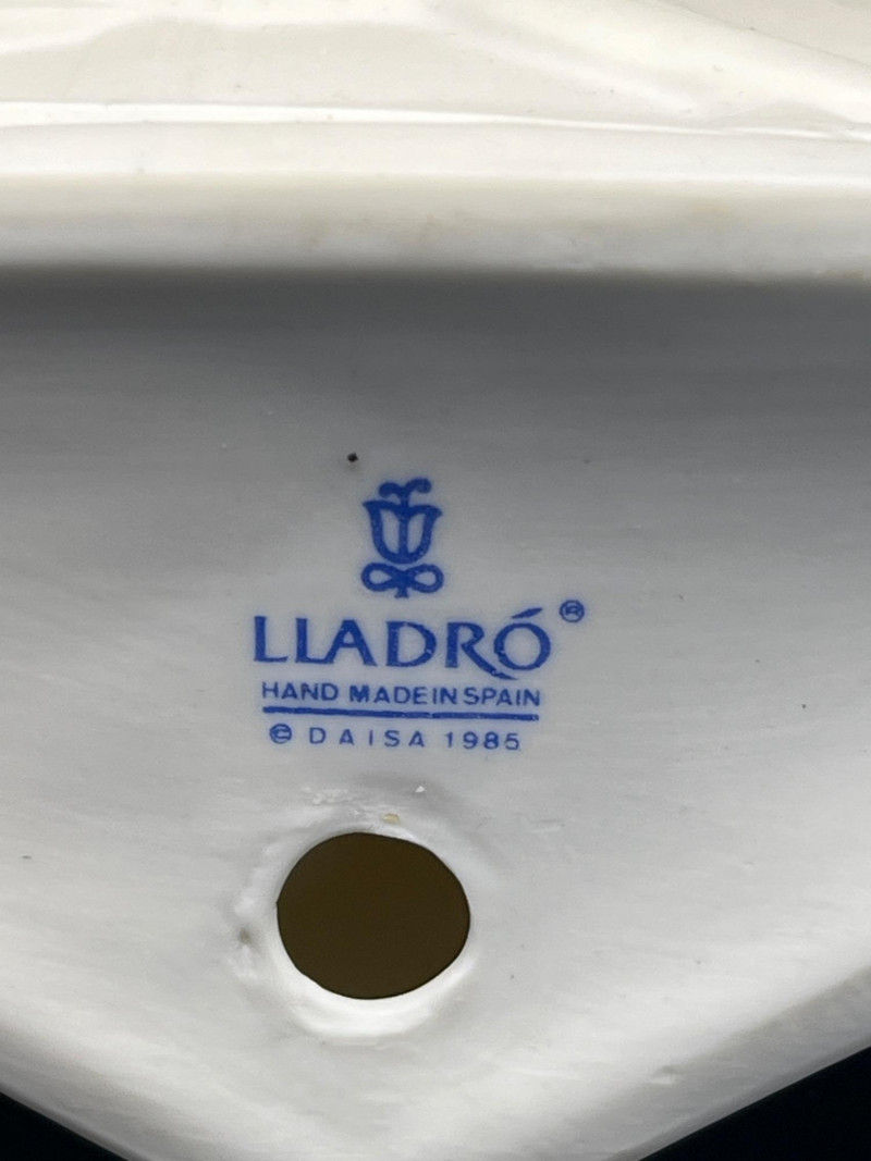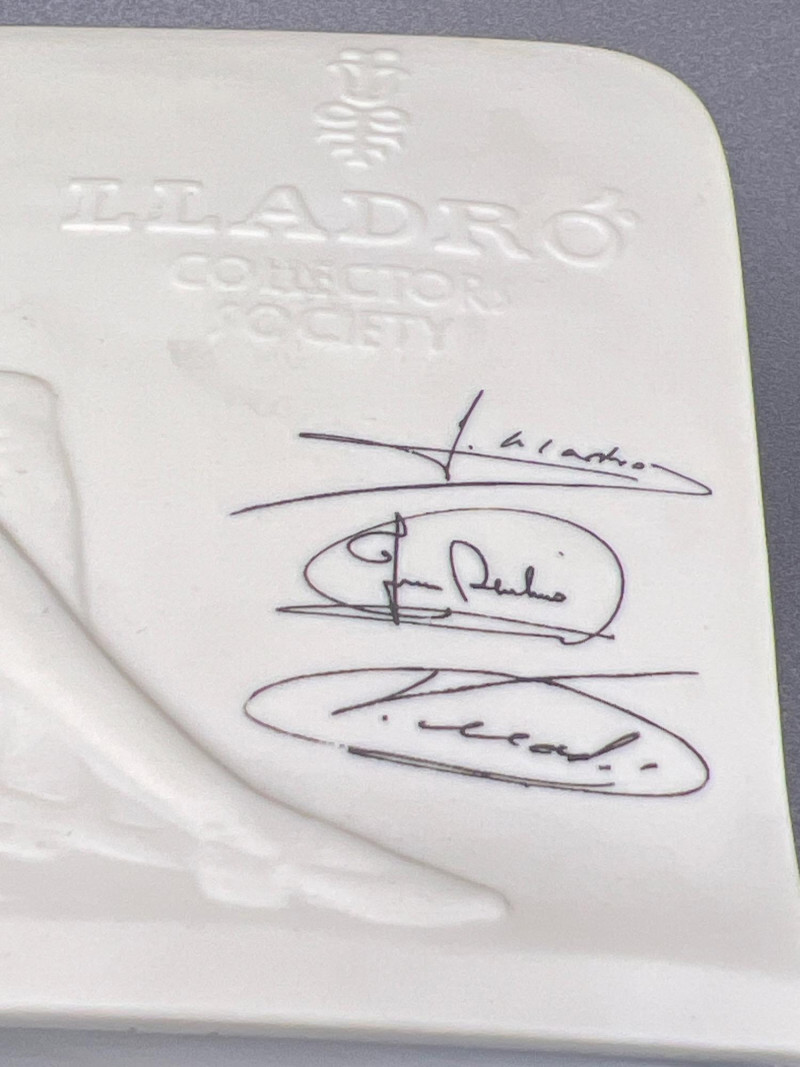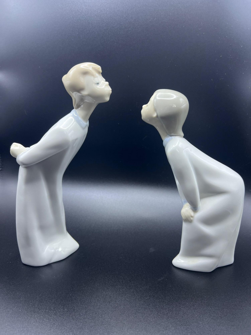 A beautiful grouping of fine porcelain figurines, featuring authentic Lladró children, a signed Lladró Collectors Society plaque, and a striking Ispanky sculpture. Included are: Lladró Boy & Girl Leaning Forward (Kissing Pose) — A charming paired display from Lladró’s Children/Youth series, each child leaning forward with hands behind their back, crafted with the soft pastel palette and expressive innocence characteristic of Lladró’s early work. Lladró Yawning/Stretching Boy — A delightful figure depicting a sleepy child mid‑stretch, capturing motion and personality with Lladró’s signature smooth glazing and gentle detailing. Ispanky “Awakening” Figurine — A dramatic and expressive sculpt by Laszlo Ispanky, known for his elegant forms and emotional presence. This piece adds artistic contrast to the softer Lladró children. Lladró Collectors Society Standing Plaque (Signed) — A porcelain membership plaque featuring the classic Lladró bellflower emblem, signed and designed for display, adding collectible value to the lot. Together, these pieces create a refined blend of whimsy, artistry, and collectible prestige, ideal for Lladró enthusiasts, porcelain collectors, or decorative display.