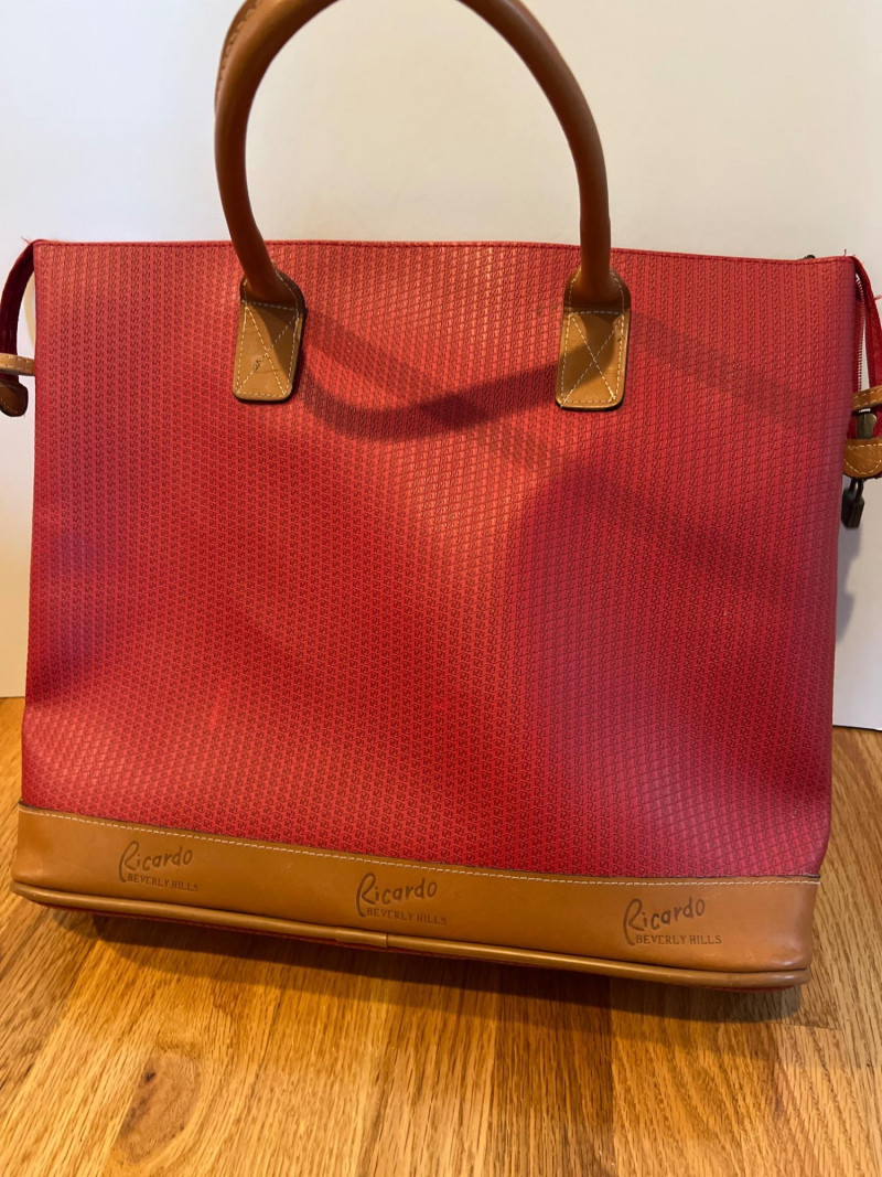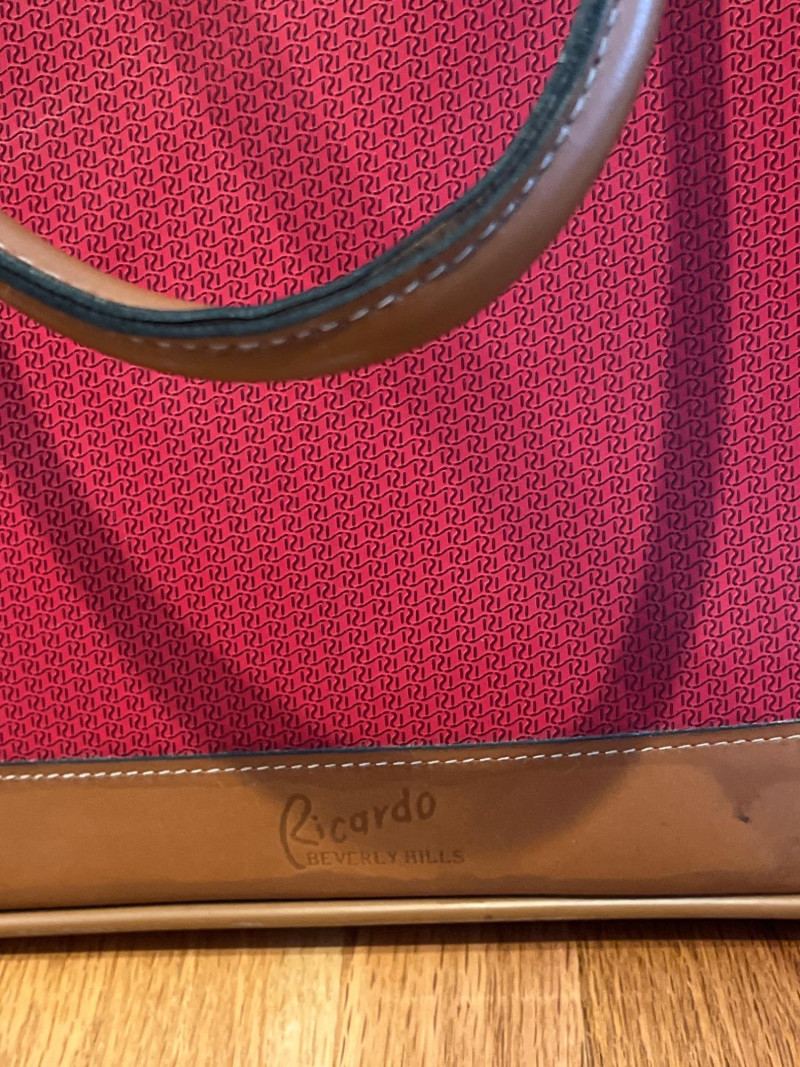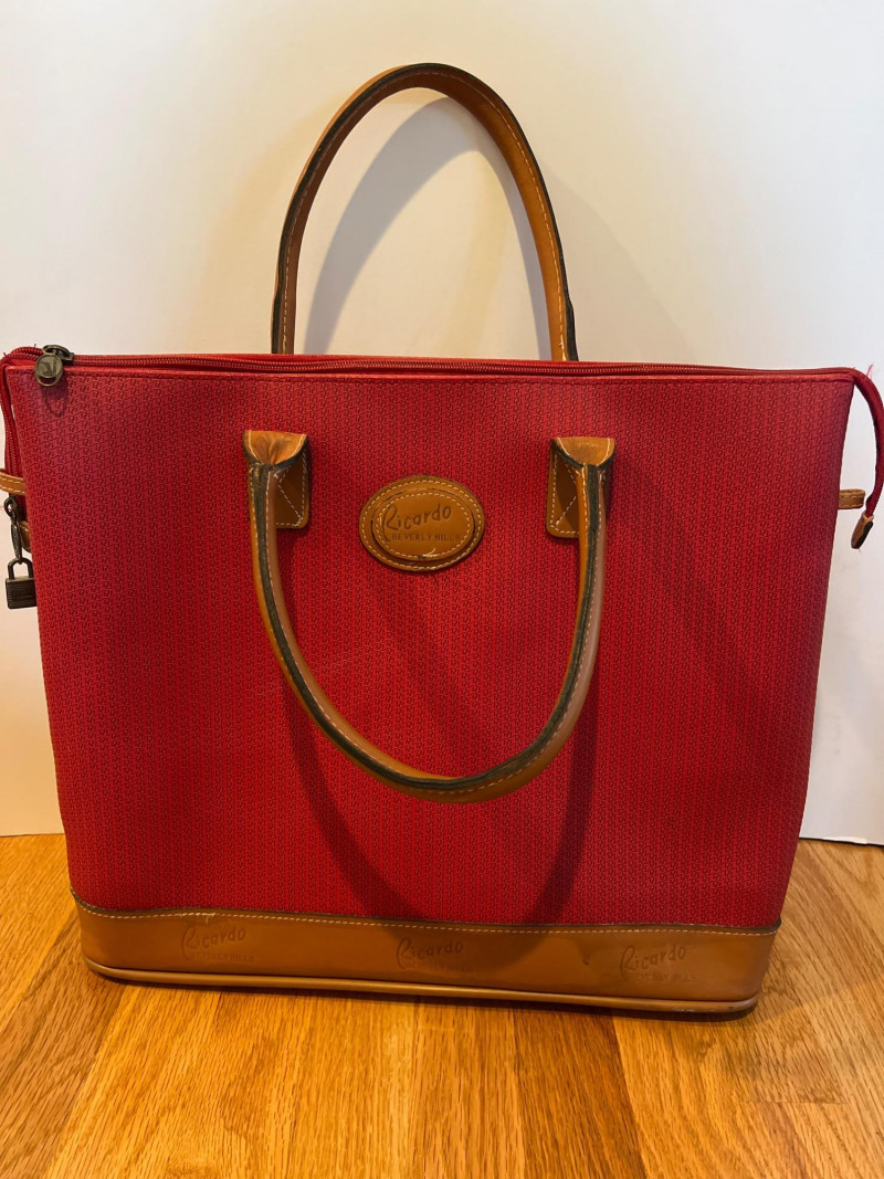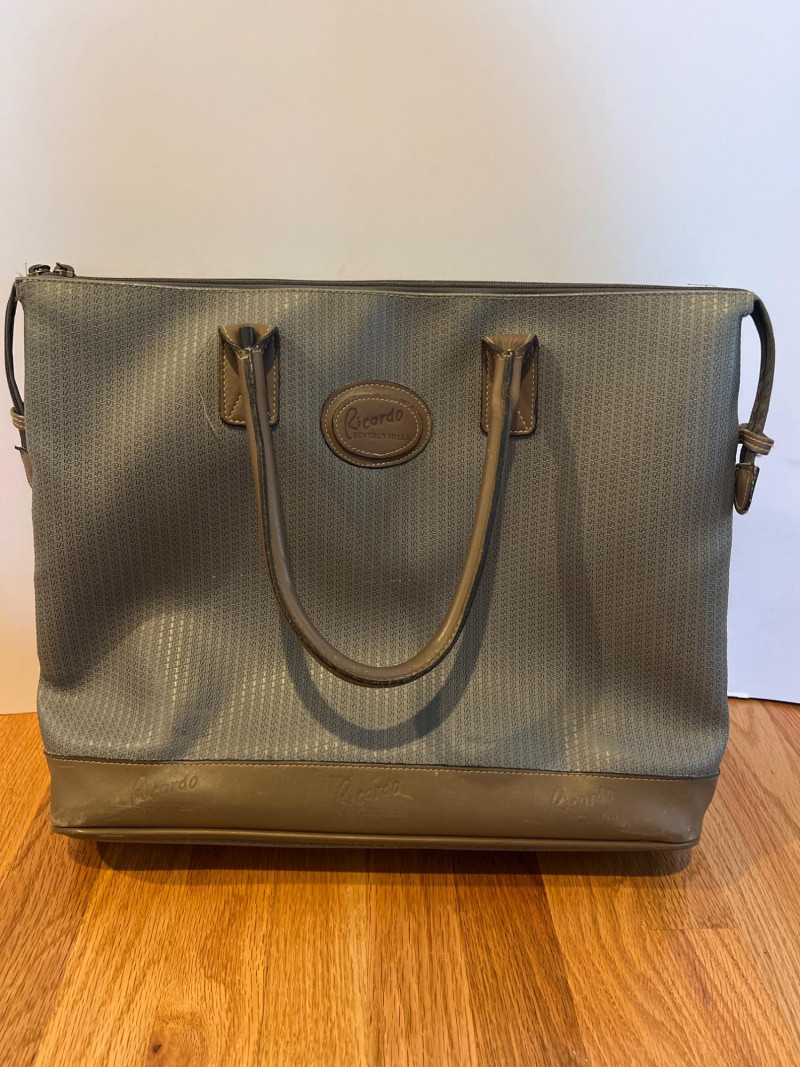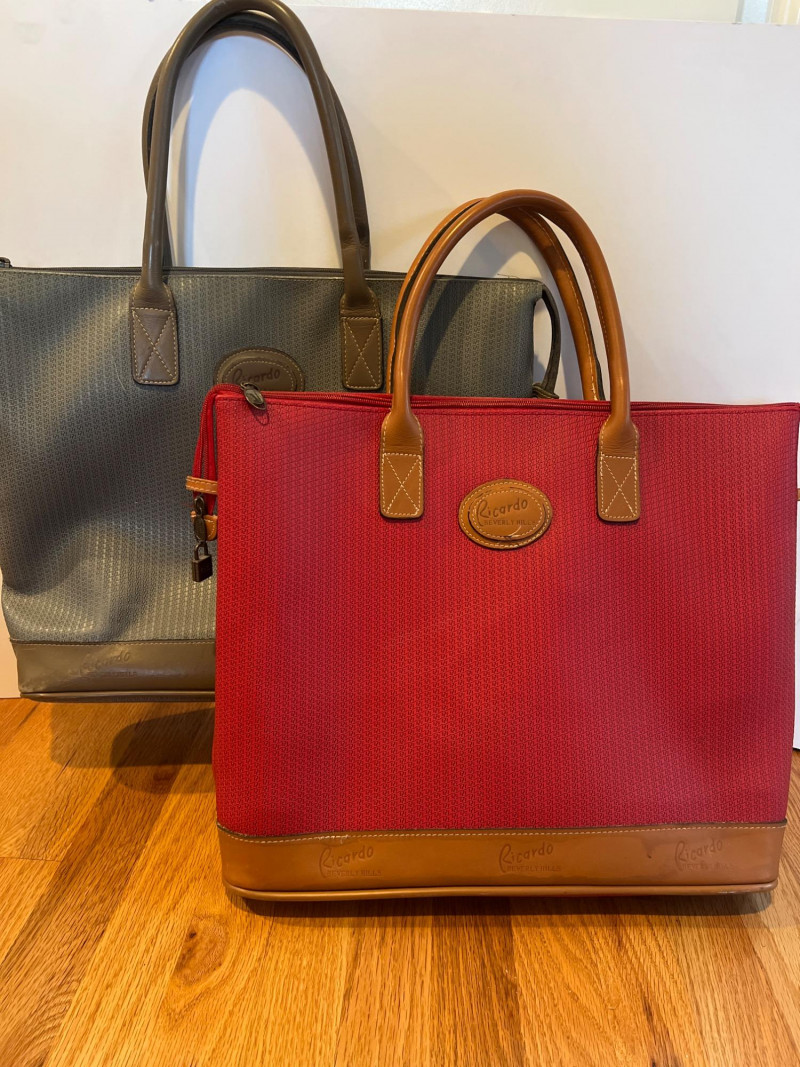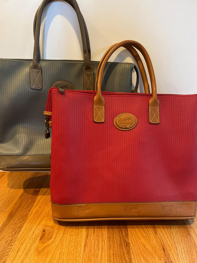 A pair of vintage Ricardo Beverly Hills travel bags, known for their durable construction and classic styling. These soft‑sided pieces feature coordinated fabric, structured forms, and practical interior compartments designed for efficient packing. Ideal for collectors of retro luggage, prop use, décor staging, or everyday travel with a nostalgic twist. Their timeless look and sturdy build make them a versatile addition for resellers or anyone who appreciates well‑made vintage travel gear.