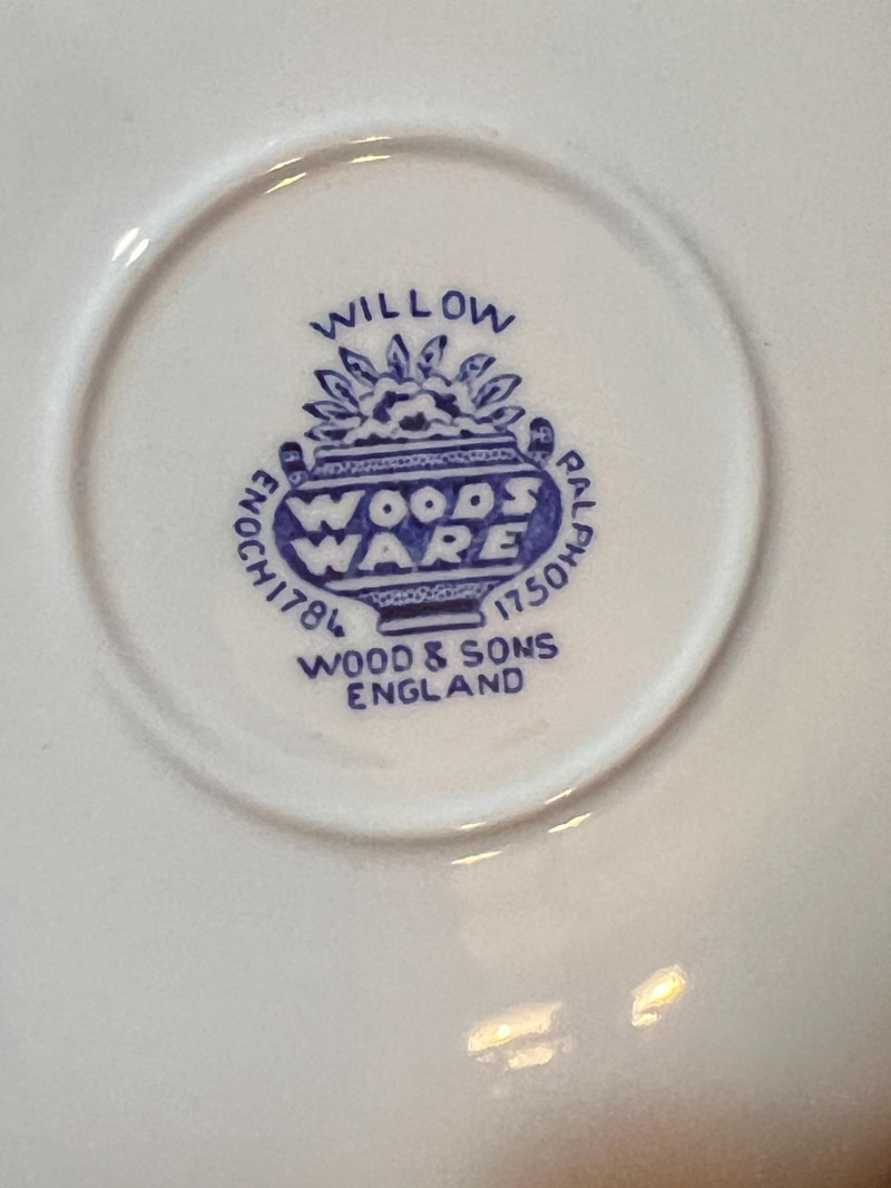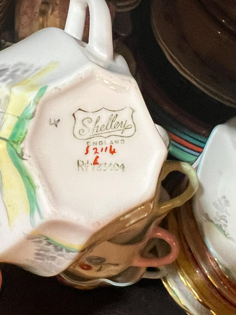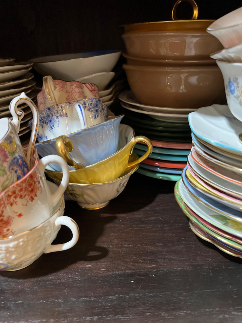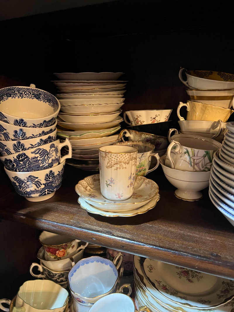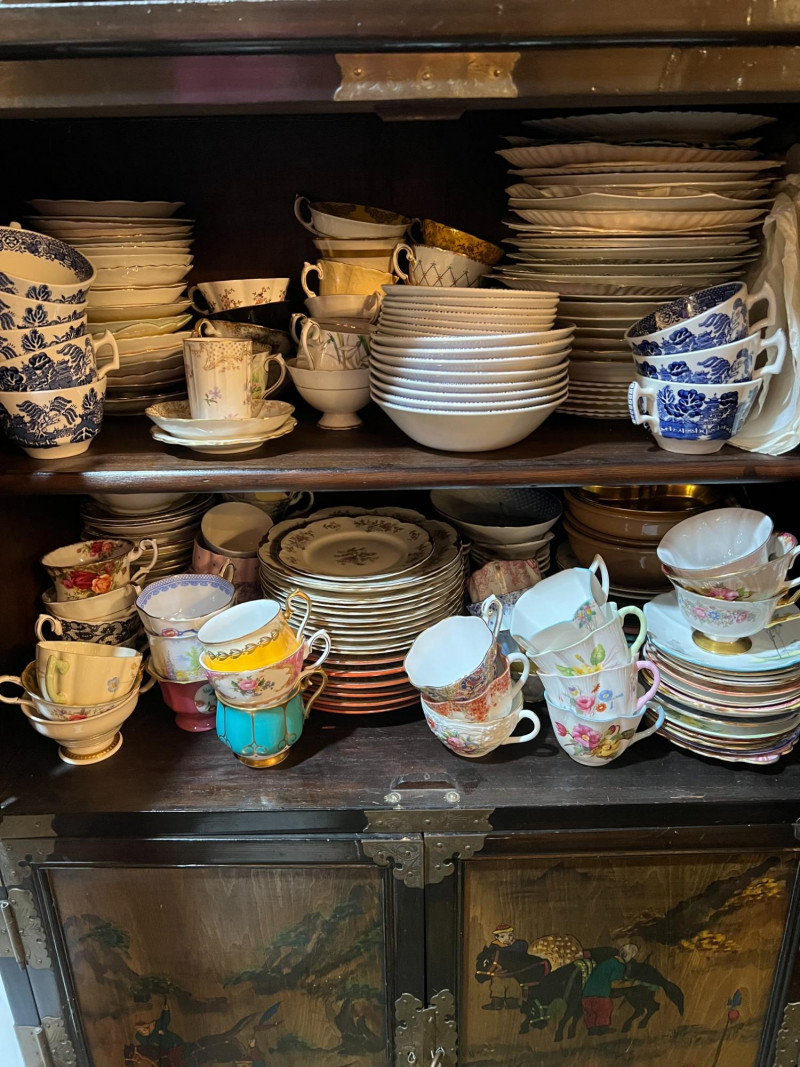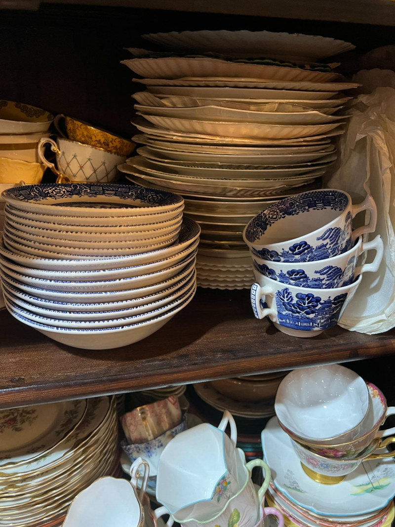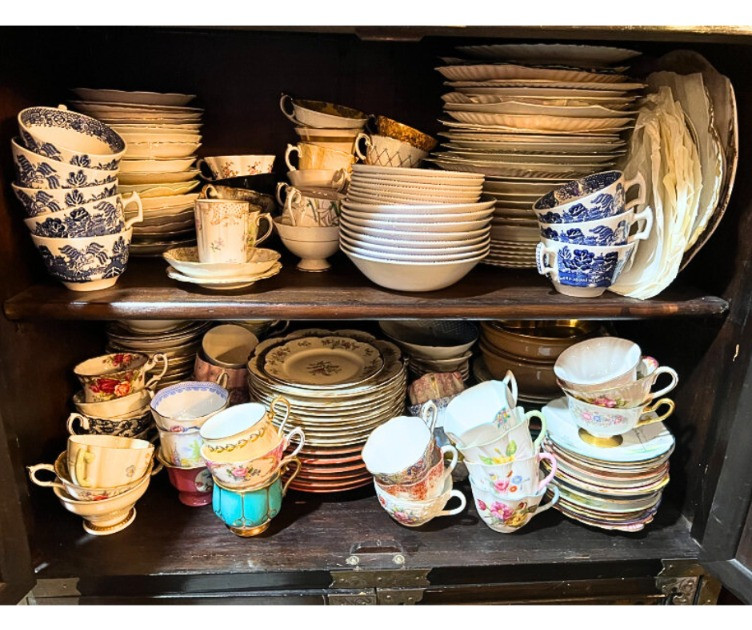 Everything in cabinet - two shelves of vintage and antique porcelain and pottery tableware. A varied collection of porcelain tea cups, saucers, and dessert-style plates, featuring well-known makers and patterns including Royal Albert, Moss Rose, Woods Ware Willow, and Fiesta in assorted colors. This lot offers a mix of classic English floral designs, timeless blue-and-white willow ware, and the bold, colorful Fiesta line. Together, they present a versatile assortment ideal for collectors, decorators, or resellers seeking inventory with strong name recognition and cross-market appeal. Perfect for resale in smaller sets or as individual pieces, this grouping combines elegance, nostalgia, and practical tableware charm.