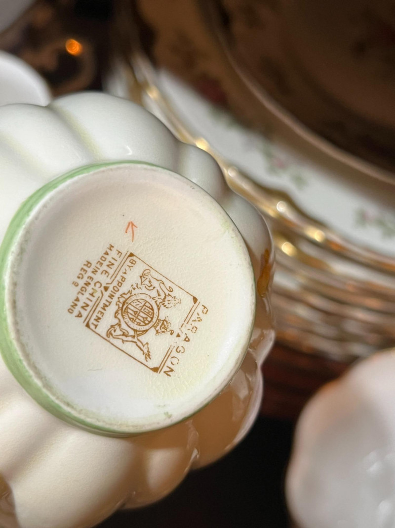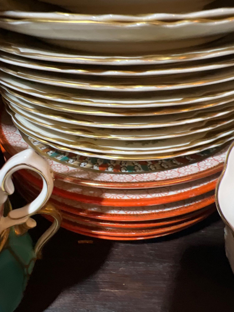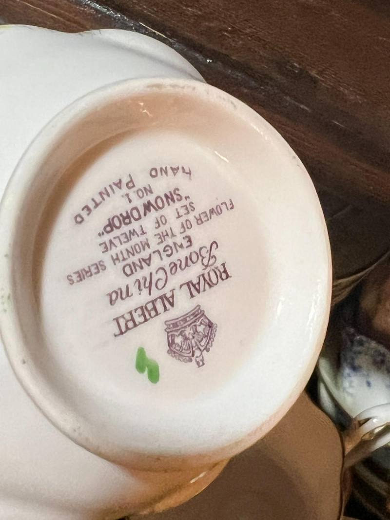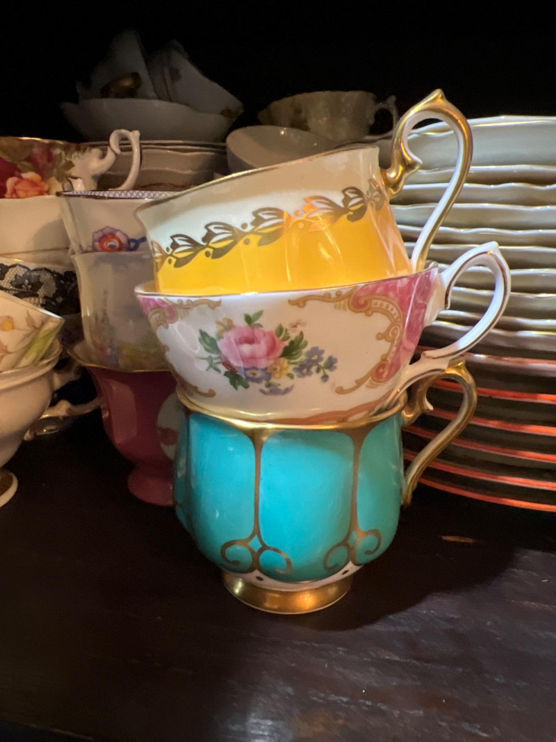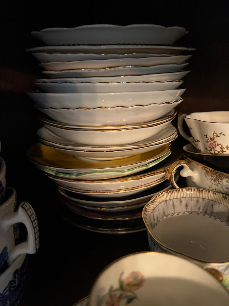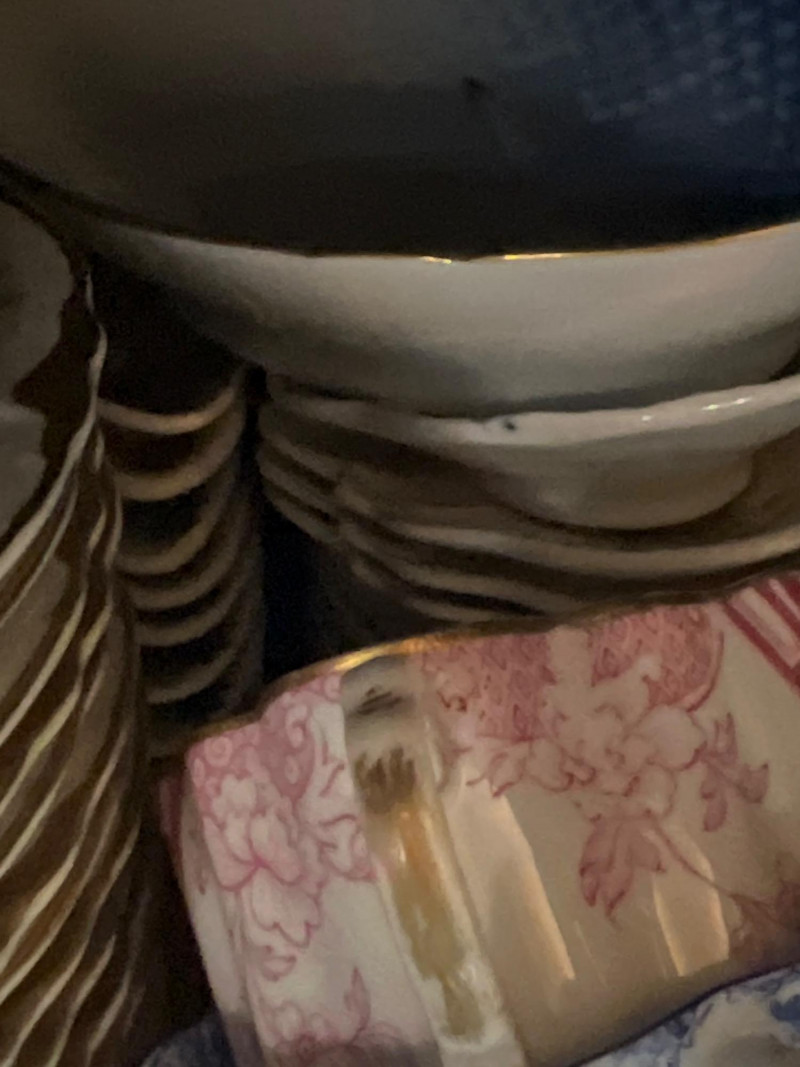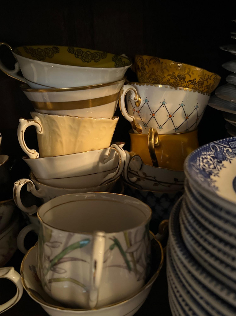 Everything in cabinet - two shelves of vintage and antique porcelain and pottery tableware. A varied collection of porcelain tea cups, saucers, and dessert-style plates, featuring well-known makers and patterns including Royal Albert, Moss Rose, Woods Ware Willow, and Fiesta in assorted colors. This lot offers a mix of classic English floral designs, timeless blue-and-white willow ware, and the bold, colorful Fiesta line. Together, they present a versatile assortment ideal for collectors, decorators, or resellers seeking inventory with strong name recognition and cross-market appeal. Perfect for resale in smaller sets or as individual pieces, this grouping combines elegance, nostalgia, and practical tableware charm.