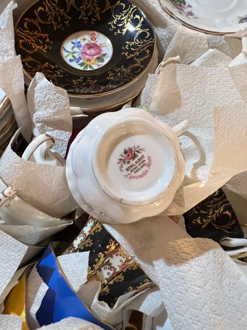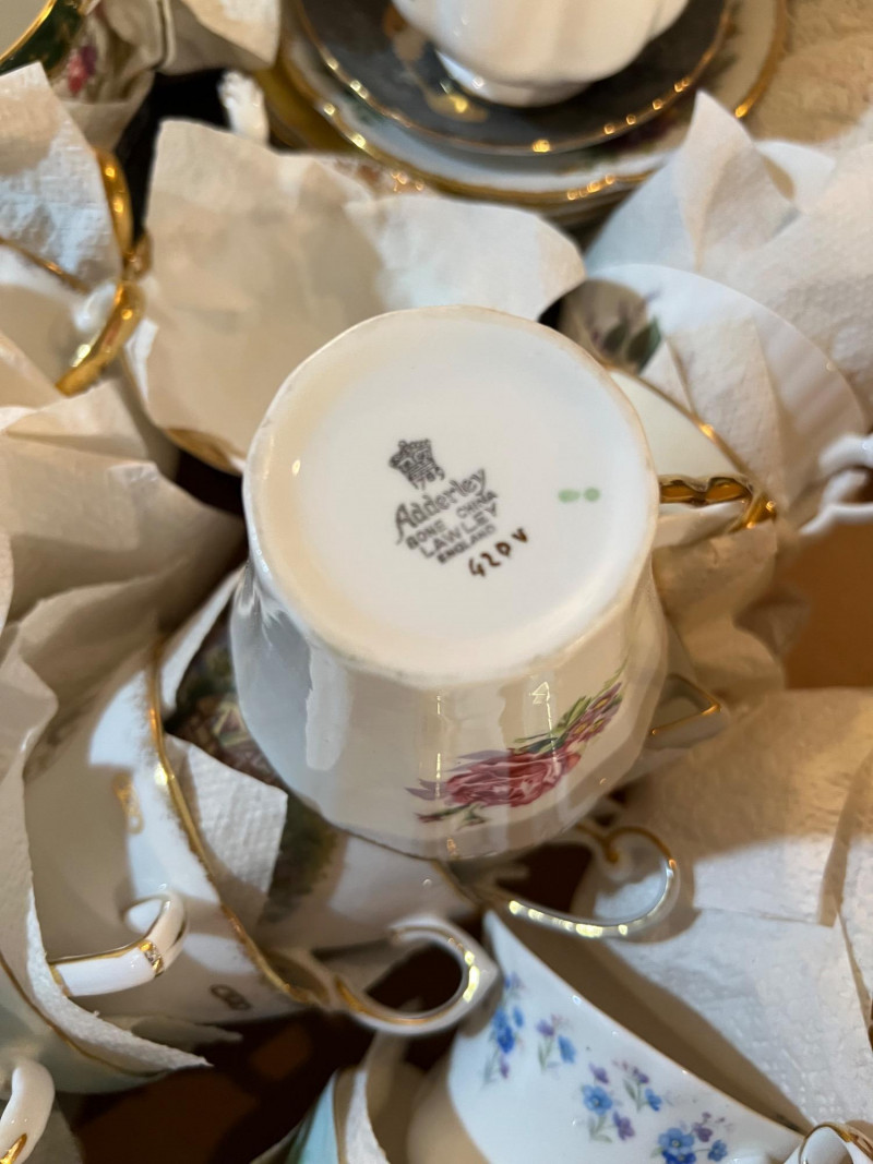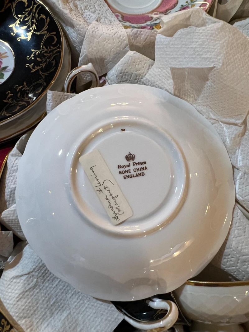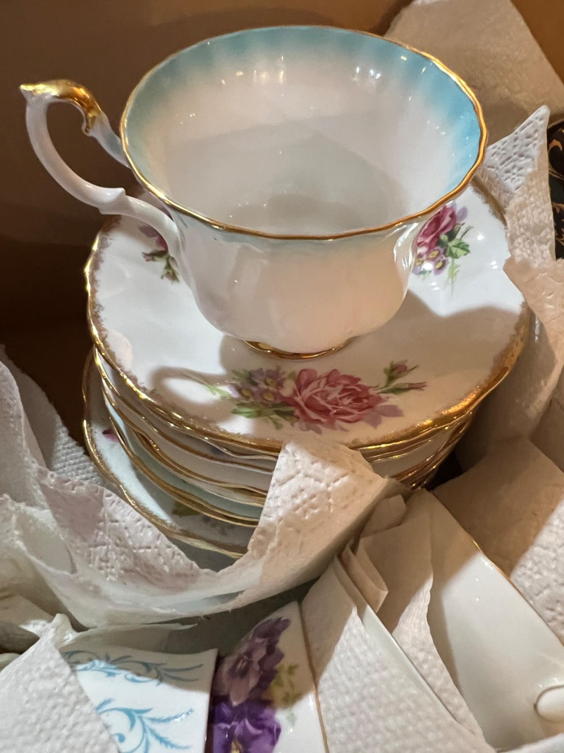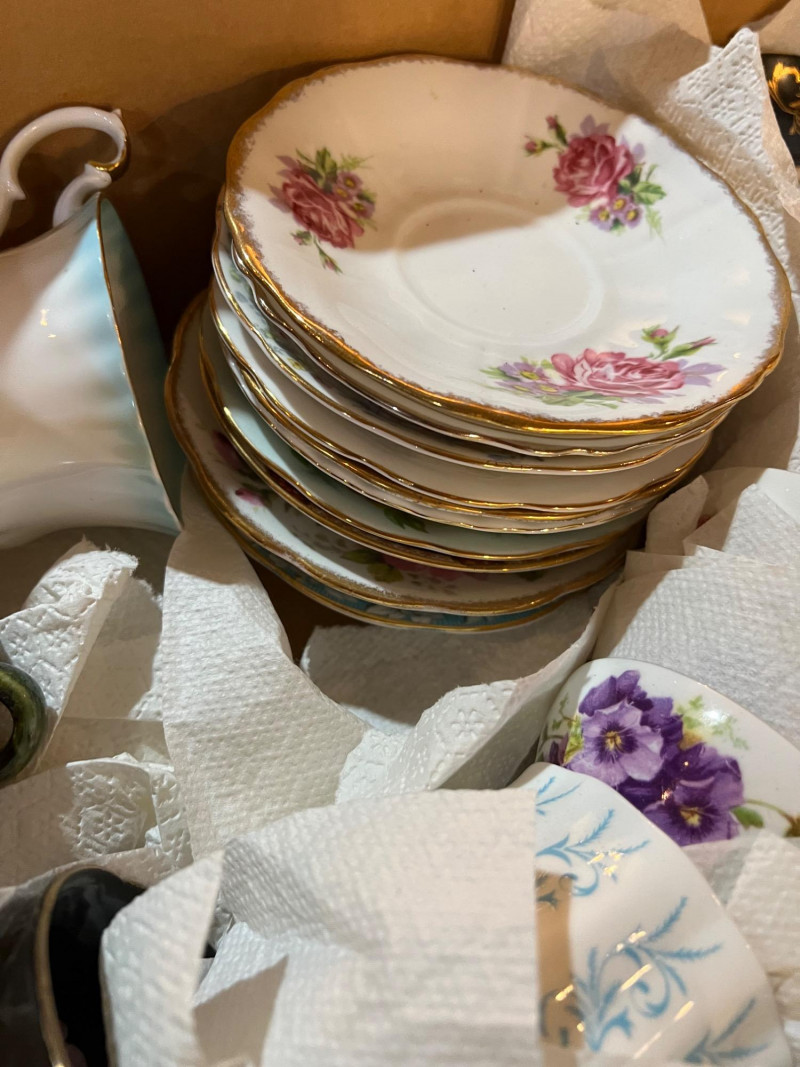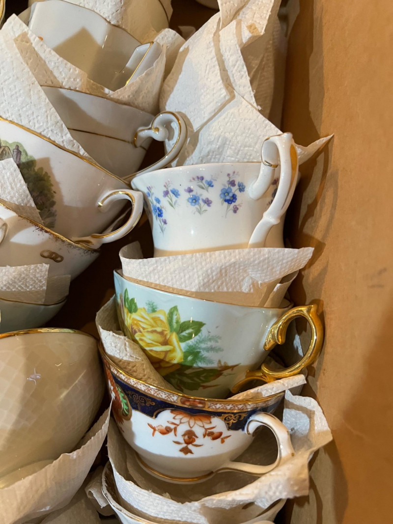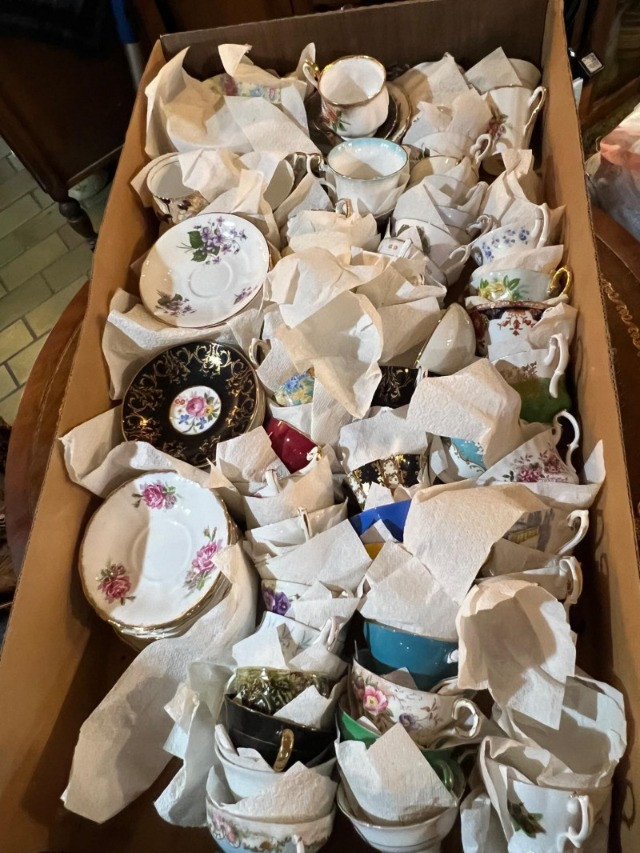 A long storage box filled with assorted tea cups and saucers, offered as is. At a glance, several cups appear to have matching saucers, though the set has not been fully sorted or paired. This lot presents an opportunity for collectors, resellers, or decorators to uncover complete sets and unique patterns within the assortment. The variety of designs and potential matches make this box a treasure hunt for vintage porcelain enthusiasts. Perfect for resale in smaller groupings, or for creative display projects that highlight mismatched charm.