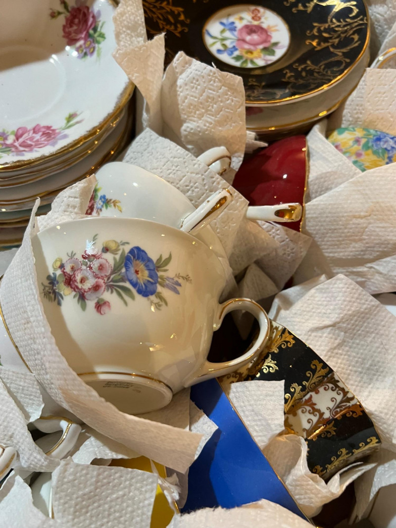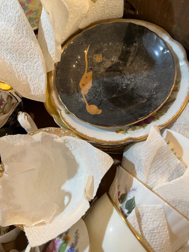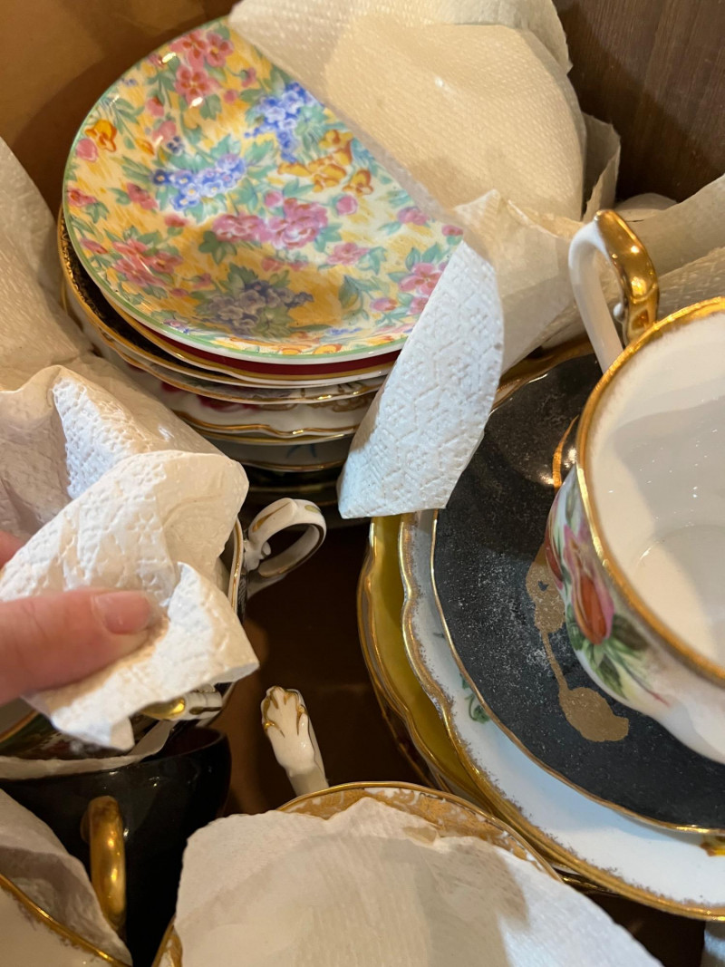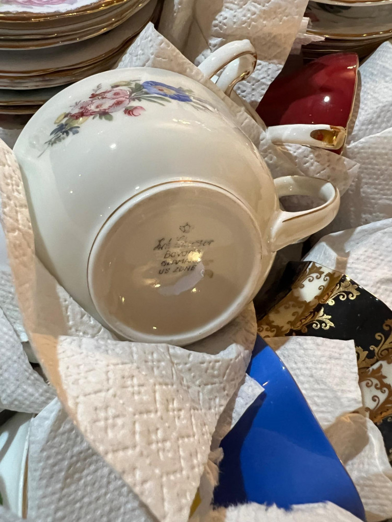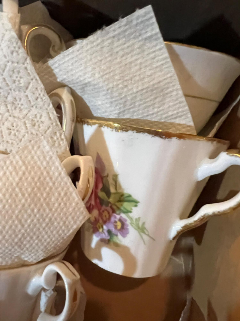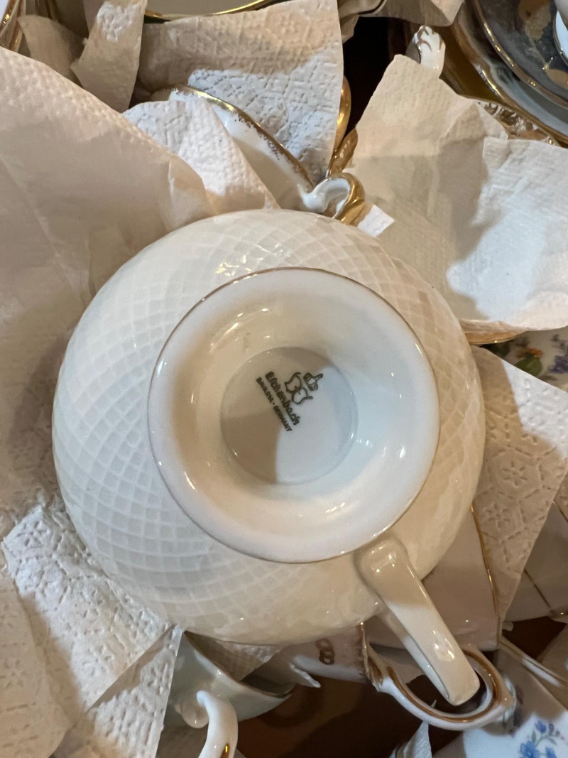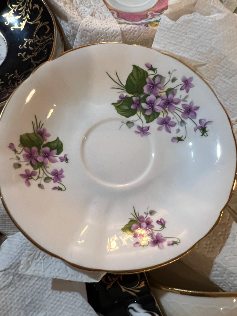 A long storage box filled with assorted tea cups and saucers, offered as is. At a glance, several cups appear to have matching saucers, though the set has not been fully sorted or paired. This lot presents an opportunity for collectors, resellers, or decorators to uncover complete sets and unique patterns within the assortment. The variety of designs and potential matches make this box a treasure hunt for vintage porcelain enthusiasts. Perfect for resale in smaller groupings, or for creative display projects that highlight mismatched charm.