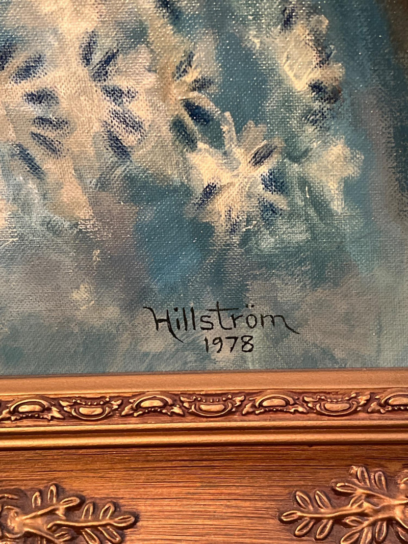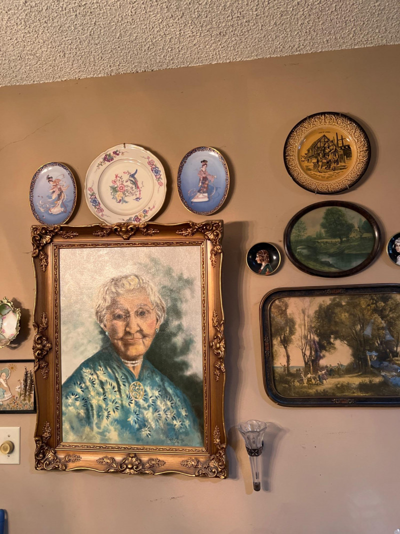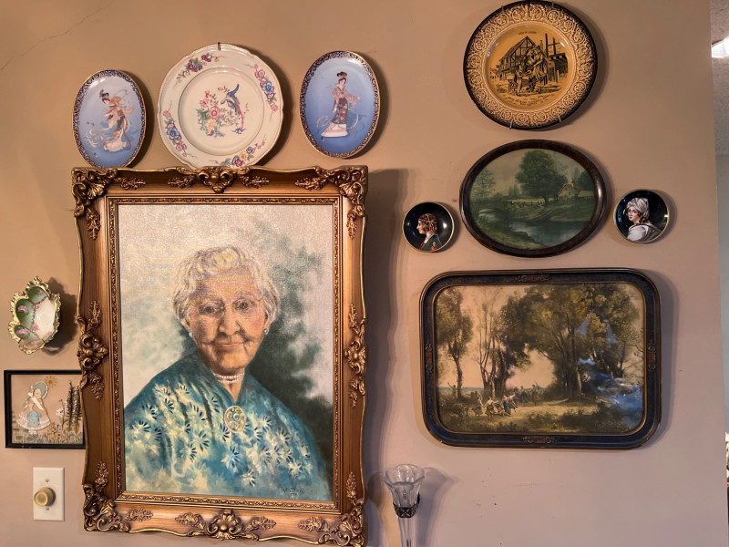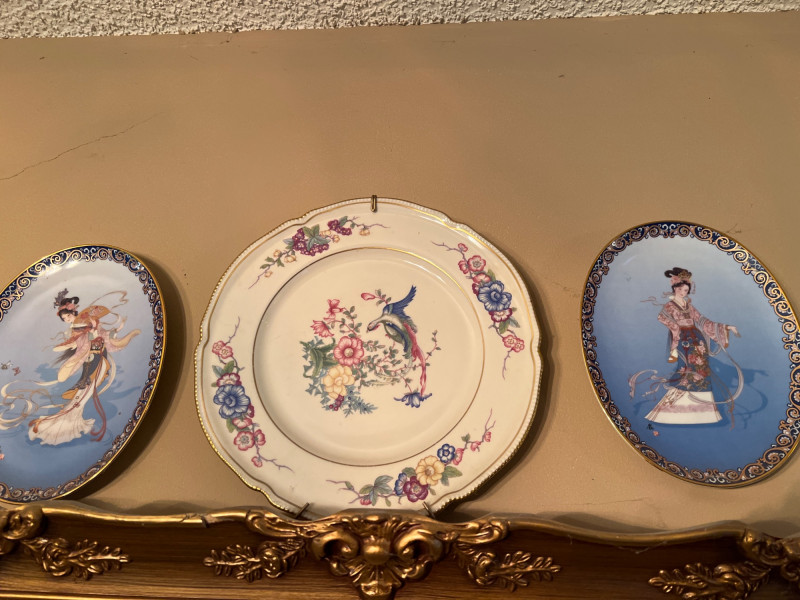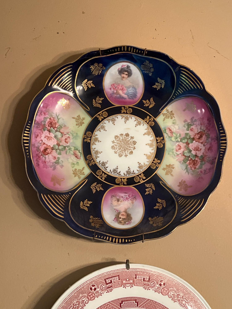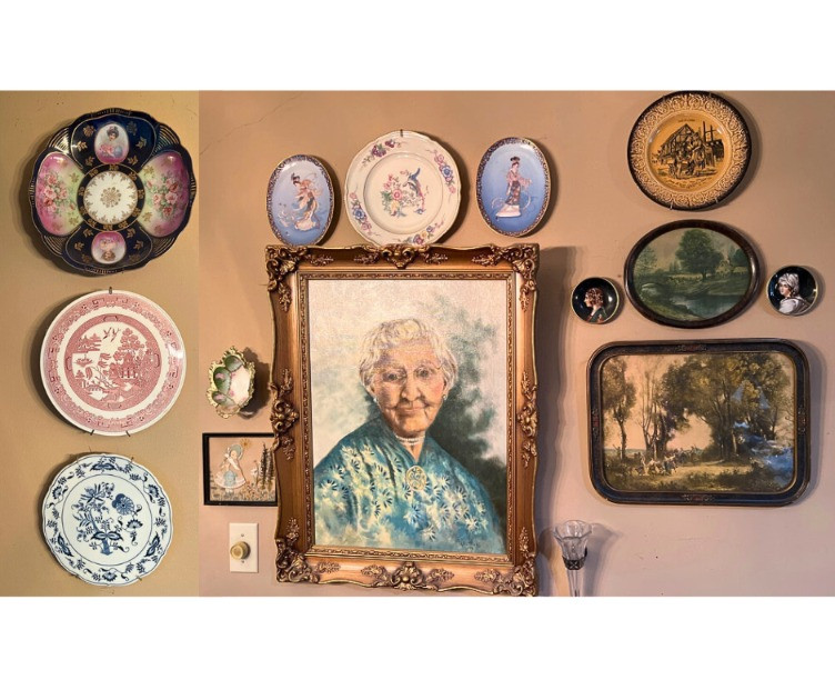 An as-is wall filled with a variety of decorative collectible porcelain plates alongside assorted framed artwork. The porcelain plates showcase a variety of themes — floral, scenic, commemorative, and seasonal — with intricate designs and gold accents typical of mid- to late-20th century collectibles. Complementing the plates are framed prints and artworks in various sizes and styles, creating a visually rich and cohesive display. Ideal for collectors, decorators, or resellers seeking inventory with strong visual impact and mix-and-match potential. This lot offers an instant gallery wall or a versatile assortment for resale, with each piece contributing charm, color, and character. Woman Painting by Hillstrom (1978) - 29" H x 23" W Plates range in diameter from 6" to 13"