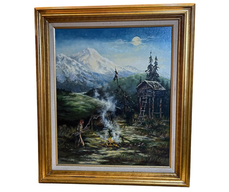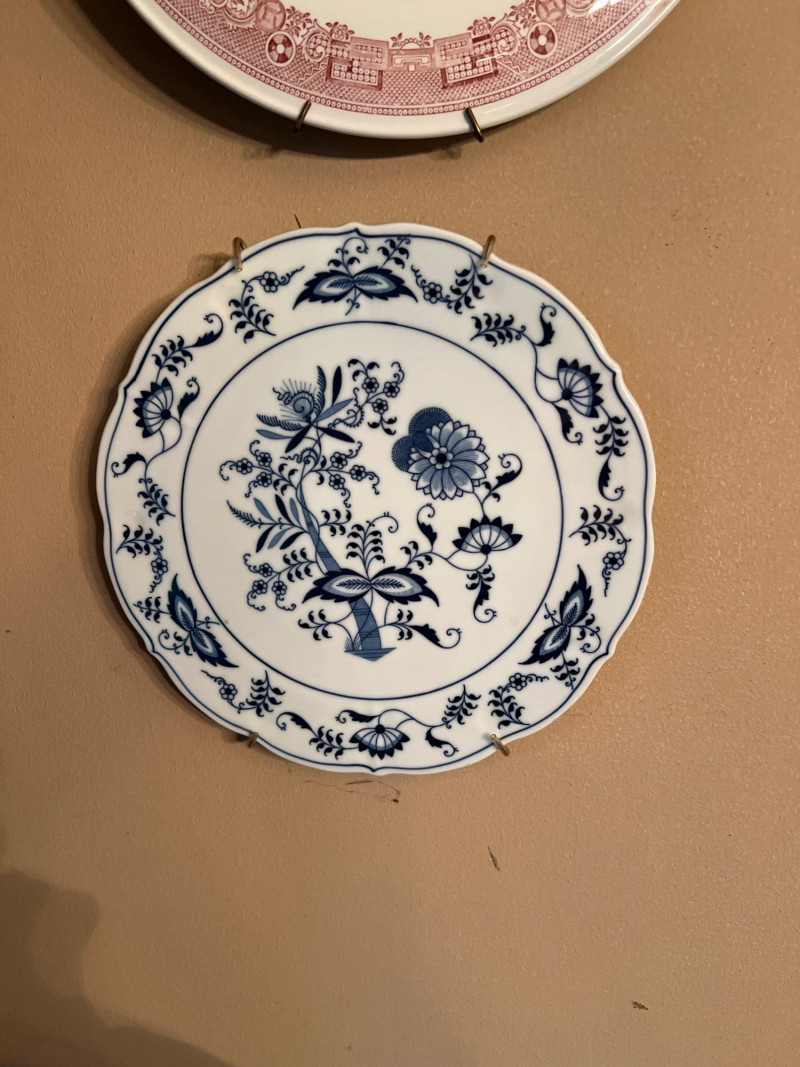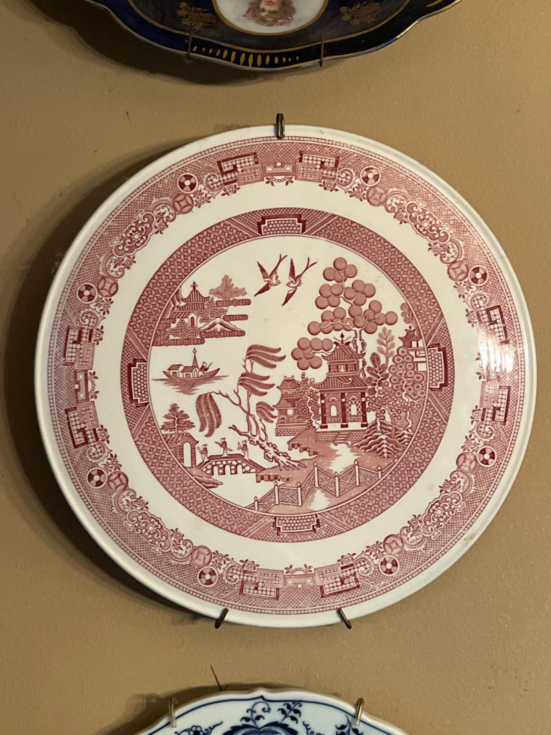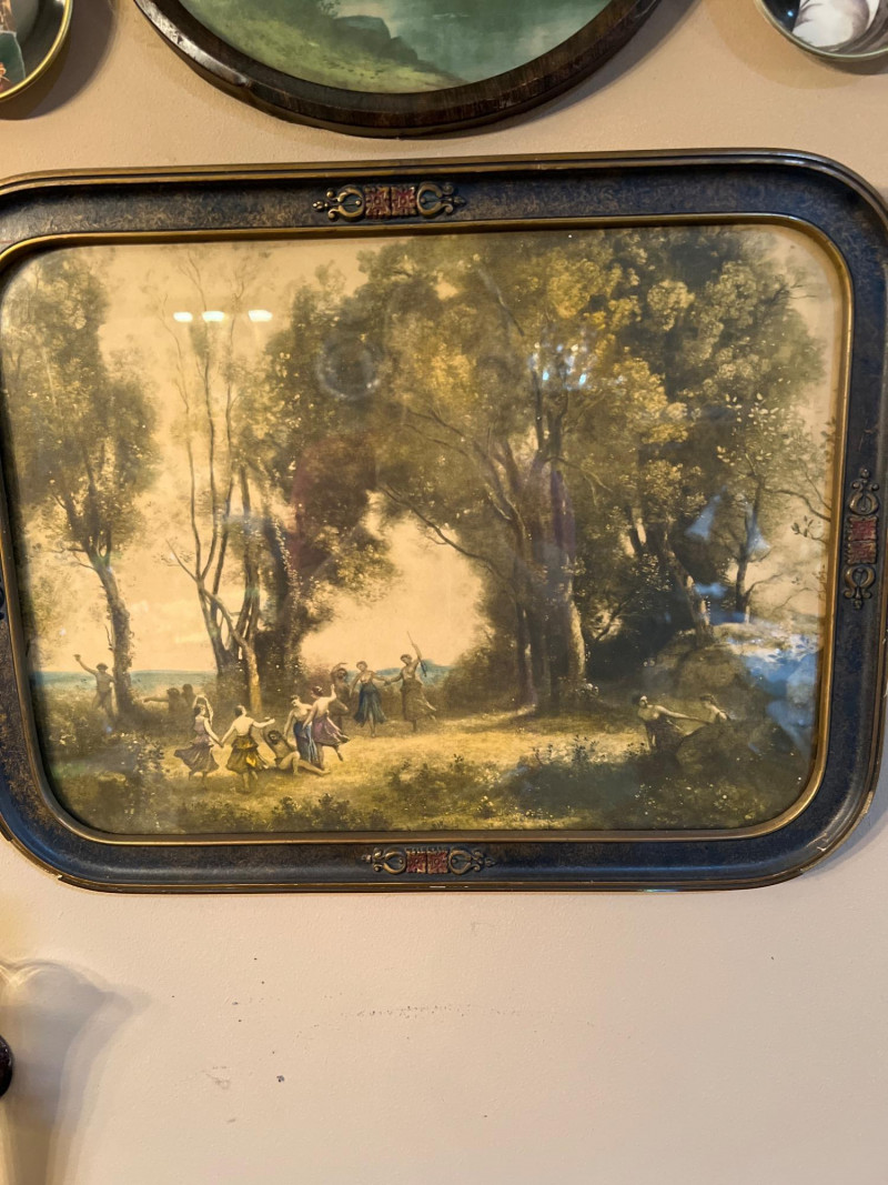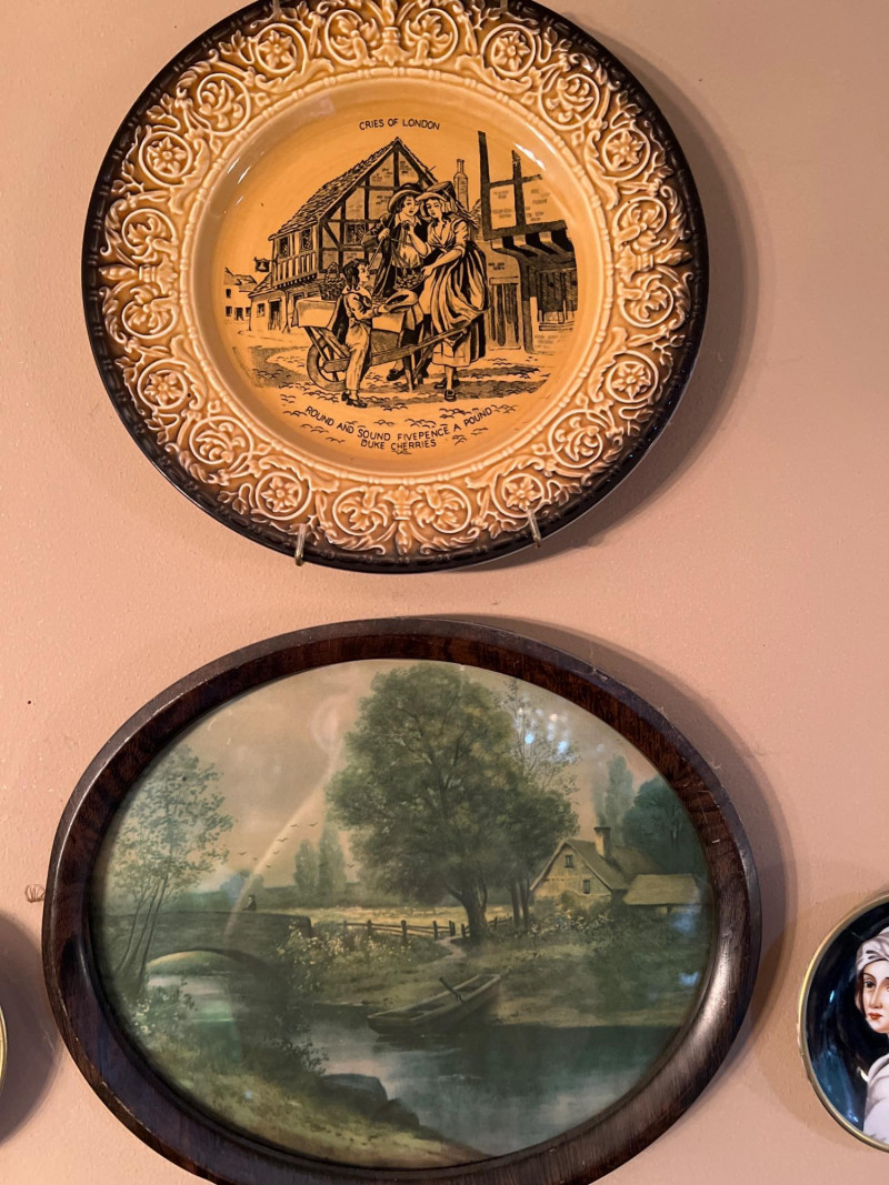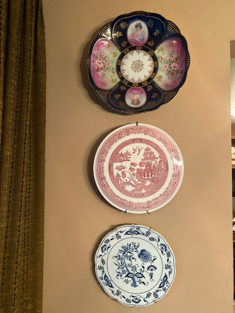 An as-is wall filled with a variety of decorative collectible porcelain plates alongside assorted framed artwork. The porcelain plates showcase a variety of themes — floral, scenic, commemorative, and seasonal — with intricate designs and gold accents typical of mid- to late-20th century collectibles. Complementing the plates are framed prints and artworks in various sizes and styles, creating a visually rich and cohesive display. Ideal for collectors, decorators, or resellers seeking inventory with strong visual impact and mix-and-match potential. This lot offers an instant gallery wall or a versatile assortment for resale, with each piece contributing charm, color, and character. Woman Painting by Hillstrom (1978) - 29" H x 23" W Plates range in diameter from 6" to 13"