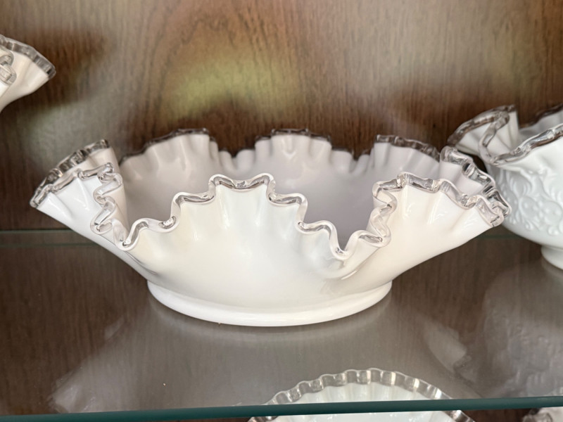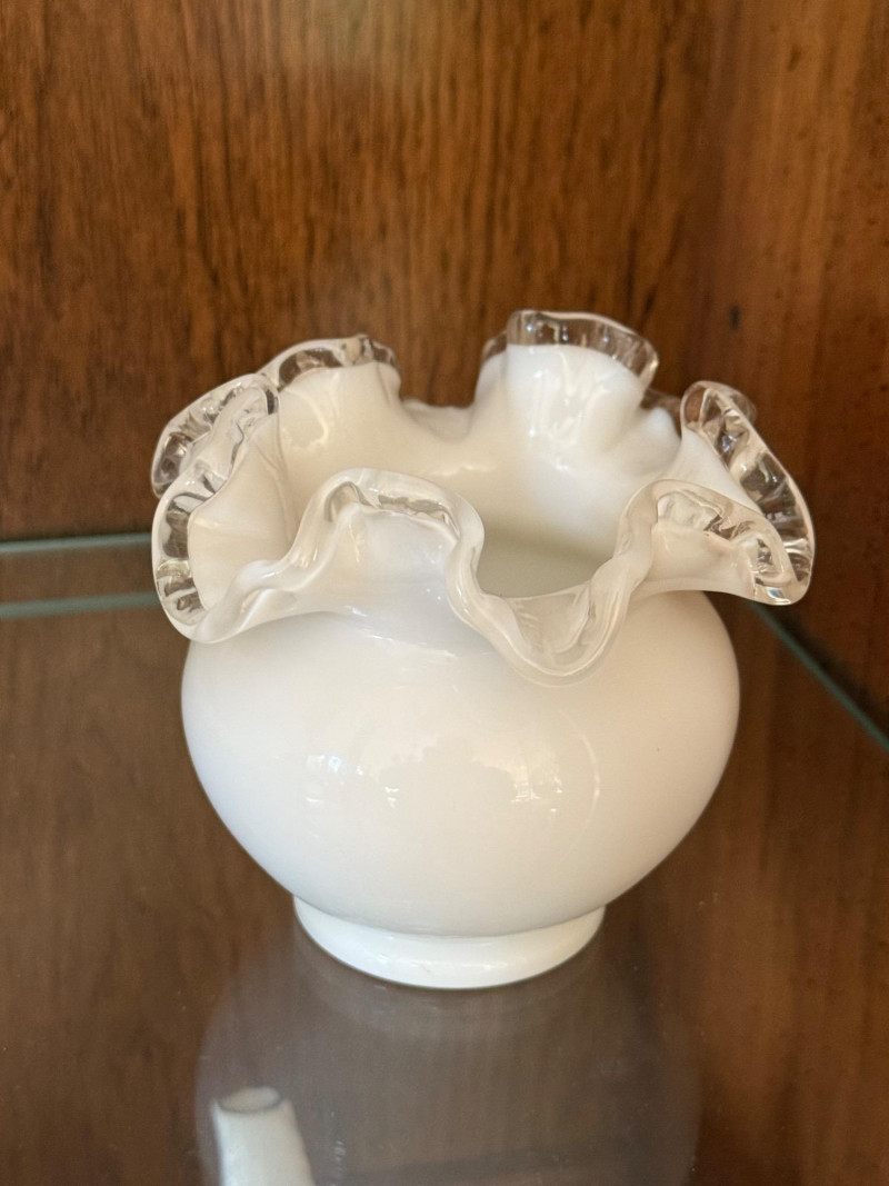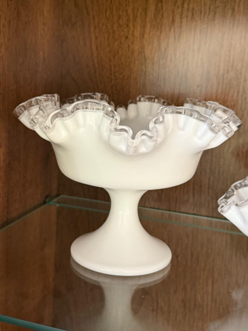 Produced by Fenton Art Glass, USA (1940s–1960s) Color: Opaque white milk glass with crystal-clear crimped and ruffled edging