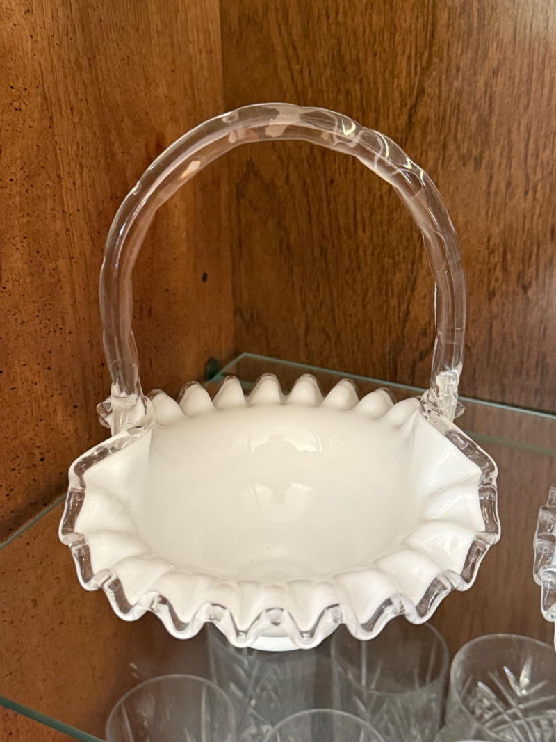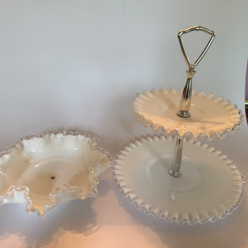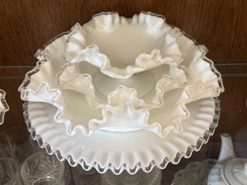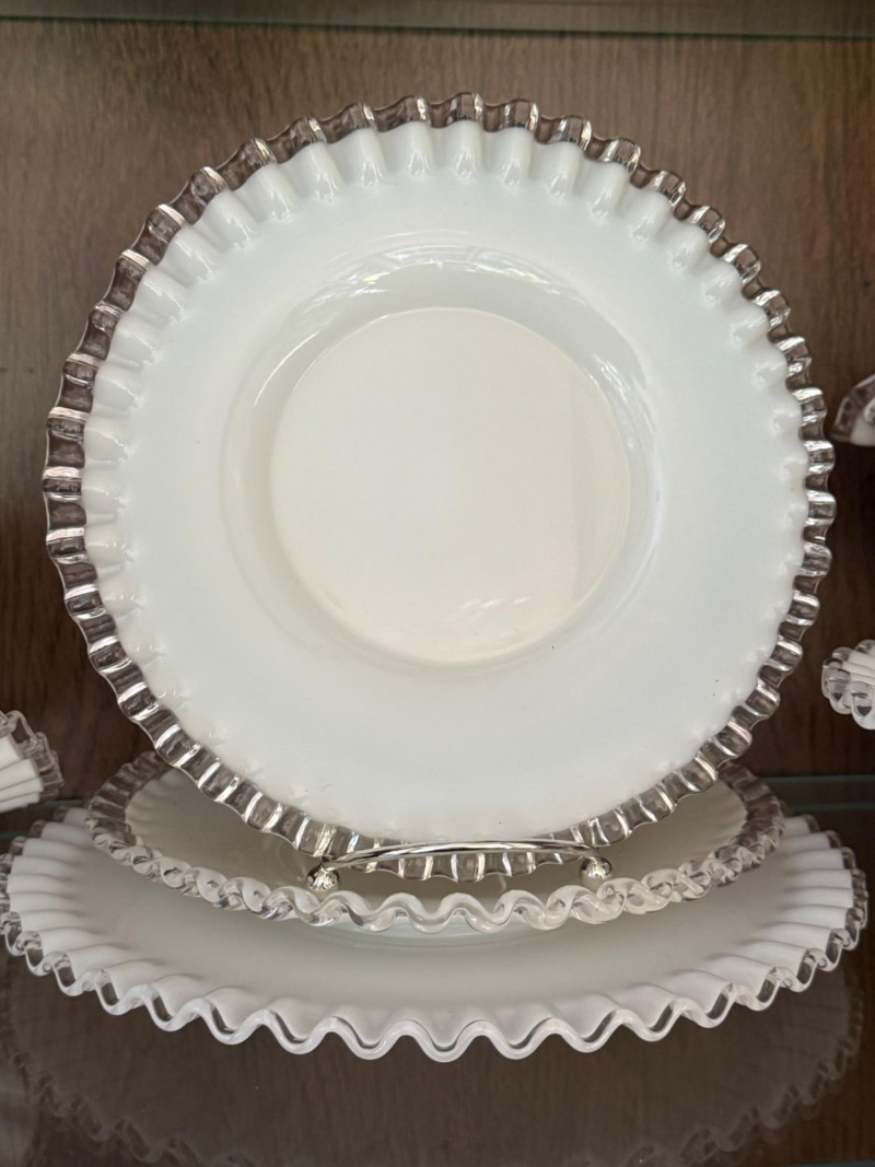 Style Notes: A representative collection from Fenton’s most iconic line, blending functional serving ware with decorative elegance Set Includes: Fenton Silver Crest Milk Glass Compotes: Pedestal forms with ruffled rims, approx. 6–7" wide Fenton Silver Crest Milk Glass Bowls (Spanish Lace Pattern): Embossed fruit and candy bowls, approx. 9–11" wide Fenton Silver Crest Milk Glass Ruffled Plates: Decorative plates measuring 8.5–12" wide Fenton Silver Crest Milk Glass Fan/Banana Bowl: Low form with ruffled edge, approx. 11" wide Fenton Silver Crest Milk Glass Handled Basket: Clear applied handle, approx. 6½" tall Fenton Silver Crest Milk Glass Serving Set: Nesting serving bowl with matching underplate Fenton Silver Crest Milk Glass Crimped Vase: Small bulbous form, approx. 4" tall Fenton Silver Crest Milk Glass Epergne Horn: Single ruffled trumpet form with fitter base Fenton Silver Crest Milk Glass Two-Tier Tidbit Tray: Ruffled edge double plate serving tray with metal handle
