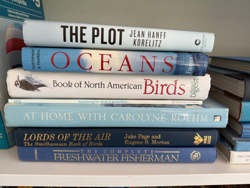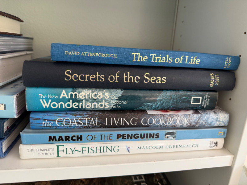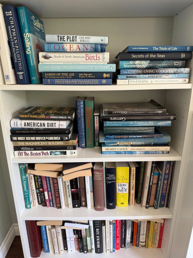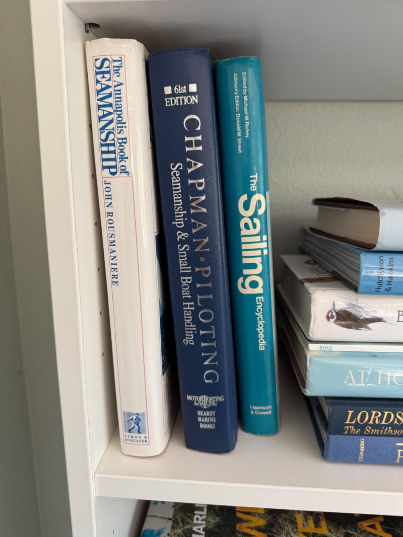 A library of 50+ titles covering seamanship, birdwatching, architecture, art, fiction, and lifestyle. Includes reference guides, illustrated coffee table books, and bestselling novels. Nautical & Nature: Guides and encyclopedias on sailing, seamanship, oceans, fishing, birds, and wildlife. Includes classics like Chapman Piloting, The Annapolis Book of Seamanship, and Book of North American Birds. These are practical references mixed with natural history and adventure. Travel & Architecture: