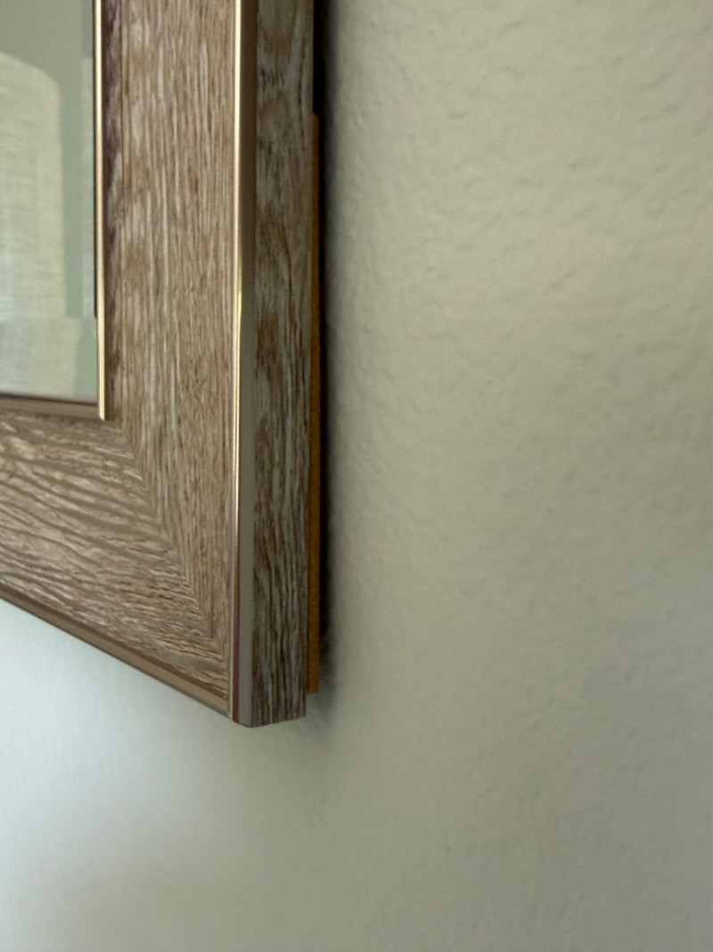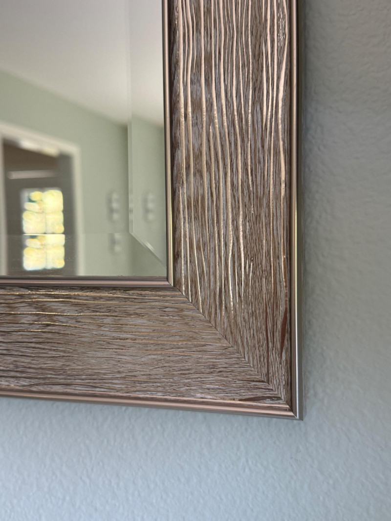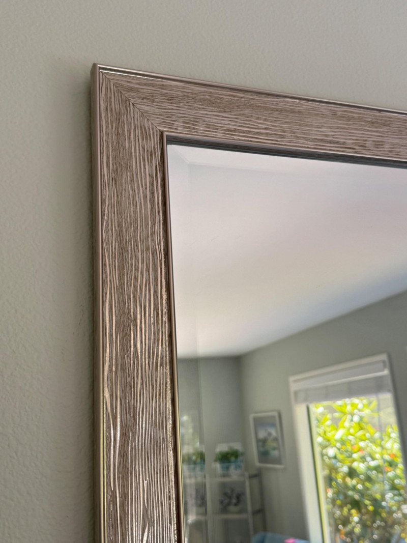 This rectangular wall mirror combines style and function for a polished interior upgrade. Its wide frame features a wood-grain texture with a metallic finish in silver and taupe tones, offering a subtle sheen that complements both modern and transitional décor. The beveled edge adds depth and elegance, making it a refined accent piece for any room. Features: Dimensions: Approximately 24.5" W x 28.5" H Frame: Wood-grain style with silver and taupe metallic finish Surface: Textured with a subtle sheen Mirror: Beveled edge for added sophistication Style: Ideal for modern or transitional interiorsSilver-Taupe Framed Beveled Wall Mirror