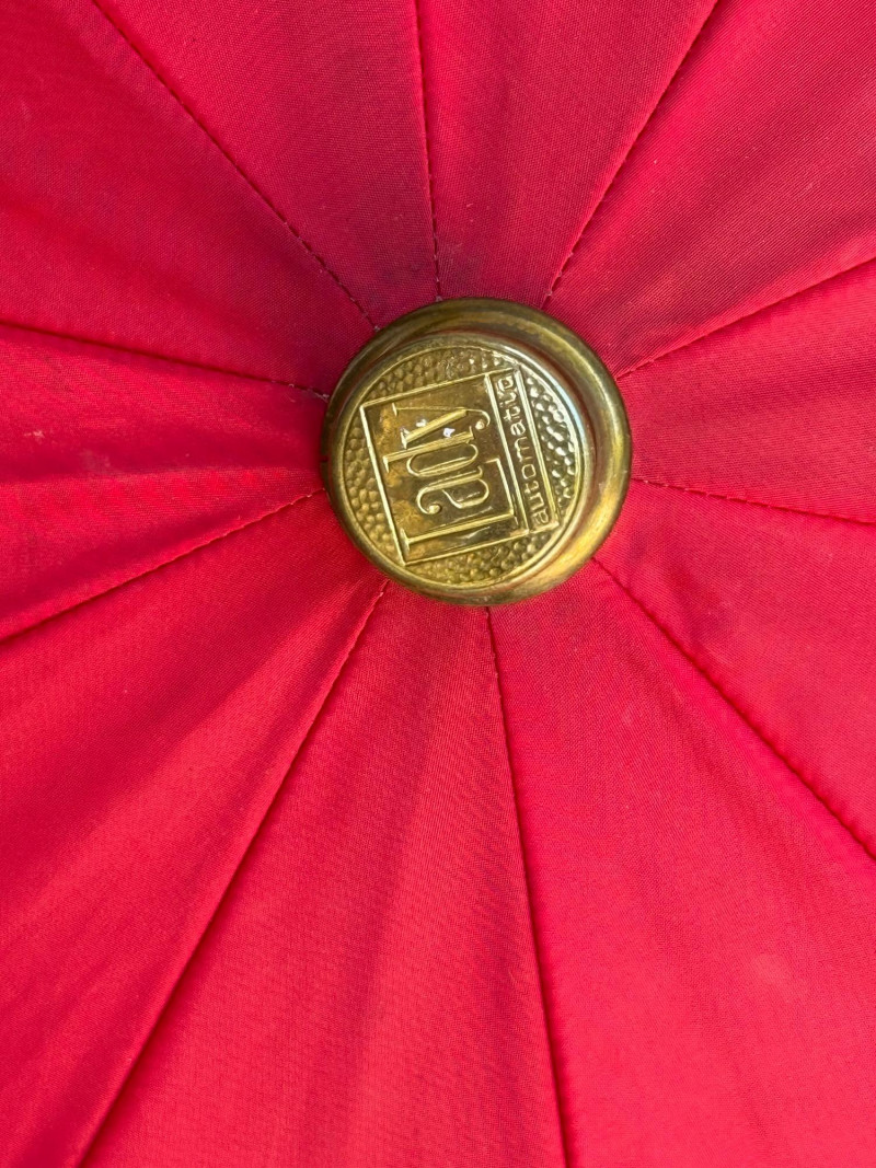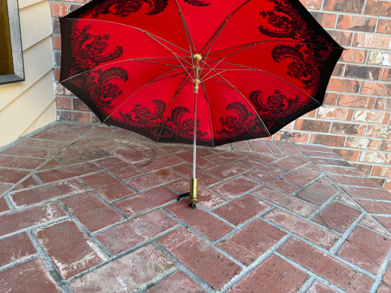 Vintage "Lady Automatic" Red & Black Umbrella with Floral Scroll Design A vintage "Lady Automatic" umbrella featuring a bold red canopy with contrasting black floral scrollwork around the edges. The umbrella is topped with a decorative brass-tone cap stamped "Lady Automatic". Its automatic open function reflects mid-20th-century umbrella design, pairing elegance with practicality.