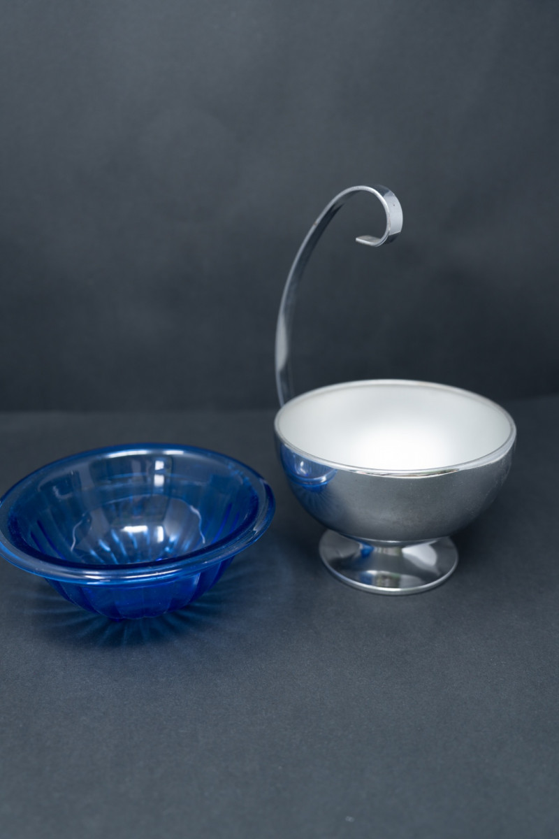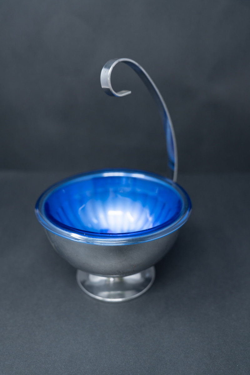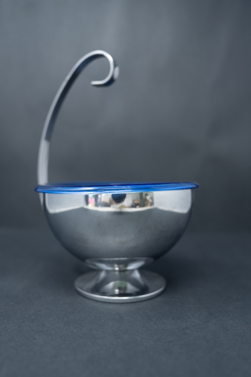 Hazel Atlas Cobalt Ritz Blue Ice Bowl with Chrome Stand & Ladle – 1930s Art Deco A striking Hazel Atlas cobalt Ritz blue ice bowl, set in its original chrome-plated footed stand with curved handle and paired with a matching ladle. The vivid cobalt glass insert contrasts beautifully with the sleek chrome frame, exemplifying the Art Deco era’s blend of bold color and streamlined design. Measurements (range): Height (with handle): Approx. 6"–7" Bowl diameter: Approx. 4.5"–5" Depth: Approx. 2.5"–3" Historical Note: Value: