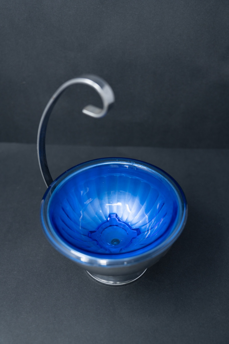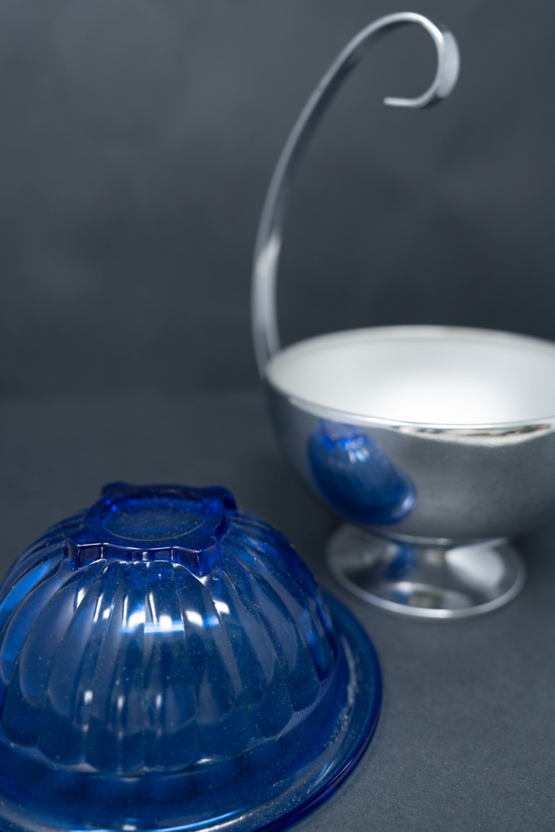 Hazel Atlas Glass Company, one of the great American glassmakers of the early 20th century, introduced the Ritz Blue line in the 1930s, known for its brilliant cobalt color. Often paired with chrome or silverplate holders, these pieces were designed for cocktail parties and stylish entertaining during the Art Deco era. Today, they are highly collectible examples of American Depression-era glassware.
