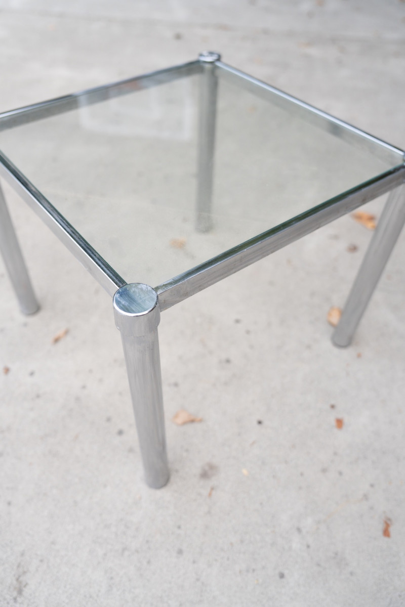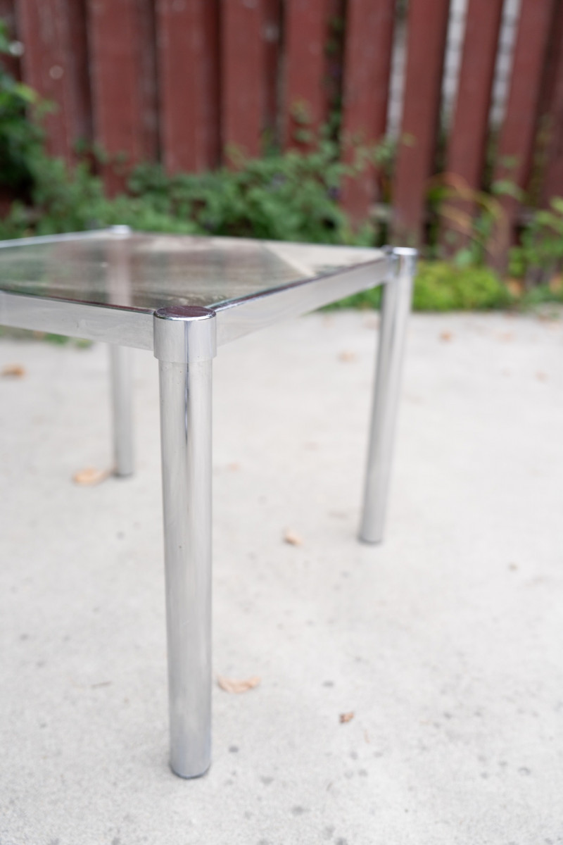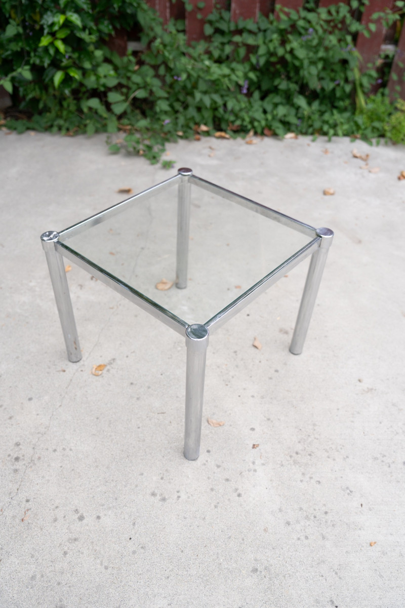 Mid-Century Modern Chrome & Glass Side Table – 1970s Minimalist Design A sleek mid-century modern side table featuring a polished chrome frame with cylindrical legs and a square removable glass top. Its minimalist, industrial design makes it a versatile piece that pairs well with both vintage and contemporary interiors. Measurements (range): Height: Approx. 16"–17" Width: Approx. 18"–19" Depth: Approx. 18"–19" Condition: Historical Note: