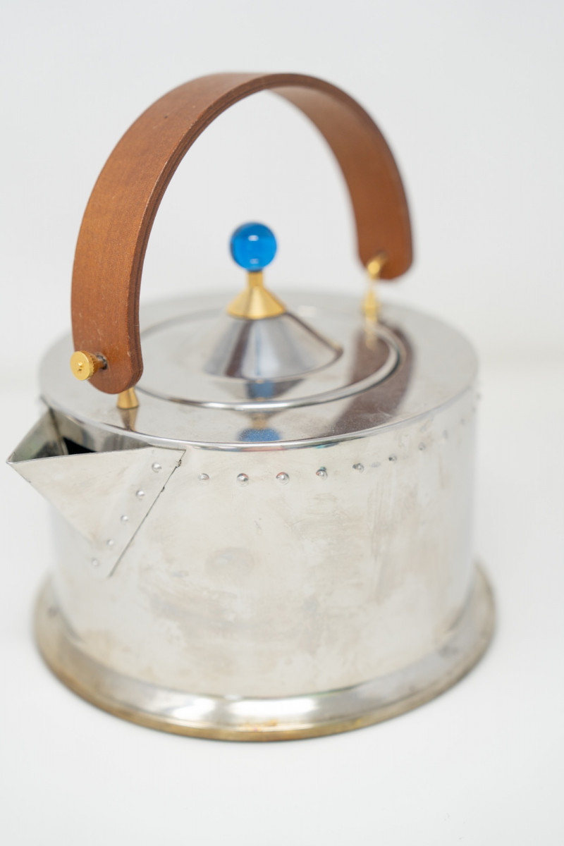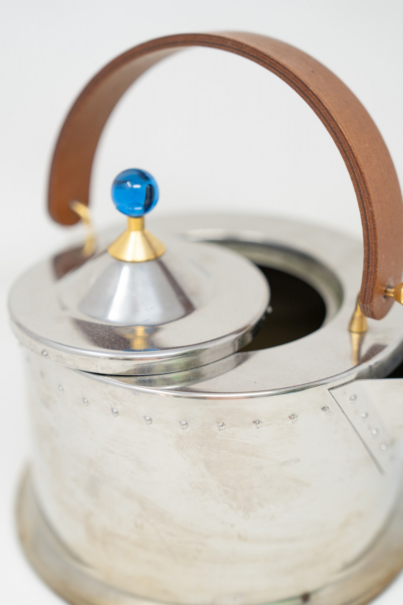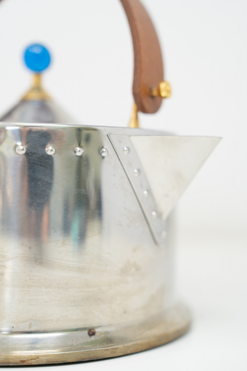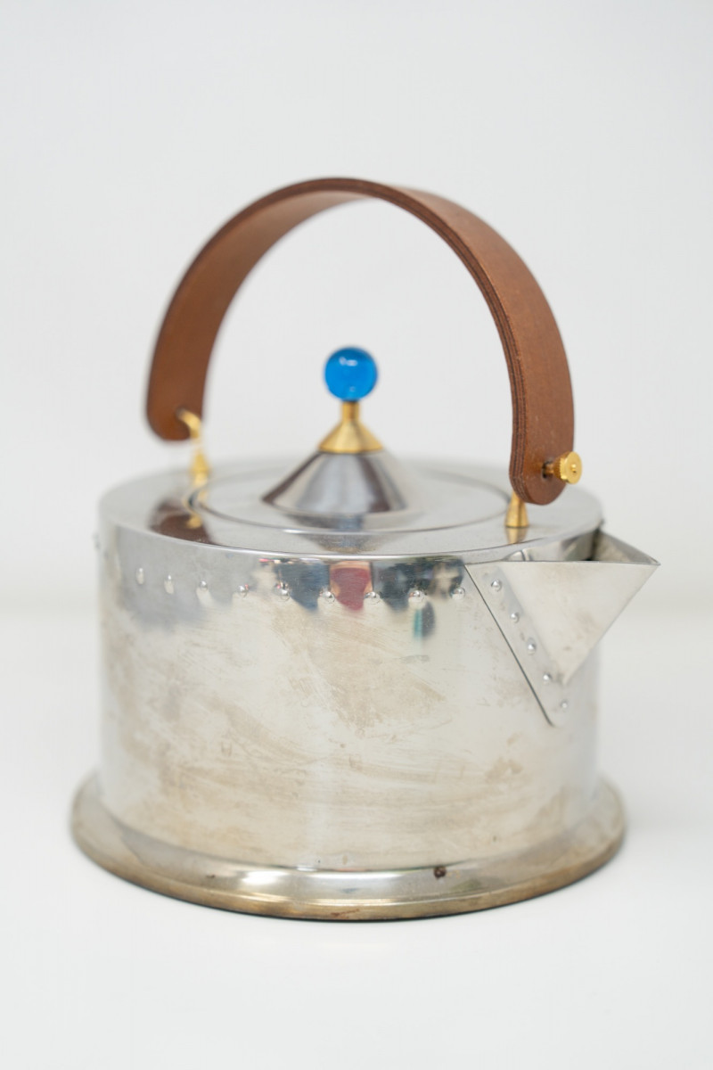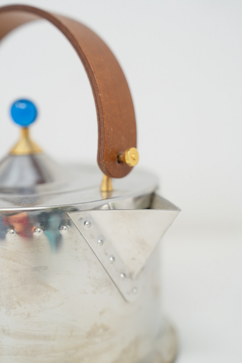 Postmodern Italian Alessi Kettle A striking postmodern stainless steel kettle, attributed to Alessi (Italy, 1980s–1990s), featuring a bold sculptural design with riveted details, a warm leather-wrapped handle, and a brilliant cobalt-blue glass finial. The geometric spout and brass accents highlight its architectural influence, making it a collectible piece of Italian design. Maker/Brand: Attributed to Alessi, Italy Era: Circa 1980s–1990s Materials: Stainless steel, brass, leather, glass Design Details: Riveted geometric spout, conical lid with cobalt-blue glass finial, leather-wrapped handle Dimensions: Approx. 7–9" tall (including handle), 7–8" wide Condition: Good vintage condition with minor surface wear and patina consistent with age. Why it’s special: Alessi kettles are highly regarded for their sculptural form and playful postmodern details. The combination of mixed materials (steel, brass, leather, glass) makes this a standout, collectible piece for both design enthusiasts and functional kitchenware lovers.