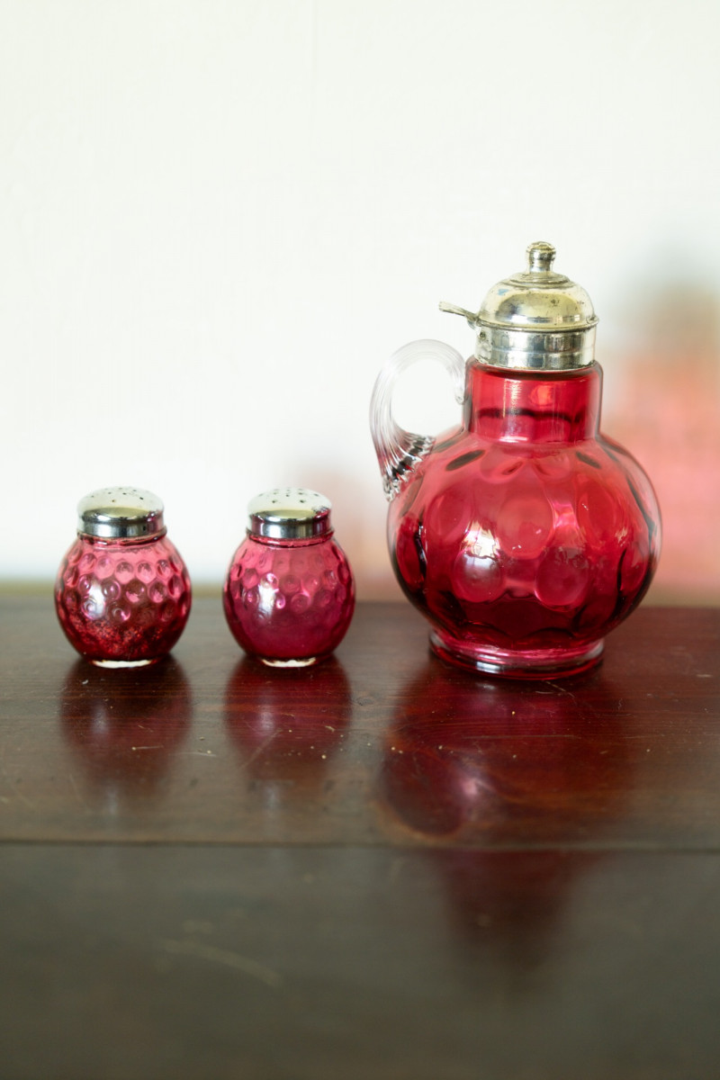 Lot # 114 - Vintage Cranberry Glass Syrup Pitcher & Shakers - L.G. Wright & Fenton