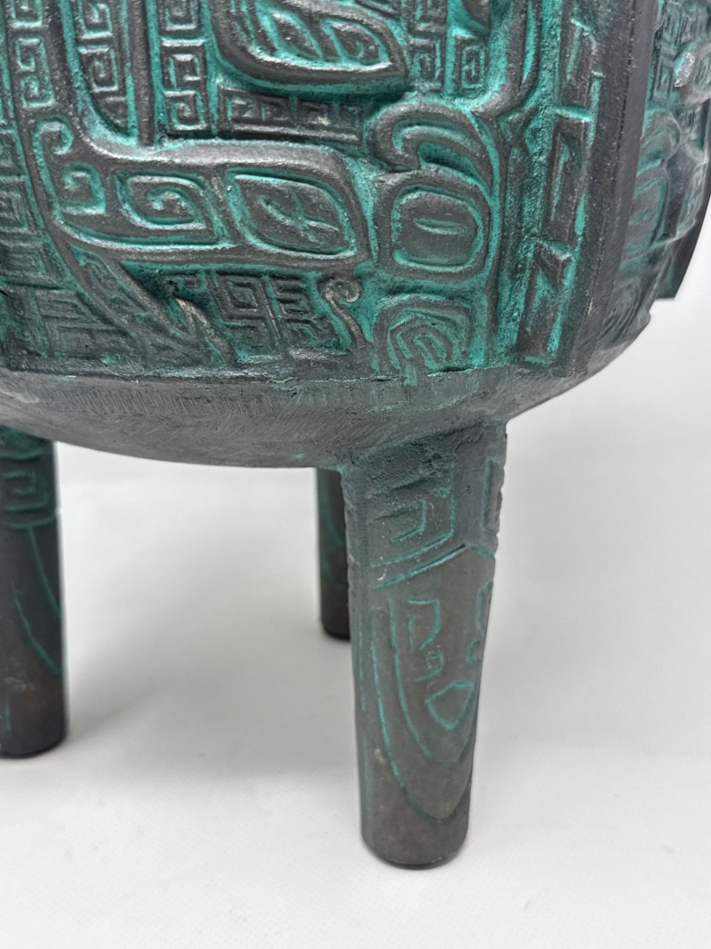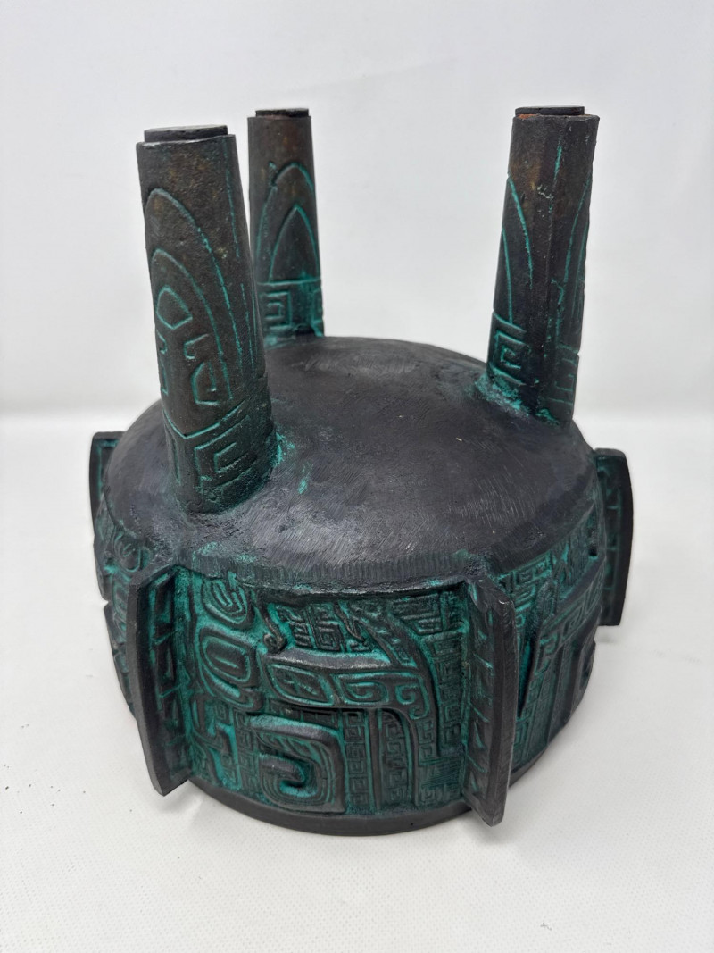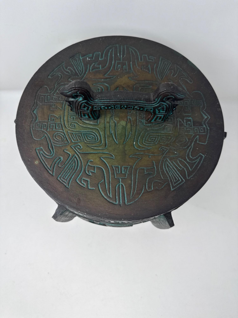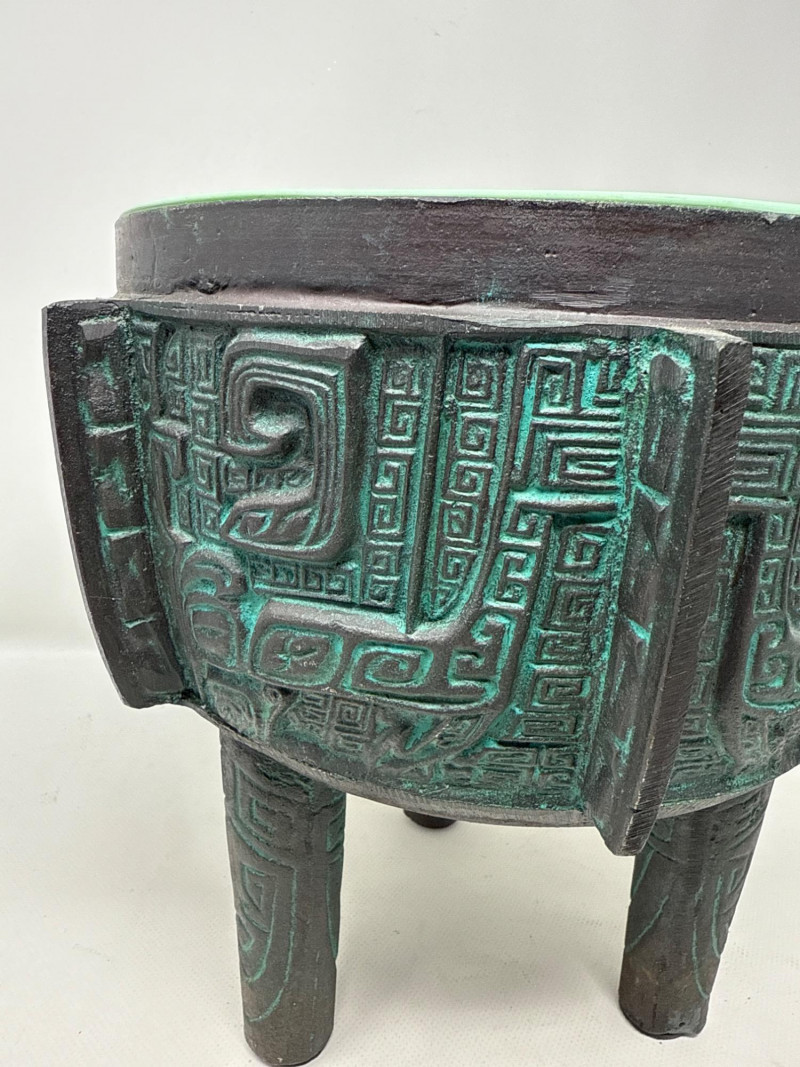 Large James Mont- Verdigris Footed Ice Bucket A bold and sculptural statement piece, this vintage ice bucket channels the distinctive style of James Mont, known for blending Asian-inspired forms with Mid-Century Brutalist flair. The footed vessel is crafted from bronze-toned cast metal and finished in a rich verdigris patina, evoking the aged elegance of ceremonial antiquities. Raised geometric and taotie-inspired motifs wrap the body in tribal symbolism, while the fitted lid features a stylized animal-head handle—adding a mythic touch. Inside, a removable stainless-steel liner ensures practical use without compromising its decorative appeal. Style: James Mont, Mid-Century Asian Brutalist Form: Footed lidded vessel Material: Bronze metal with verdigris patina; stainless steel liner Motifs: Raised geometric and tribal taotie designs Function: Ice bucket or decorative containerDetails: