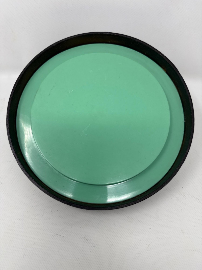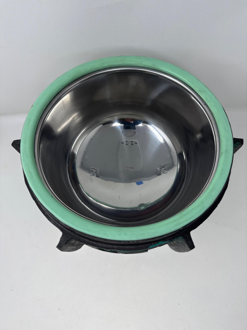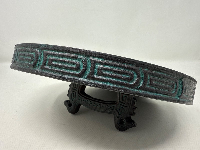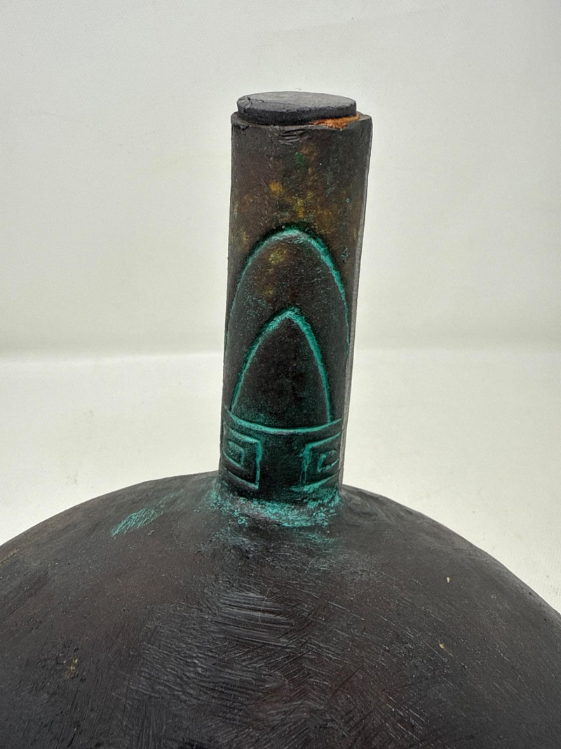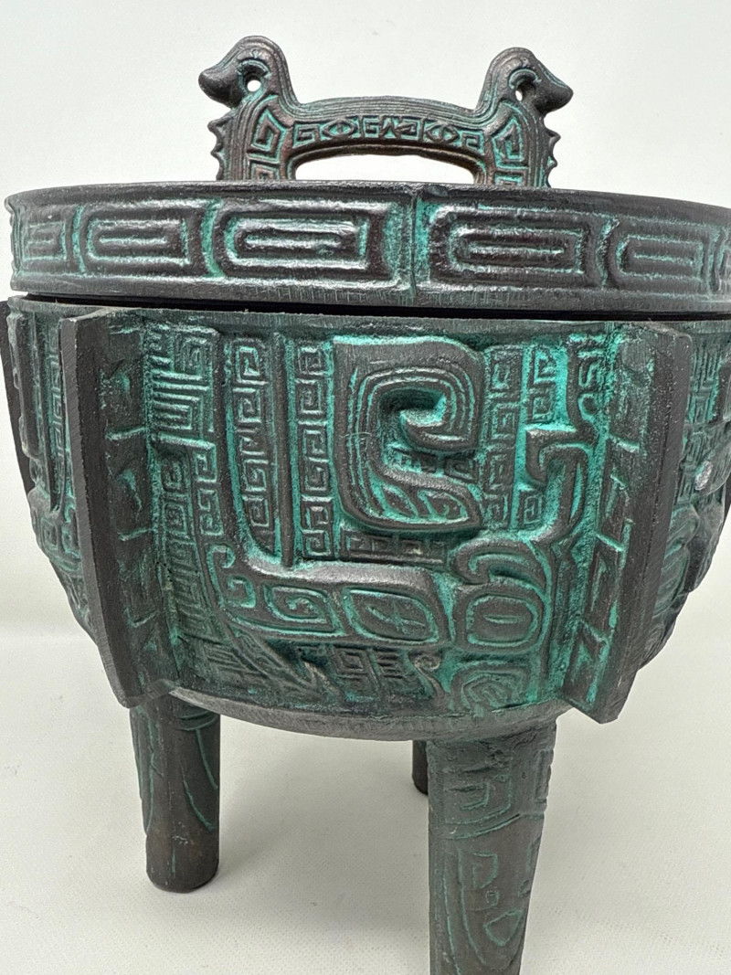 Large James Mont- Verdigris Footed Ice Bucket A bold and sculptural statement piece, this vintage ice bucket channels the distinctive style of James Mont, known for blending Asian-inspired forms with Mid-Century Brutalist flair. The footed vessel is crafted from bronze-toned cast metal and finished in a rich verdigris patina, evoking the aged elegance of ceremonial antiquities. Raised geometric and taotie-inspired motifs wrap the body in tribal symbolism, while the fitted lid features a stylized animal-head handle—adding a mythic touch. Inside, a removable stainless-steel liner ensures practical use without compromising its decorative appeal. Style: James Mont, Mid-Century Asian Brutalist Form: Footed lidded vessel Material: Bronze metal with verdigris patina; stainless steel liner Motifs: Raised geometric and tribal taotie designs Function: Ice bucket or decorative containerDetails: