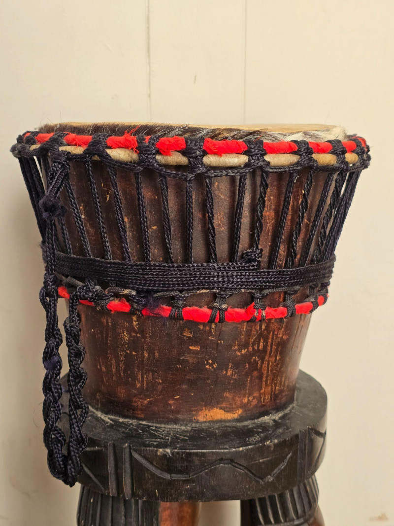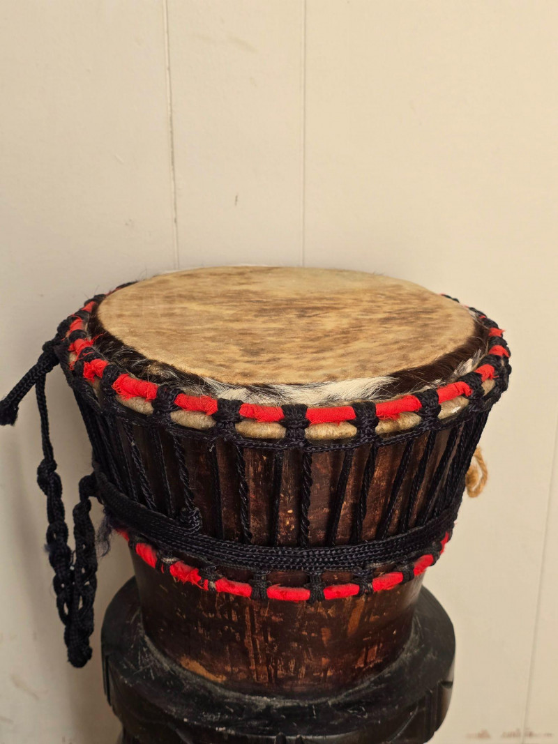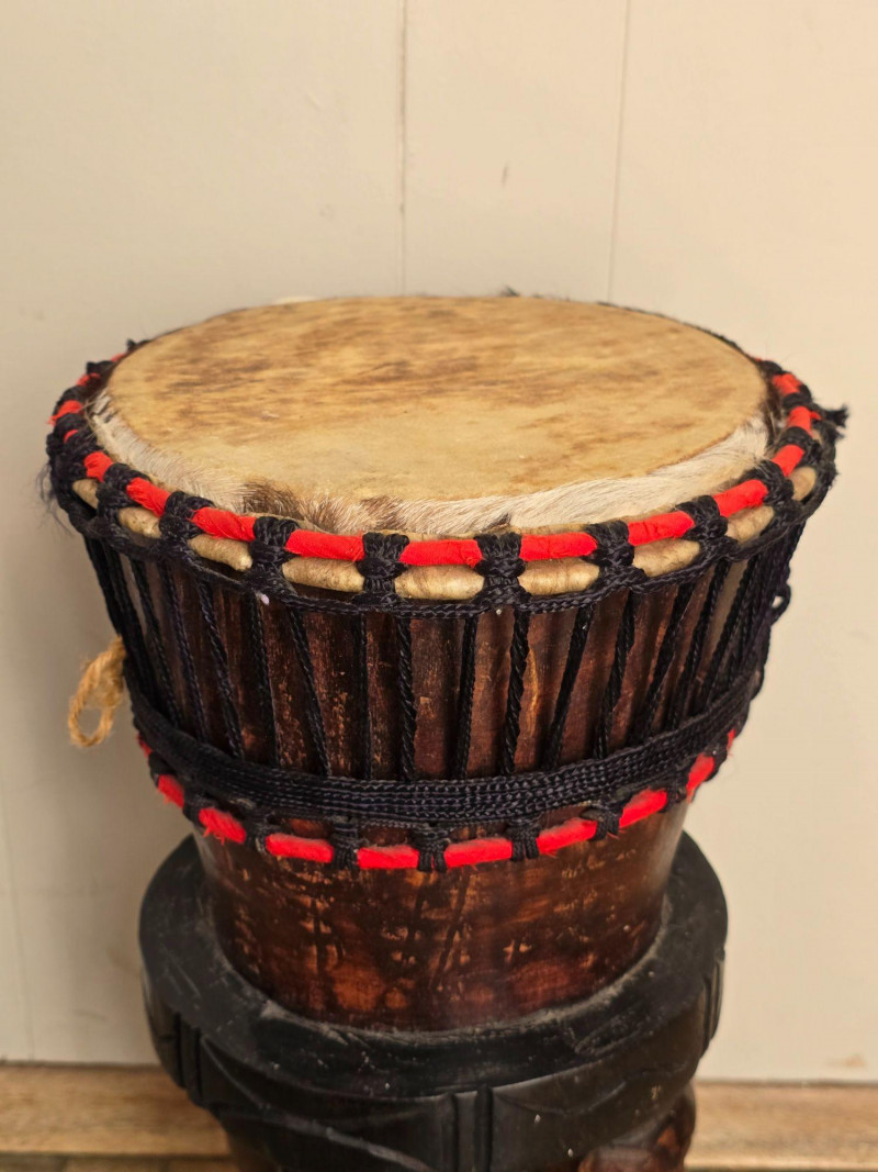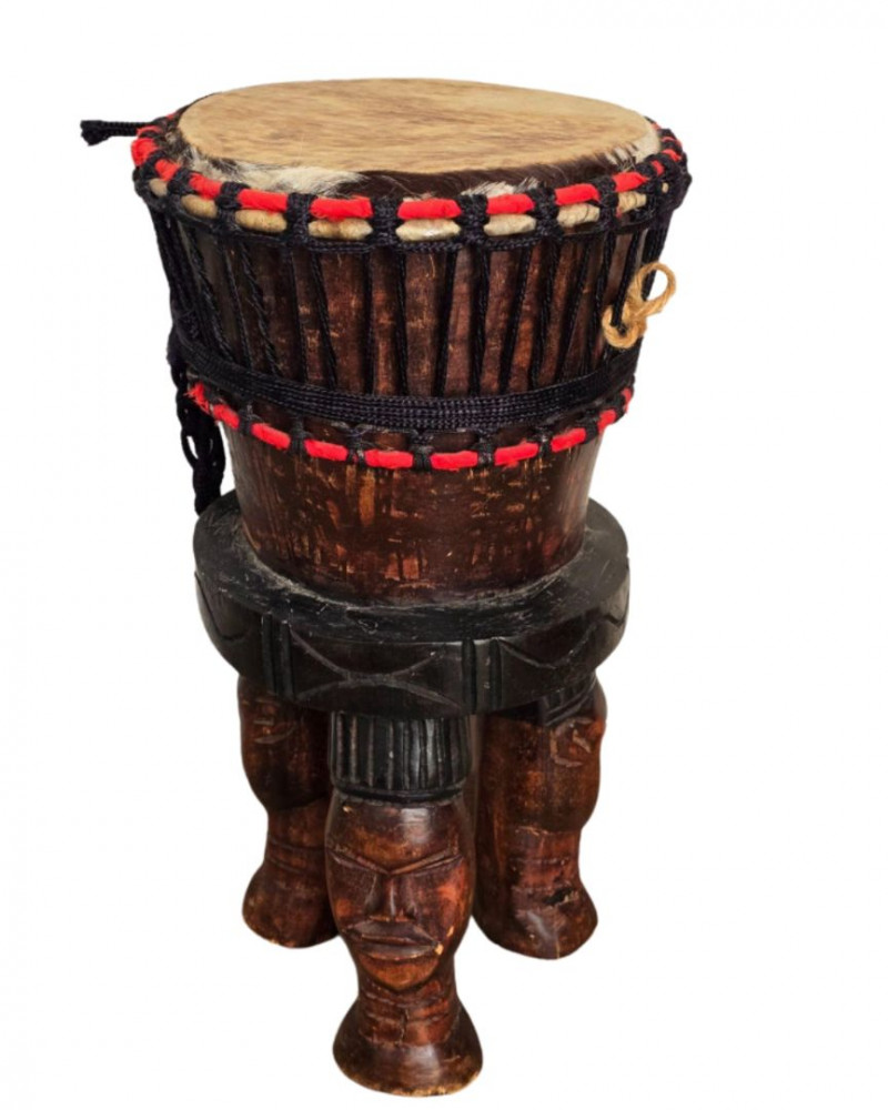 Hand-carved wooden African djembe drum with traditional rope-tuned head. The drum features a natural skin playing surface and a black-and-red rope system for tensioning. The base is carved with stylized human faces, adding strong visual and cultural character to the piece. Multiple views show consistent craftsmanship, carved detail, and intact ropework. Condition appears good with expected surface wear from age and handling. No visible tears to the drumhead in the provided images. Rope tensioning intact. Carved base shows no structural cracks. A striking decorative and functional percussion instrument suitable for players, collectors, and display.