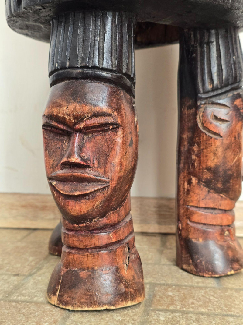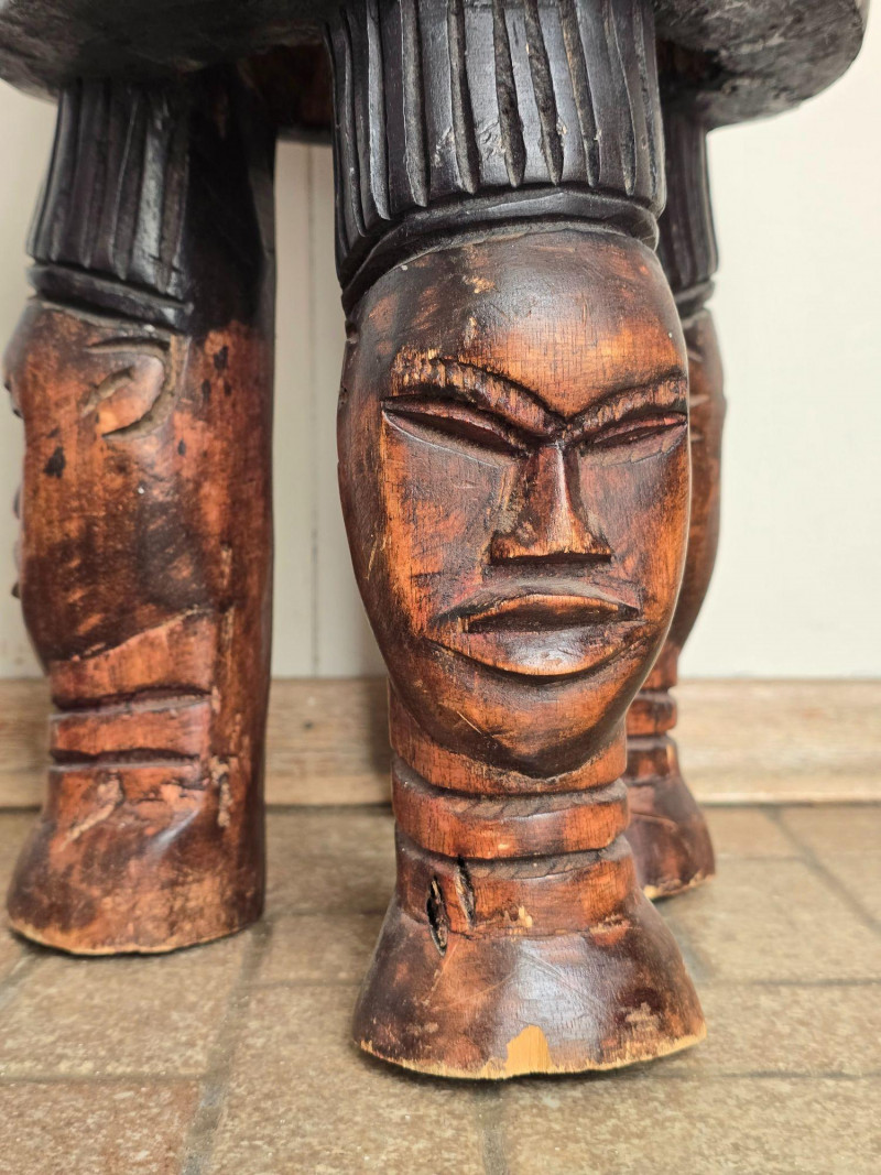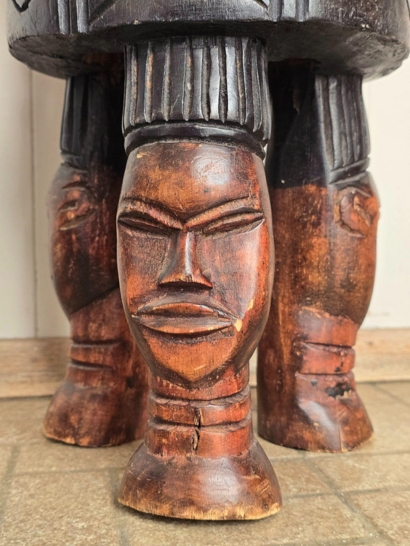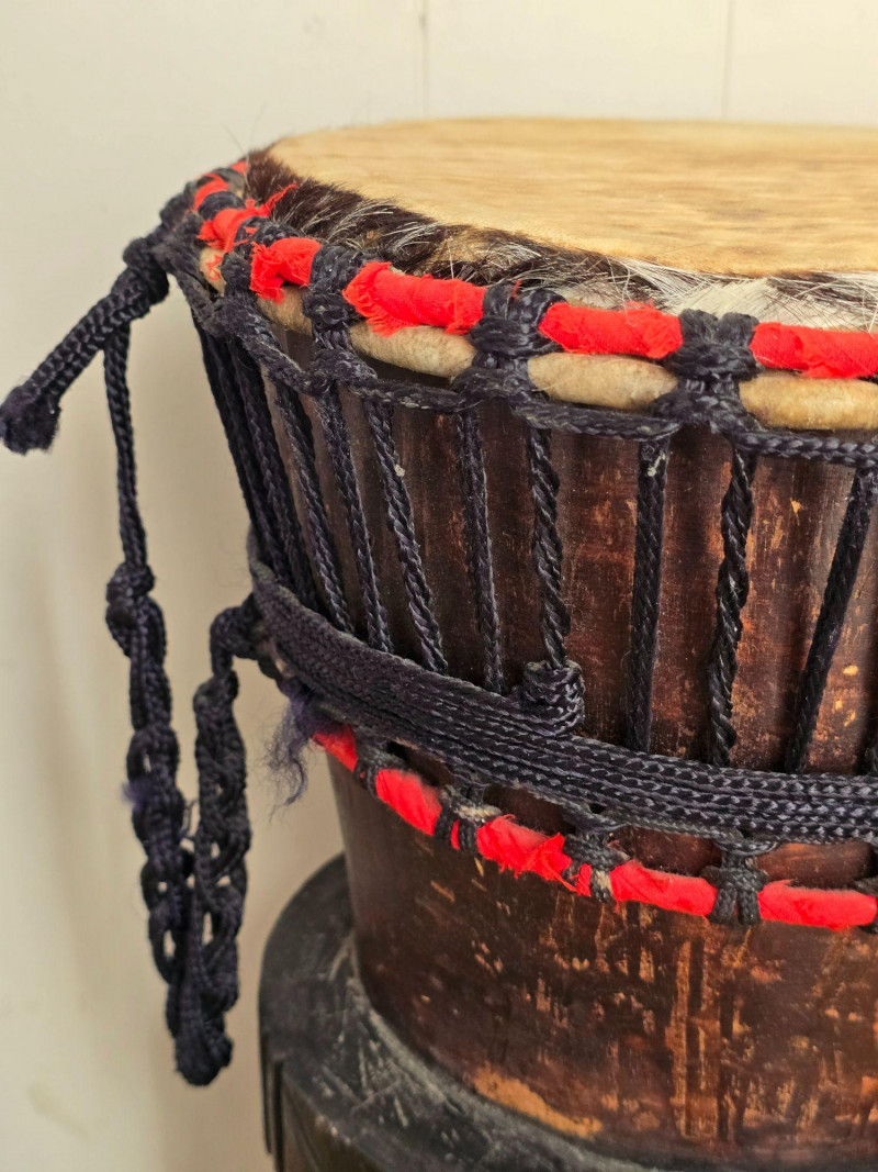 Hand-carved wooden African djembe drum with traditional rope-tuned head. The drum features a natural skin playing surface and a black-and-red rope system for tensioning. The base is carved with stylized human faces, adding strong visual and cultural character to the piece. Multiple views show consistent craftsmanship, carved detail, and intact ropework. Condition appears good with expected surface wear from age and handling. No visible tears to the drumhead in the provided images. Rope tensioning intact. Carved base shows no structural cracks. A striking decorative and functional percussion instrument suitable for players, collectors, and display.