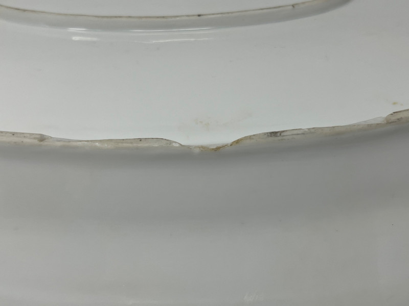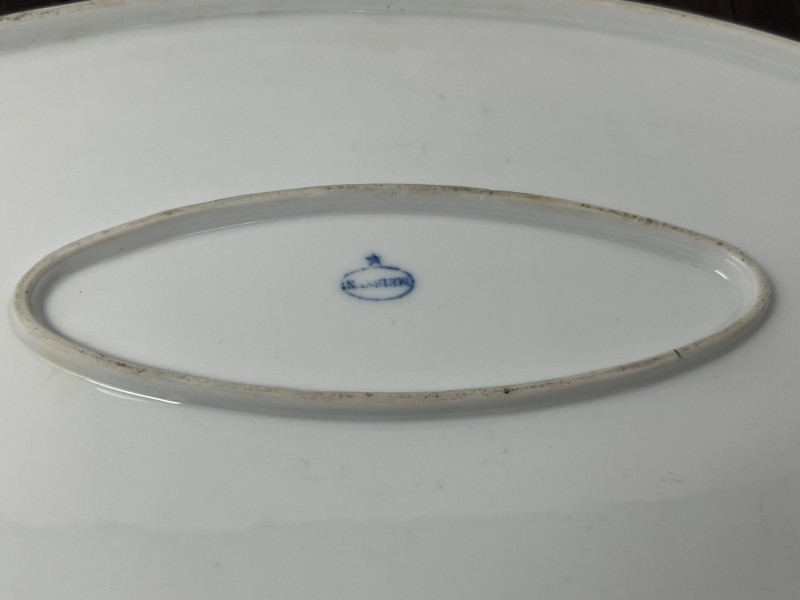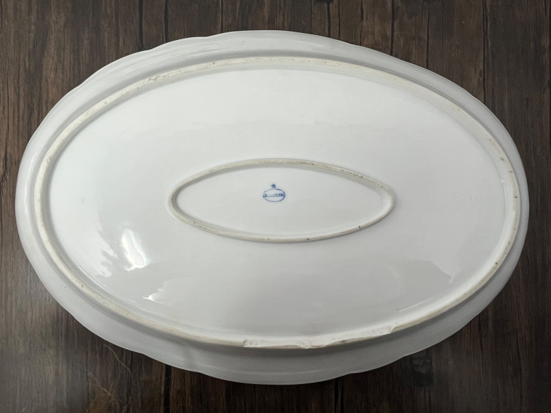 Meissen, founded in 1710 under Augustus the Strong, was the first European hard‑paste porcelain manufactory and set the standard for all that followed. While the iconic crossed‑swords mark is the factory’s most recognized emblem, Meissen also used a variety of impressed and printed word‑marks—particularly on utilitarian and tableware forms produced in the late 19th and early 20th centuries. Circular “MEISSEN” stamps and impressed model or batch numbers were common on service pieces, helping identify workshop origin and production sequence. These marks reflect the factory’s transition into more modernized manufacturing while still maintaining the hand‑finished quality that collectors value. The face of the platter is in great vintage condition with no cracks, repairs, or surface losses. A tiny chip is present on the underside rim, not visible during display and consistent with age and handling. A handsome and authentic Meissen serving piece, suitable for collectors, decorators, and those seeking genuine European porcelain. Condition: