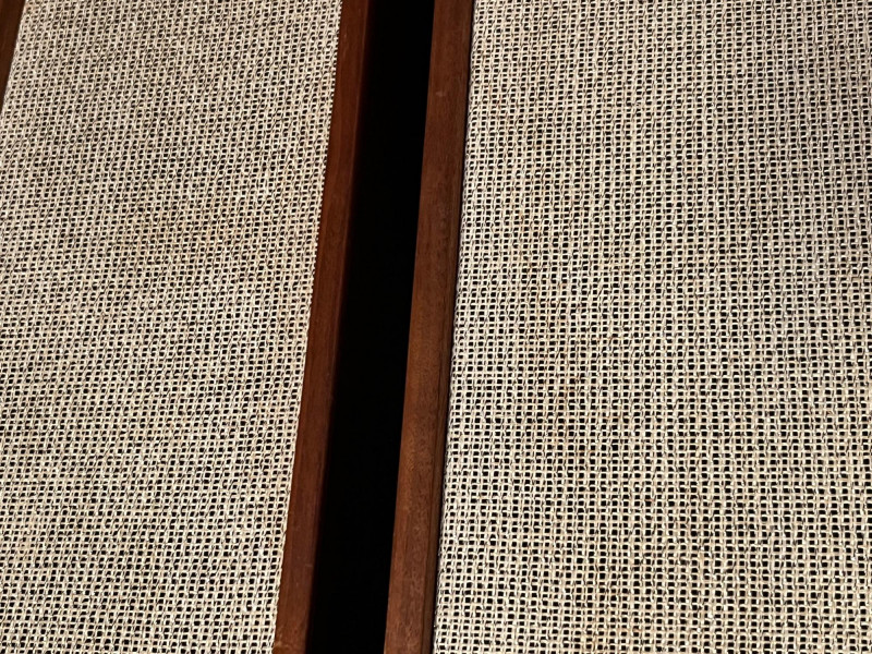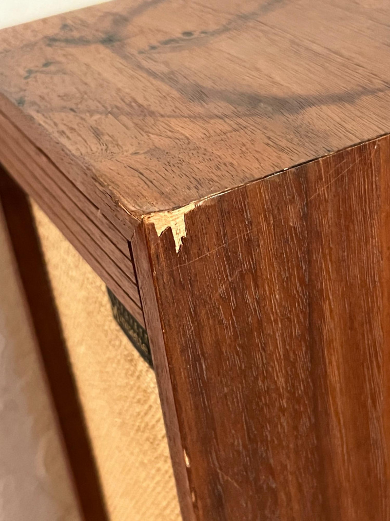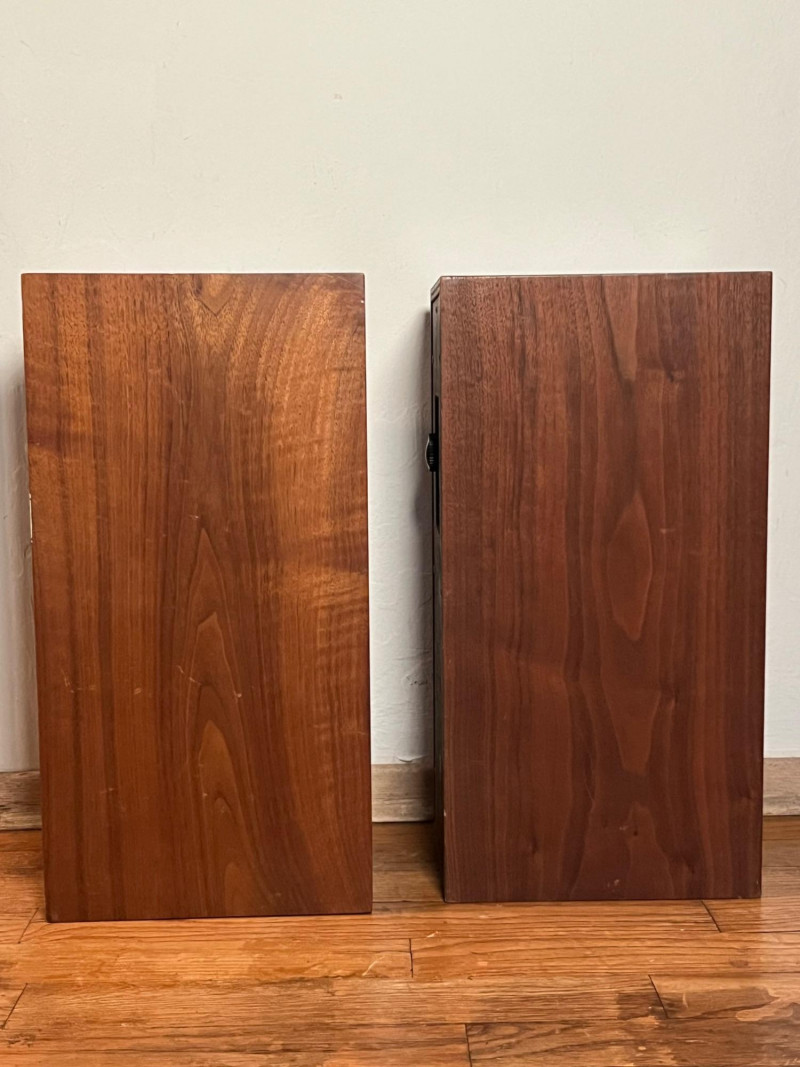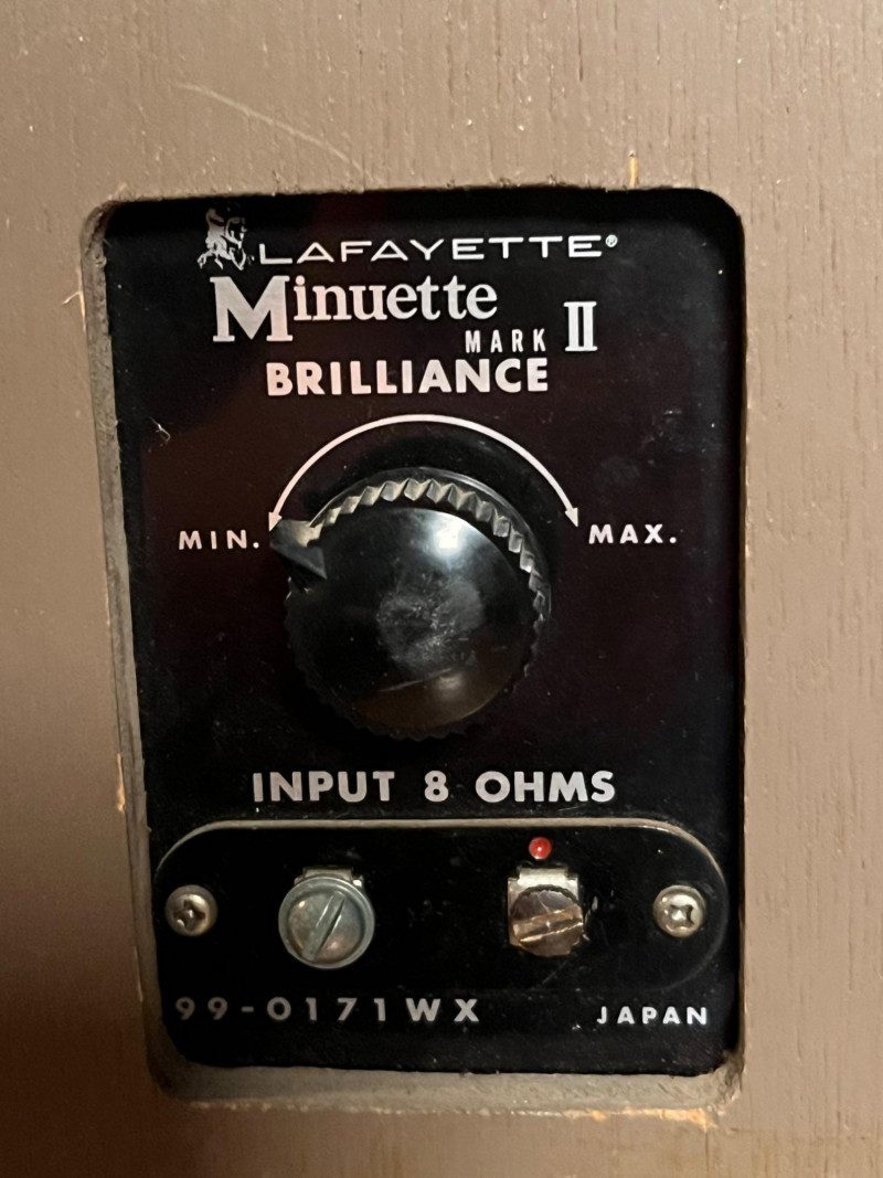 Pair of vintage Lafayette Minuette Mark II bookshelf speakers, made in Japan. Classic wood‑cabinet design with woven fabric grilles and rear brilliance adjustment. A well‑preserved example of Lafayette’s compact hi‑fi line, suitable for vintage audio collectors or restoration enthusiasts. Features & Details: Model: Lafayette Minuette Mark II Matching pair Wood veneer cabinets with woven fabric grilles Rear brilliance control (Min–Max) Input: 8 Ohms Marked “89‑0171WX Japan” Original Lafayette badging intact Compact, bookshelf‑friendly size Condition Notes: Cabinets show light, age‑appropriate wear Grilles clean with no major snags Rear panels and controls intact Untested by Sound Estate Company unless otherwise noted Included: Two Lafayette Minuette Mark II speakers (pair)