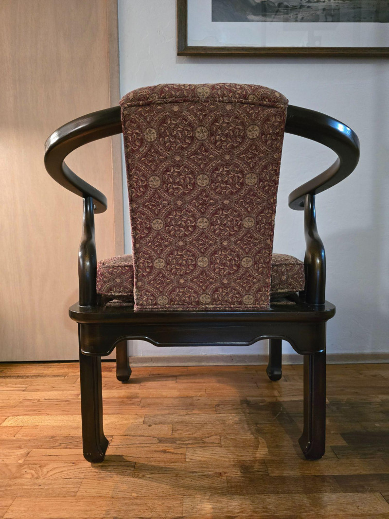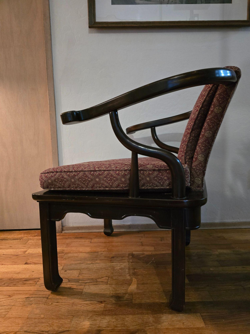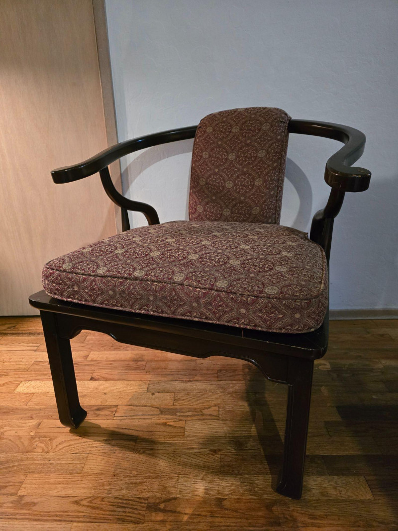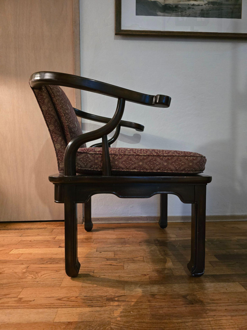 A classic mid‑century traditional armchair featuring a warm stained hardwood frame, gently curved arms, and a tailored upholstered seat and back. This style emerged in the 1950s–1970s as American makers blended earlier colonial revival silhouettes with the cleaner, simplified lines of the mid‑century era. The result is a versatile, comfortable accent chair that works beautifully in living rooms, reading corners, offices, and vintage‑inspired interiors. Era & Style Highlights: Mid‑Century Traditional / Transitional design Influences of Colonial Revival and early American forms Curved arms and legs typical of mid‑century domestic furniture Upholstered seat and back in a patterned woven fabric Warm wood tone consistent with 1950s–1970s home furnishings Details: Solid wood frame with graceful arm curvature Upholstered back and seat for comfortable support Stable, well‑balanced construction Attractive profile from all viewing angles Condition: