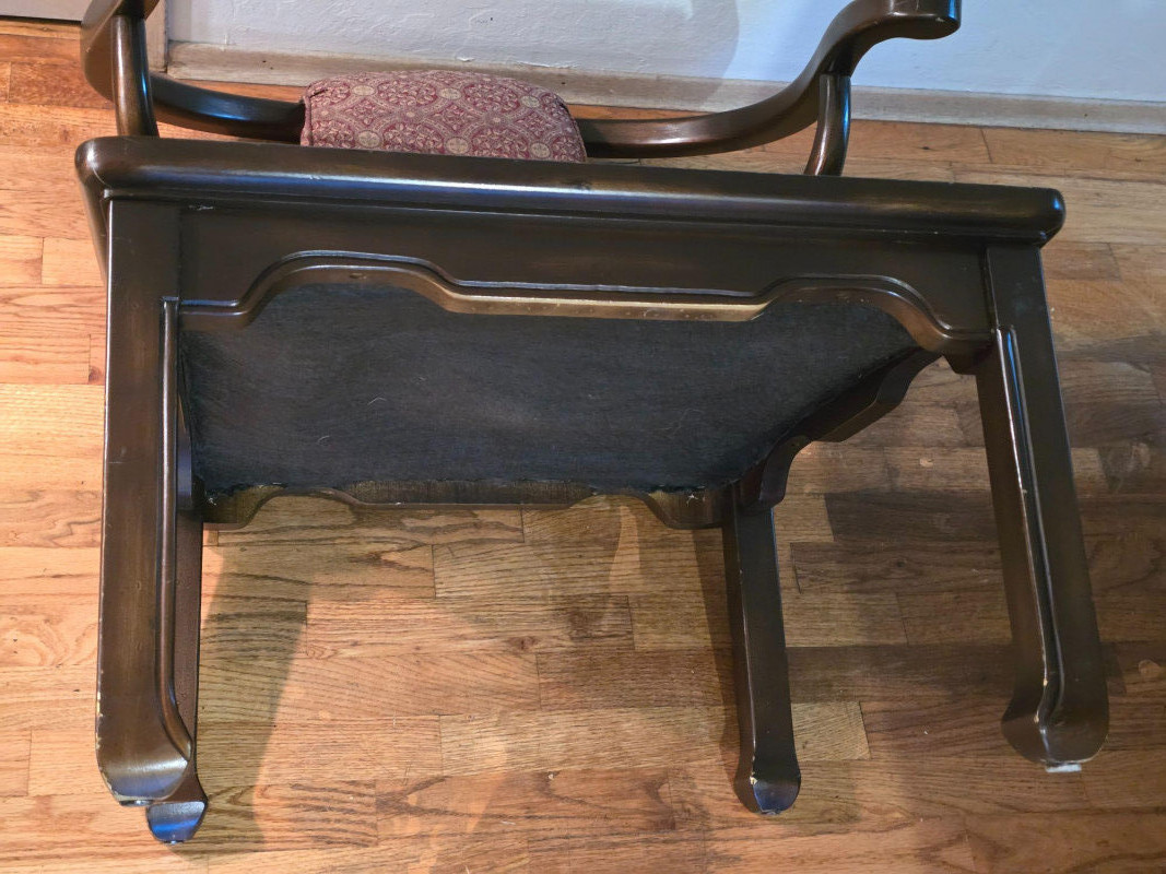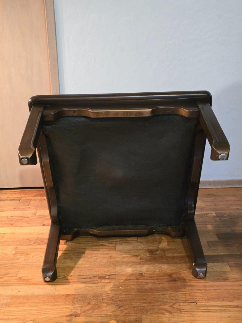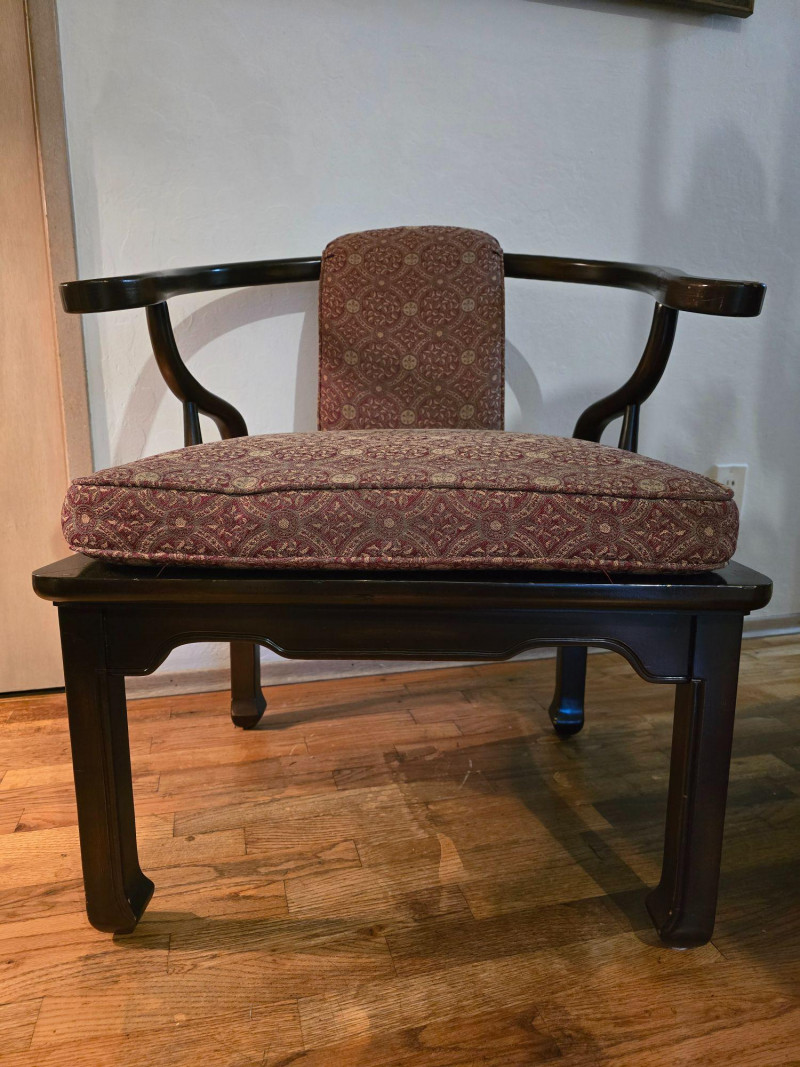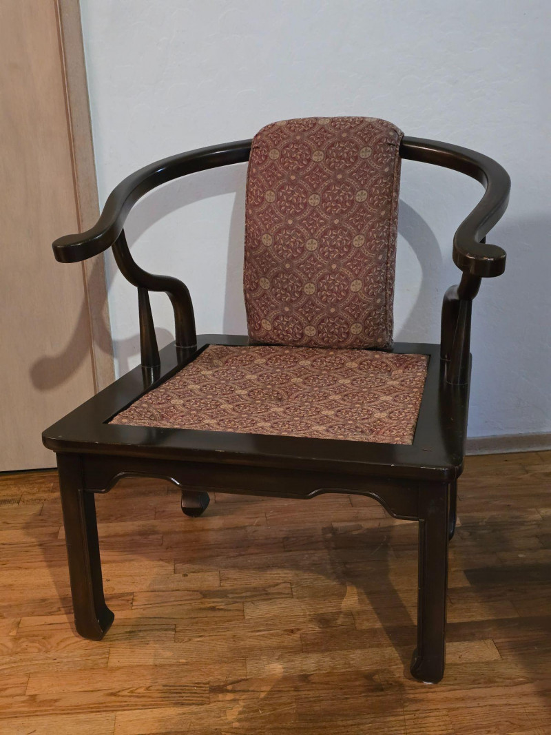 A classic mid‑century traditional armchair featuring a warm stained hardwood frame, gently curved arms, and a tailored upholstered seat and back. This style emerged in the 1950s–1970s as American makers blended earlier colonial revival silhouettes with the cleaner, simplified lines of the mid‑century era. The result is a versatile, comfortable accent chair that works beautifully in living rooms, reading corners, offices, and vintage‑inspired interiors. Era & Style Highlights: Mid‑Century Traditional / Transitional design Influences of Colonial Revival and early American forms Curved arms and legs typical of mid‑century domestic furniture Upholstered seat and back in a patterned woven fabric Warm wood tone consistent with 1950s–1970s home furnishings Details: Solid wood frame with graceful arm curvature Upholstered back and seat for comfortable support Stable, well‑balanced construction Attractive profile from all viewing angles Condition: