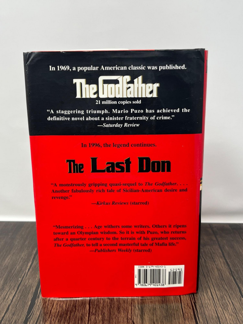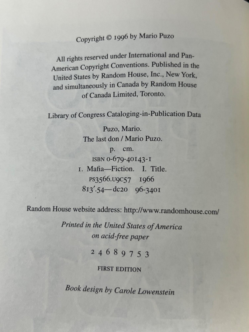 Hardcover first edition of The Last Don by Mario Puzo, published by Random House in 1996. Classic red, black, and yellow jacket design with bold typography. Copyright page clearly states FIRST EDITION with full number line present. Binding remains strong; pages are clean and printed on acid‑free paper. Jacket shows light handling wear consistent with age. Puzo’s sweeping Mafia novel—his first major work after The Godfather—remains a cornerstone for collectors of modern American fiction and crime literature. Details: Author: Mario Puzo Title: The Last Don Publisher: Random House Year: 1996 Edition: First Edition ISBN: 0‑679‑44274‑3 Format: Hardcover with dust jacket Condition: Light shelf wear to jacket; interior clean; tight binding Notes: Includes original publication data, full number line, and first edition statement.