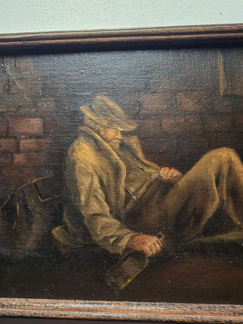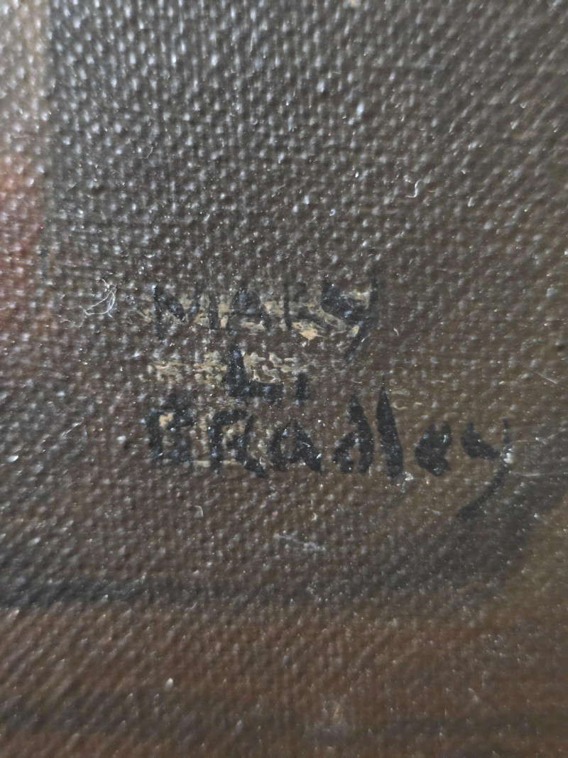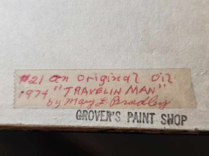 Original 1974 oil painting titled Travelin Man by artist Mary L. Bradley. The work presents no strong period character and remains in great vintage condition. Artist: Mary L. Bradley